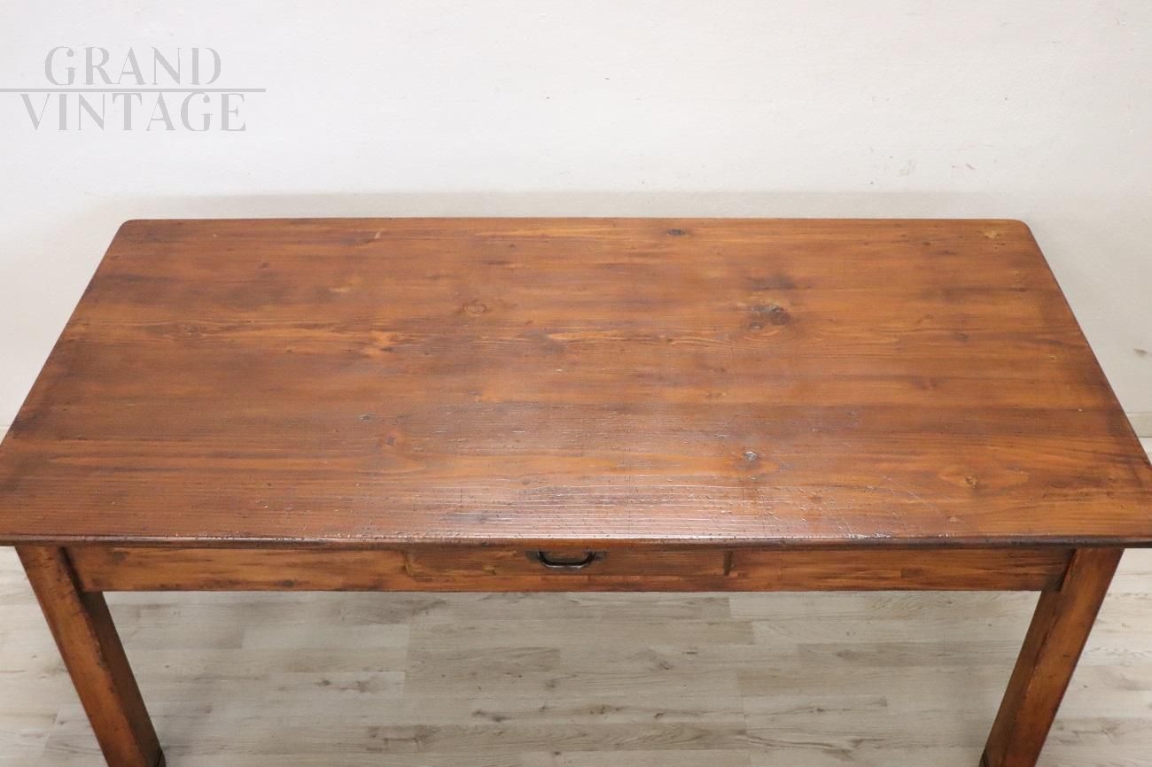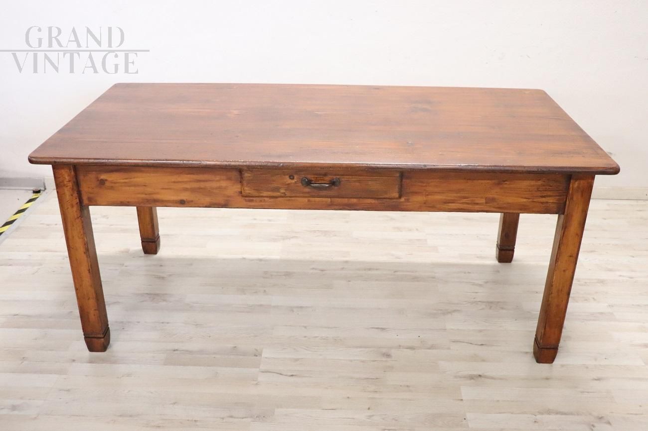 We present this good-sized rustic Italian table, made in the 20th century from solid fir wood. Simple and linear, it is completed by a useful front drawer, which makes it functional. The spacious tabletop offers ample space for a variety of uses: as a dining table, as a kitchen worktop or as a large desk. The light wood tone makes it easily coordinated with various colors and furnishing styles, its rustic appearance makes it perfect for a mountain or country house. Restored in our laboratories with a professional and conservative approach, it is ready to be placed in the home. Price negotiable.