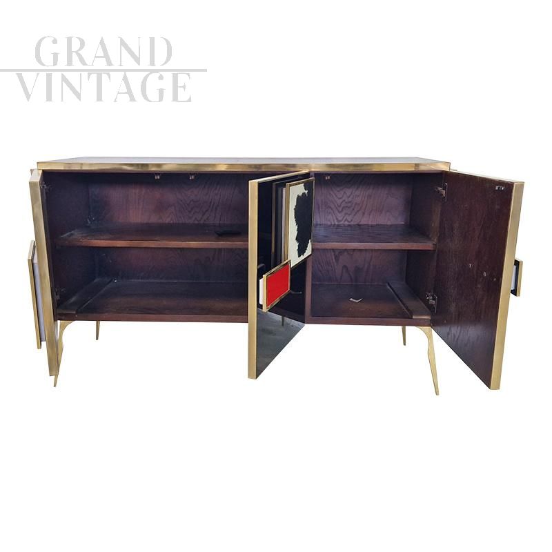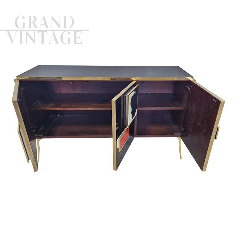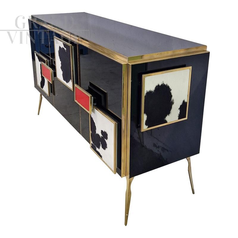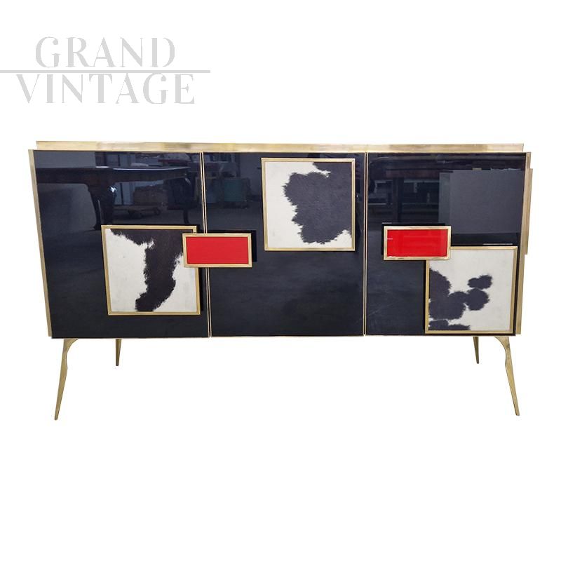 Three-door sideboard entirely handmade, with wooden structure covered in black glass and with black and white pony details, red glass handles, golden brass profiles and feet, internal shelf.