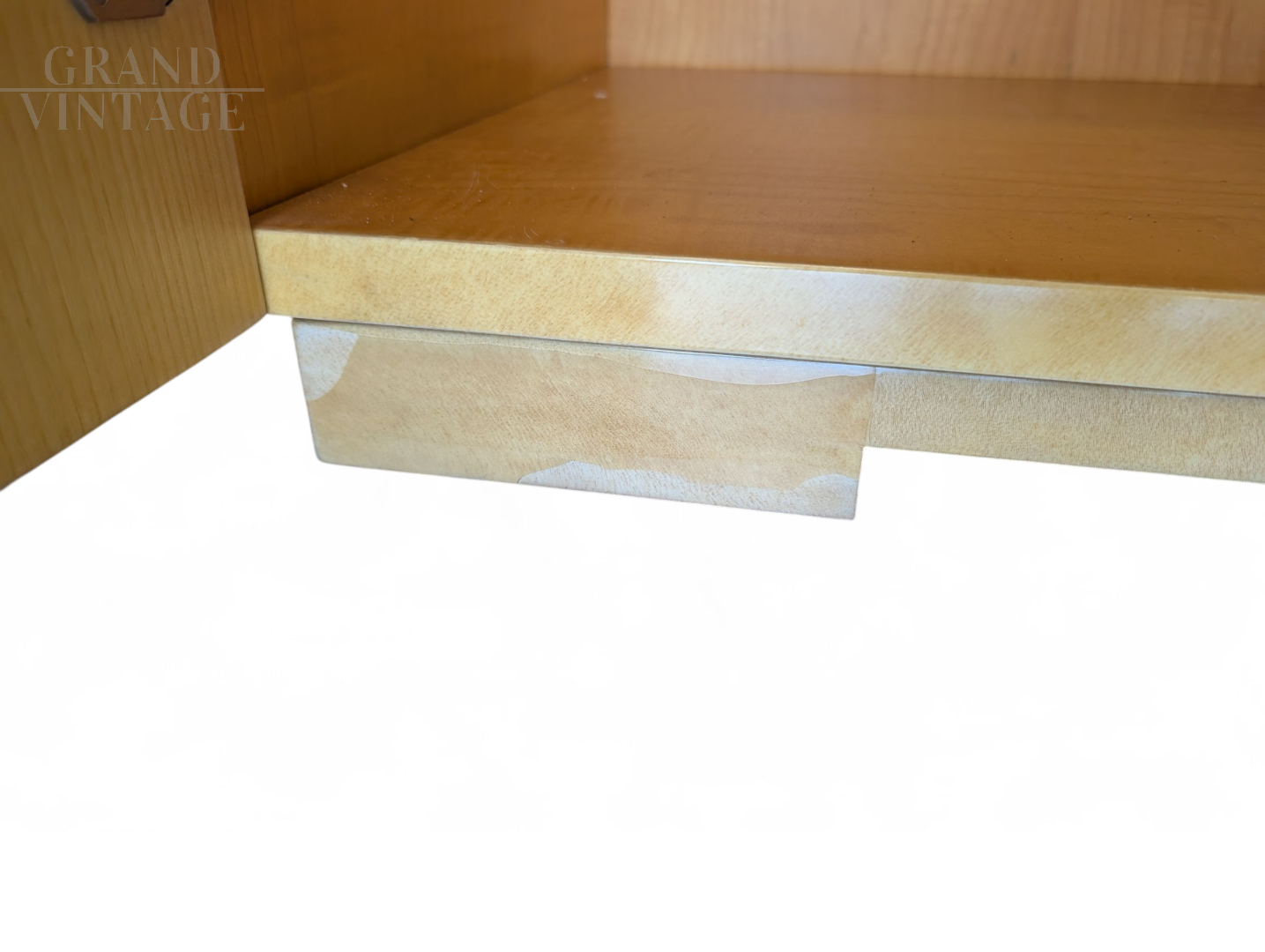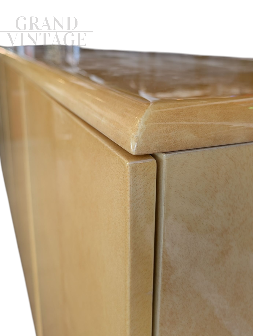 This elegant four-door sideboard stands out for its glossy lacquer finish in a warm golden/honey hue, which elegantly reflects the light, recalling the refined finishes (such as parchment) beloved by Aldo Tura. The design is linear and monolithic, with no external handles to enhance the purity of the form. Internally, the piece is functional, with light wood compartments (maple/birch) and clear glass shelves. It is a sculptural piece of fine Italian craftsmanship, perfect for a luxurious and distinctive mid-century decor. It shows light signs of wear on the base. These signs do not detract from the beauty of the piece but rather highlight its uniqueness. Dimensions: 76 x 209 x 50 cm (height, width, depth)
