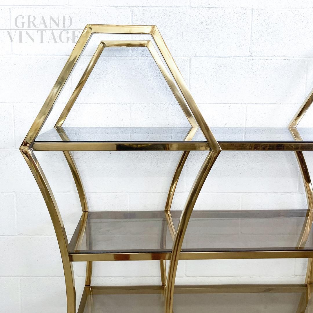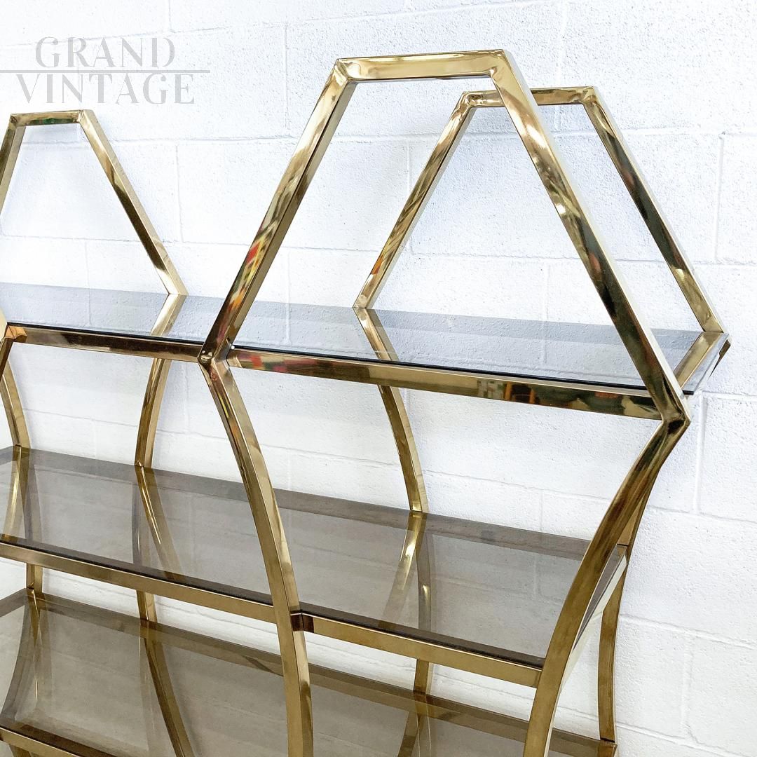 Elegant design bookcase in square-section golden brass tubing with 4 smoked glass shelves.
