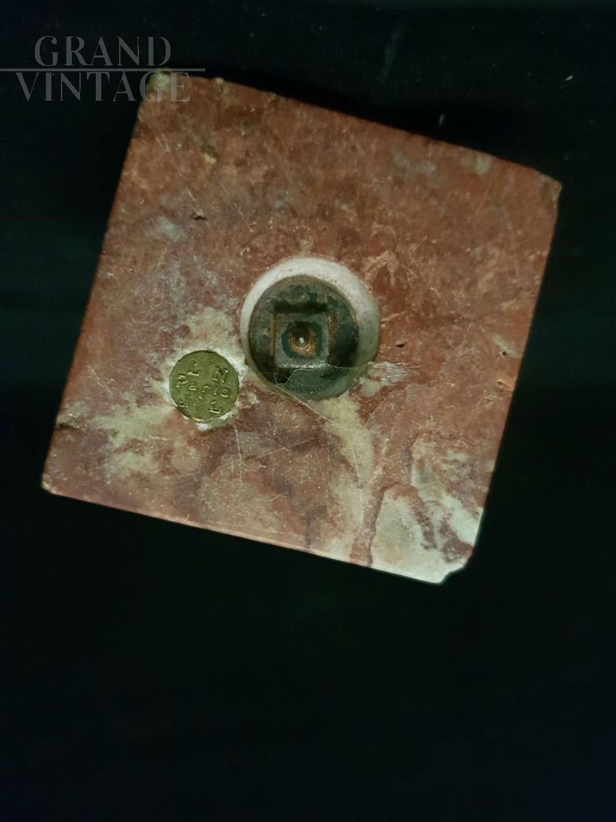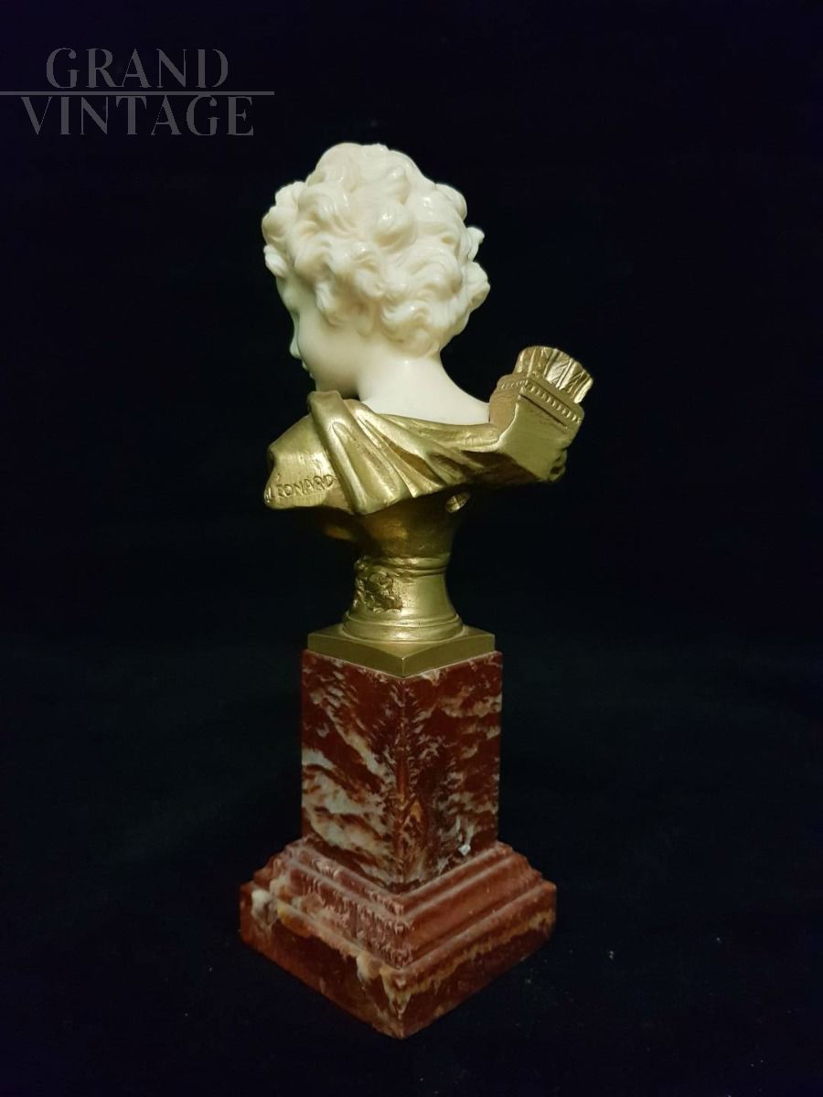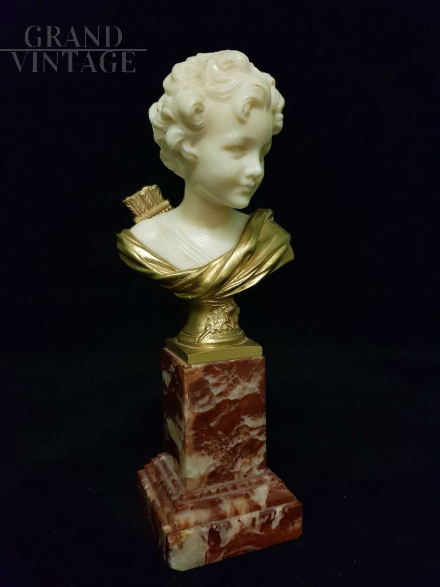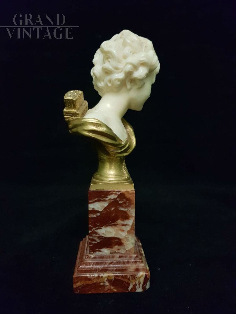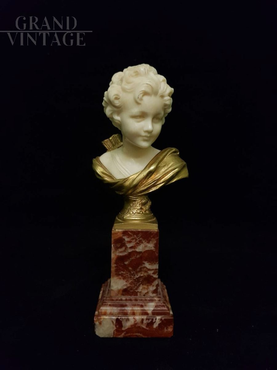 Agathon Leonard, France, (circa 1910): refined chryselephantine sculpture representing a child's head in gilded bronze and ivory, on a marble base.
