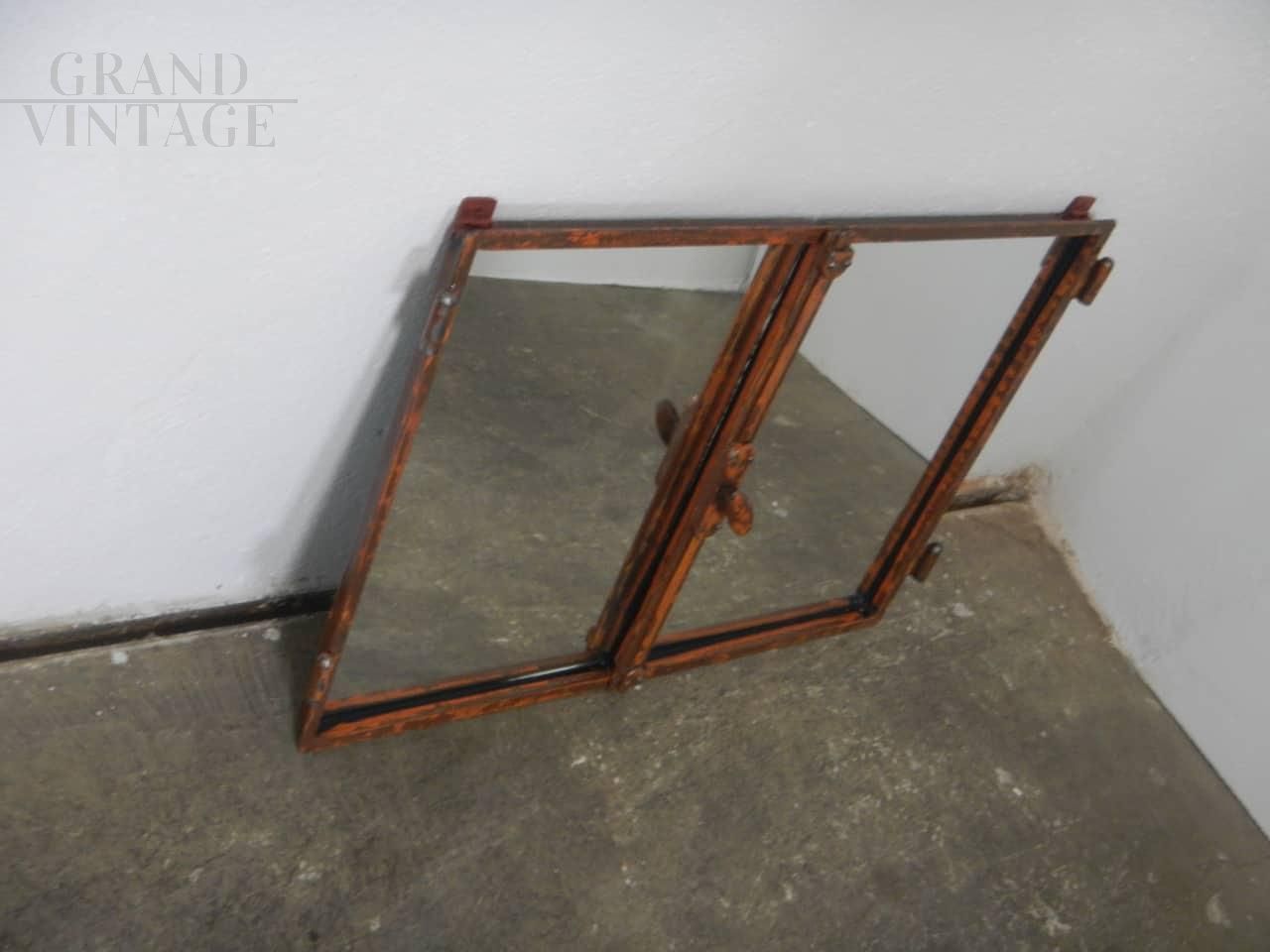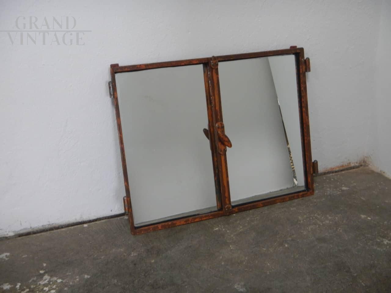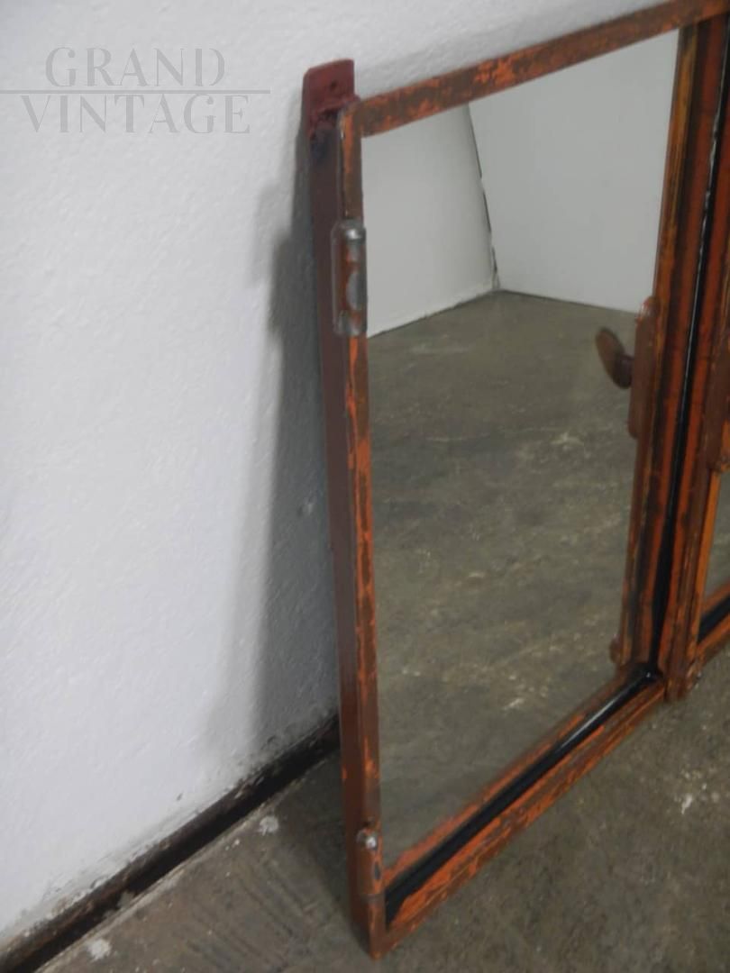 Iron window mirror with handle, in a magnificent industrial style. The iron has been cleaned and treated with varnish. Equipped with hooks for hanging.