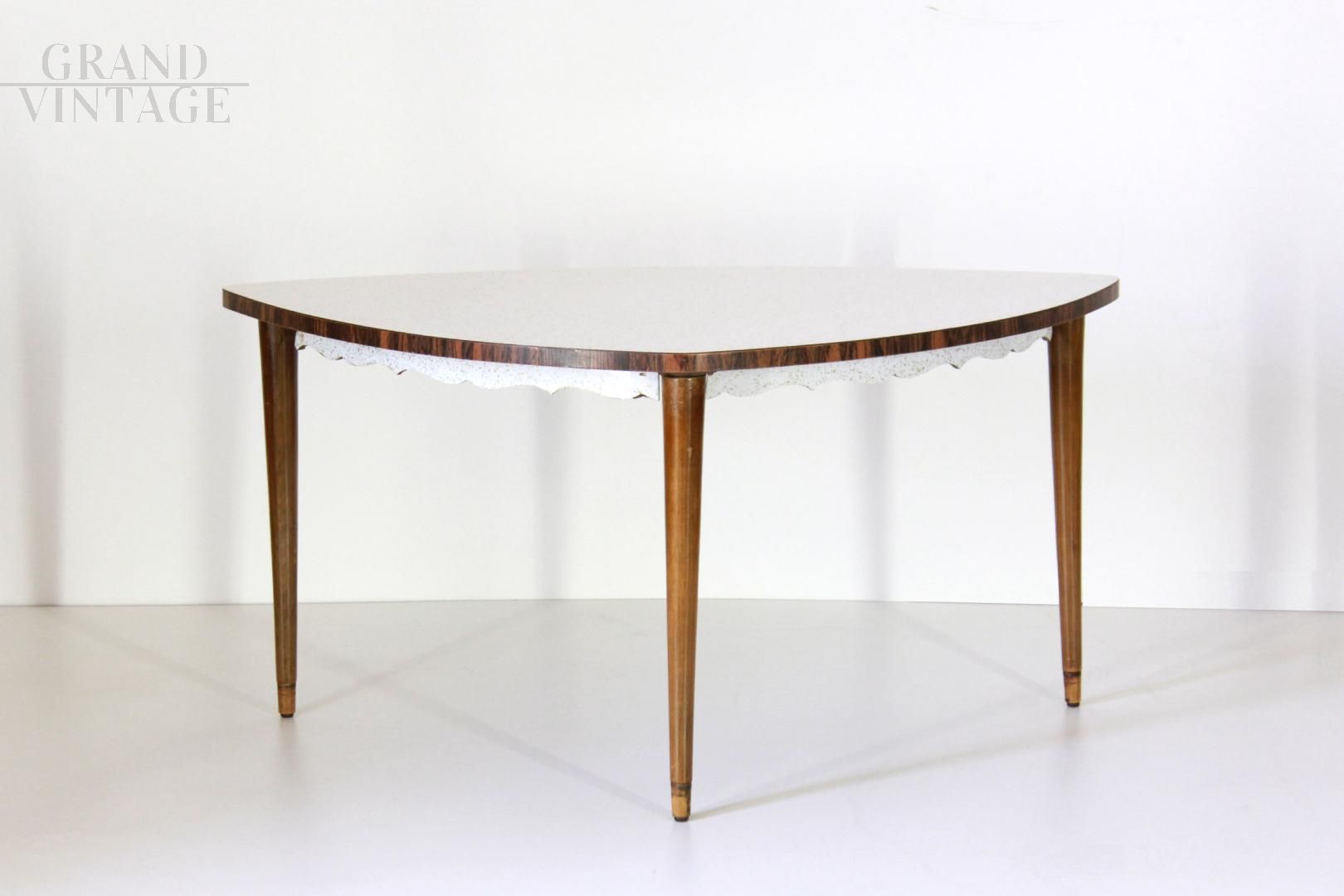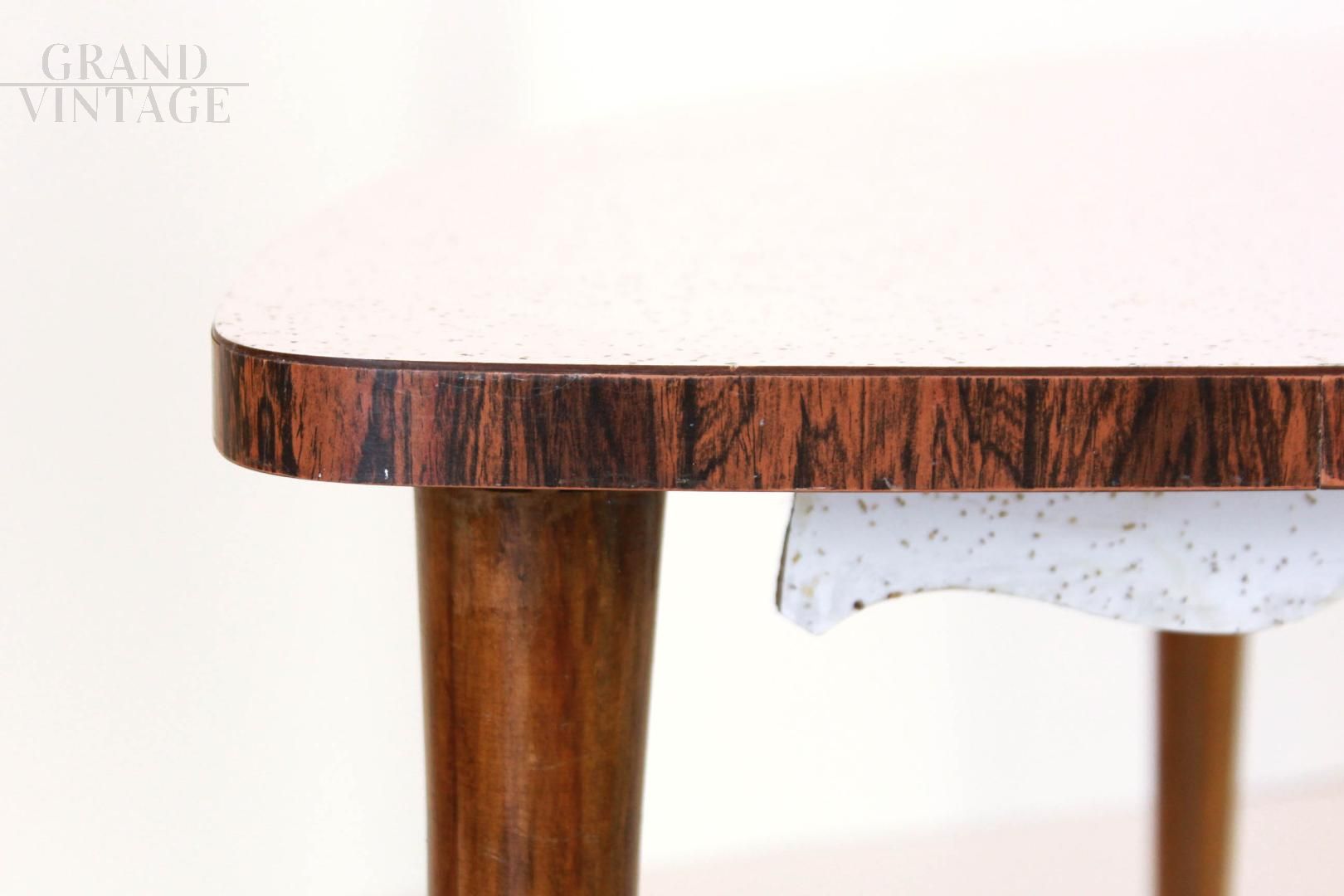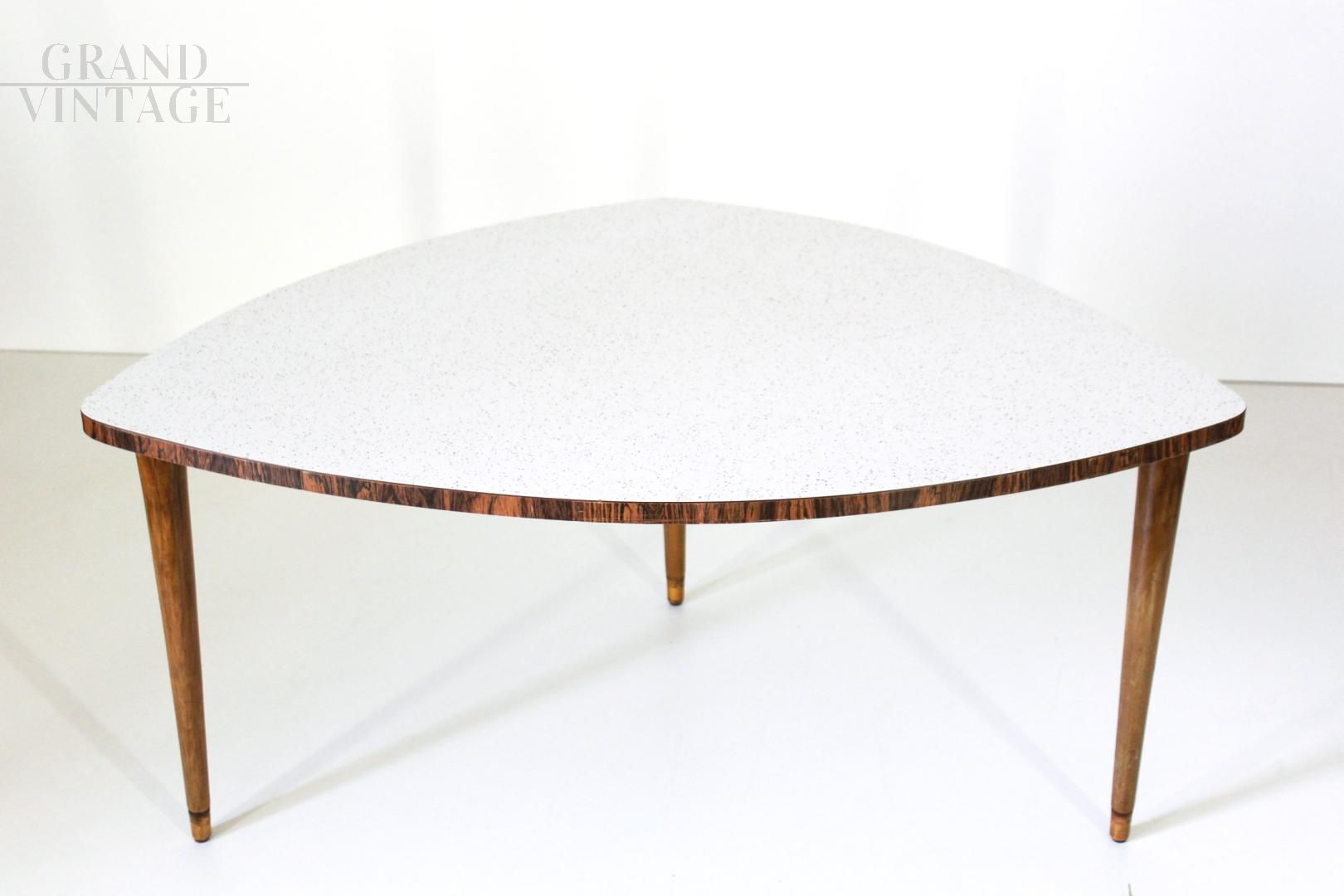 Coffee table from the 1950s with white formica top with small light brown patterns and solid wood structure. Clean and polished, the item is in good condition with small signs of aging.