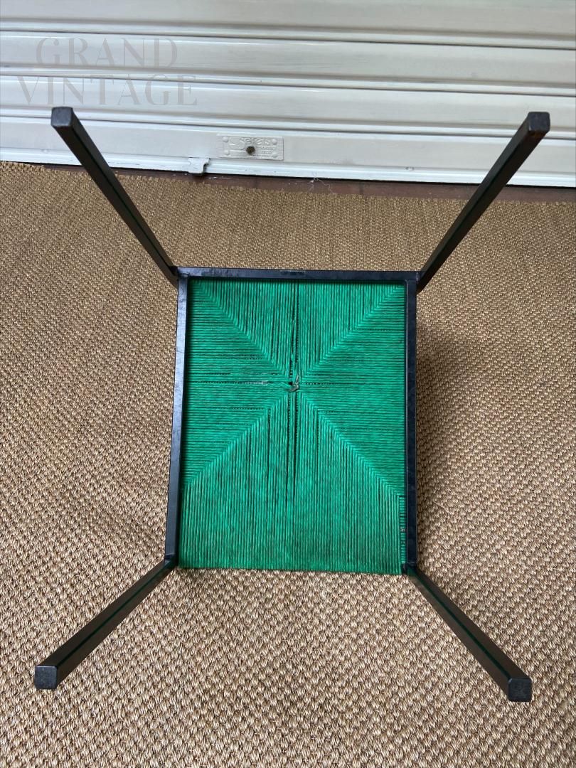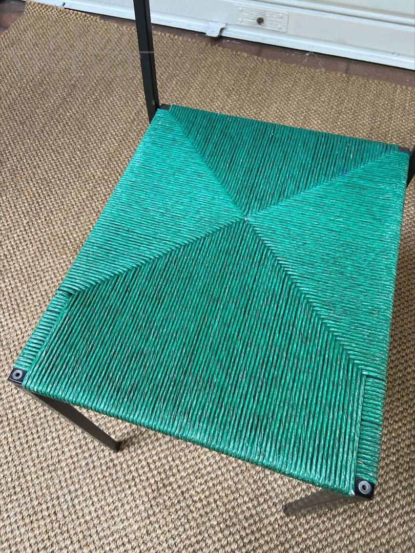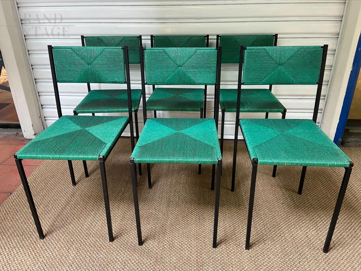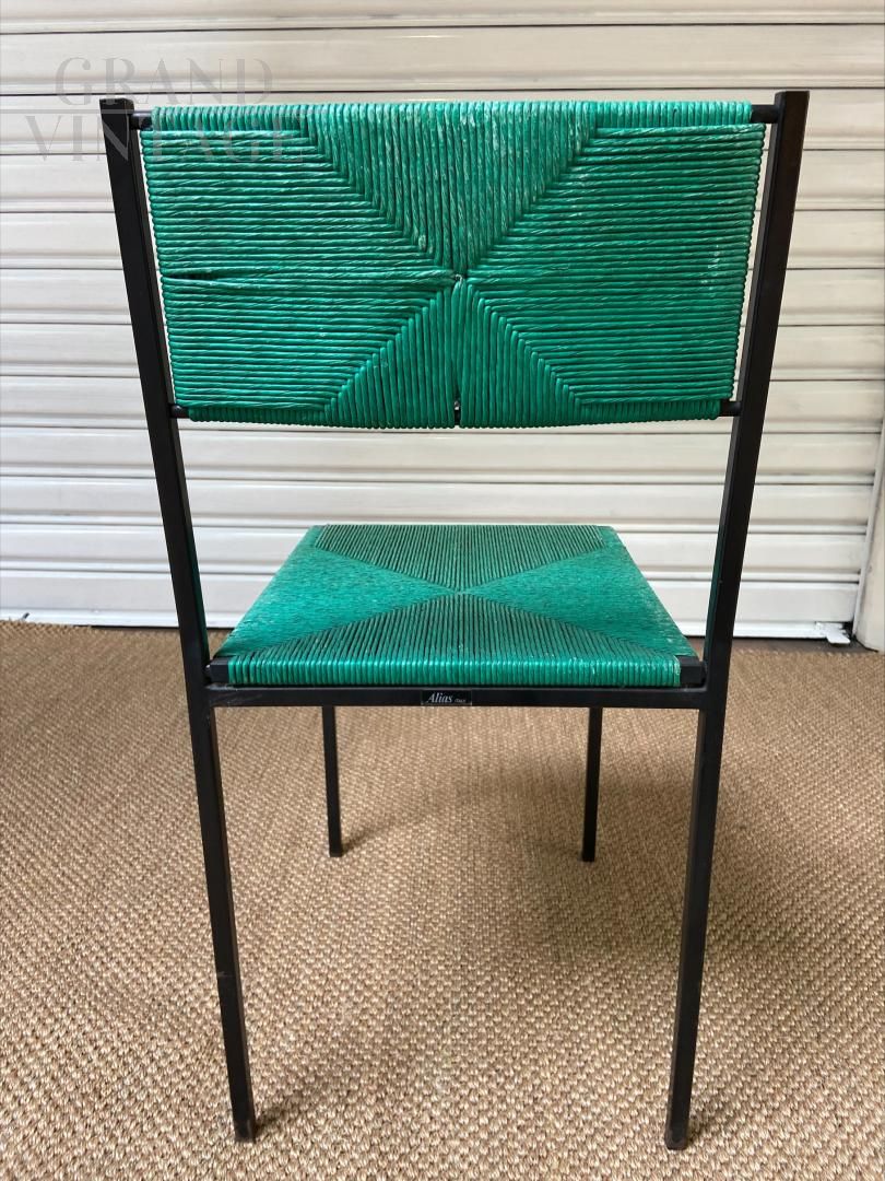 Set of 6 Paludis 150 model chairs by Giandomenico Belloti for Alias, first edition of 1950 in green color, with black lacquered steel structure and seat and back in green papier-mâché on metal cables.
