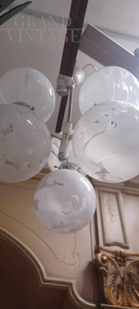 6 lights Murano glass chandelier by Carlo Nason for Mazzega, 70s, milky colour, chromed structure with chromed parts and white lacquered parts. The state of conservation is very good, the effect once lit is beautiful.