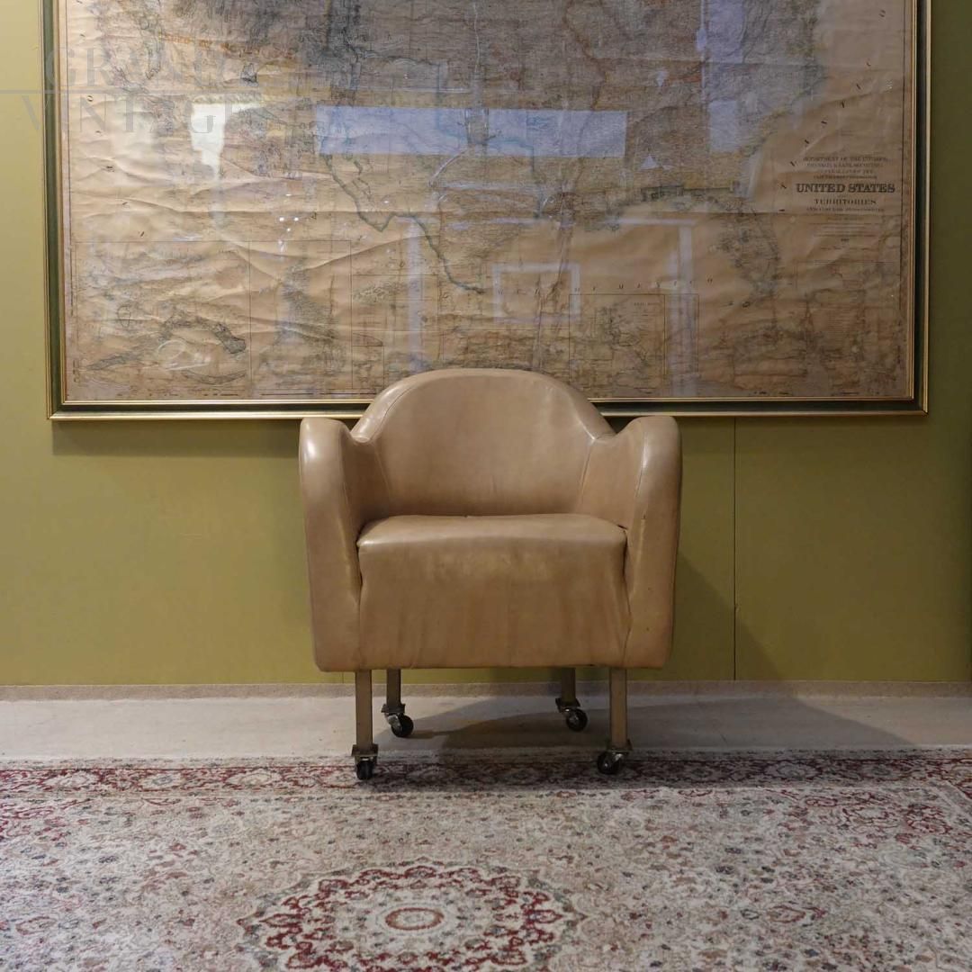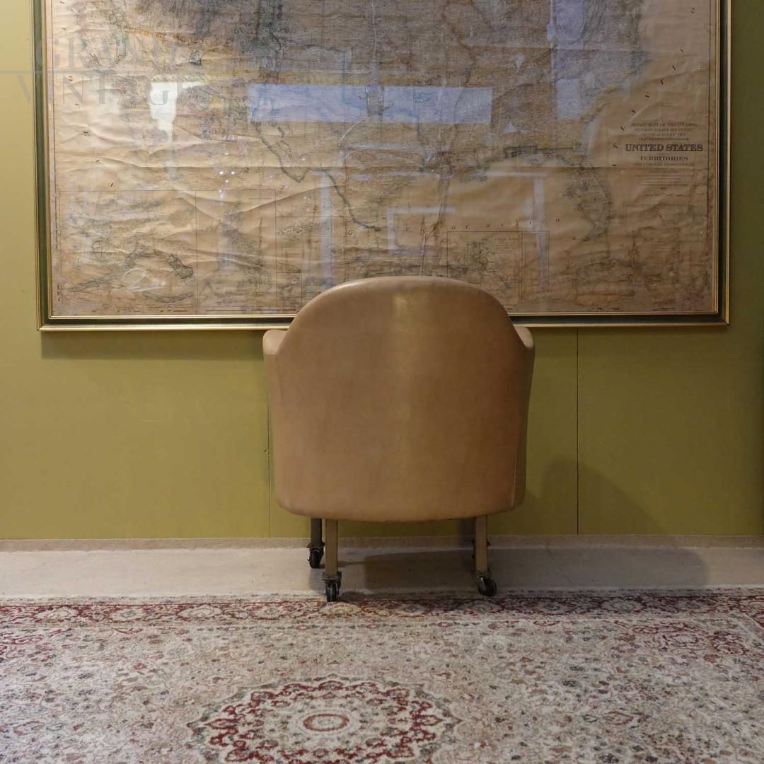 Practical 60s armchair with wheels, with an essential and functional design. Characterized by clean lines and resistant materials, it is perfect for offices, studios or dynamic environments where comfort and flexibility meet with vintage style.