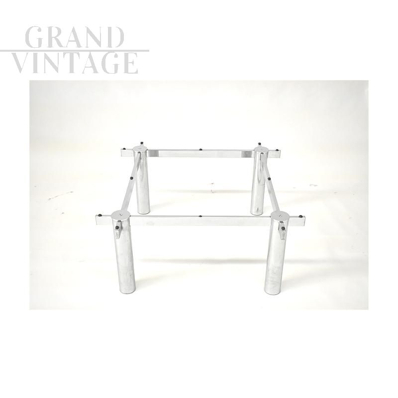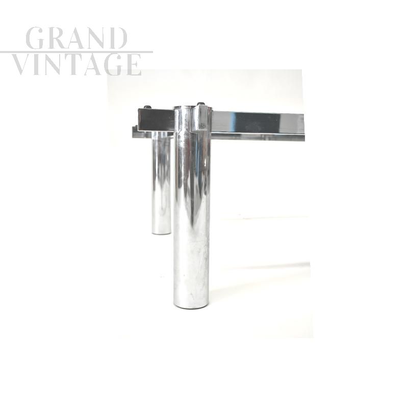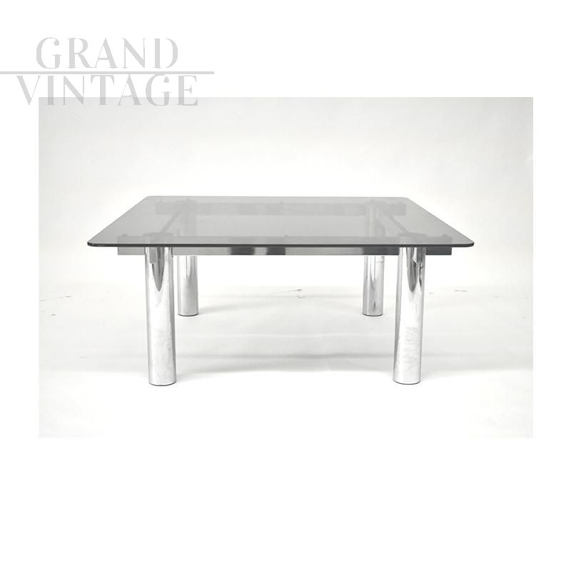 Vintage coffee table from the 1970s, Italian manufacture. The coffee table has a square structure with chromed steel frame and smoked glass top.