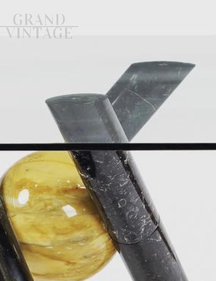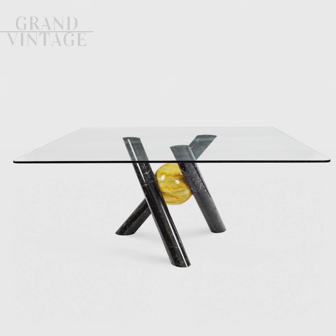 70's dining table with beautiful black marquina marble base and central sphere in yellow Siena marble, 2 cm thick glass top.
