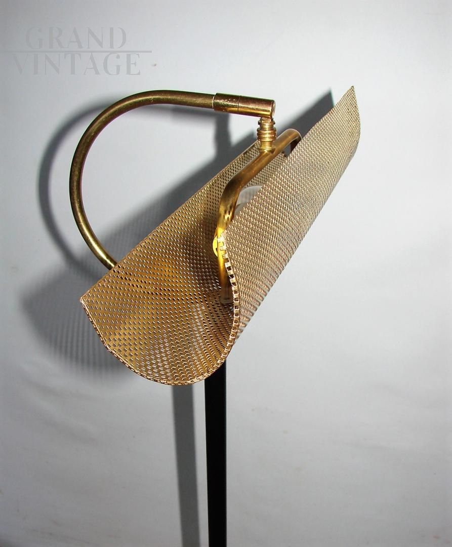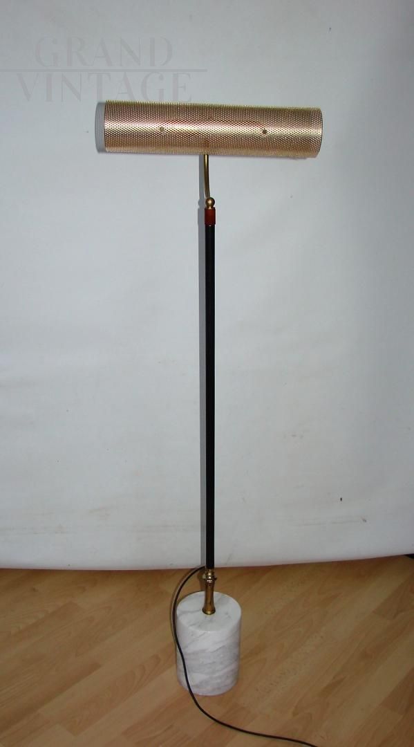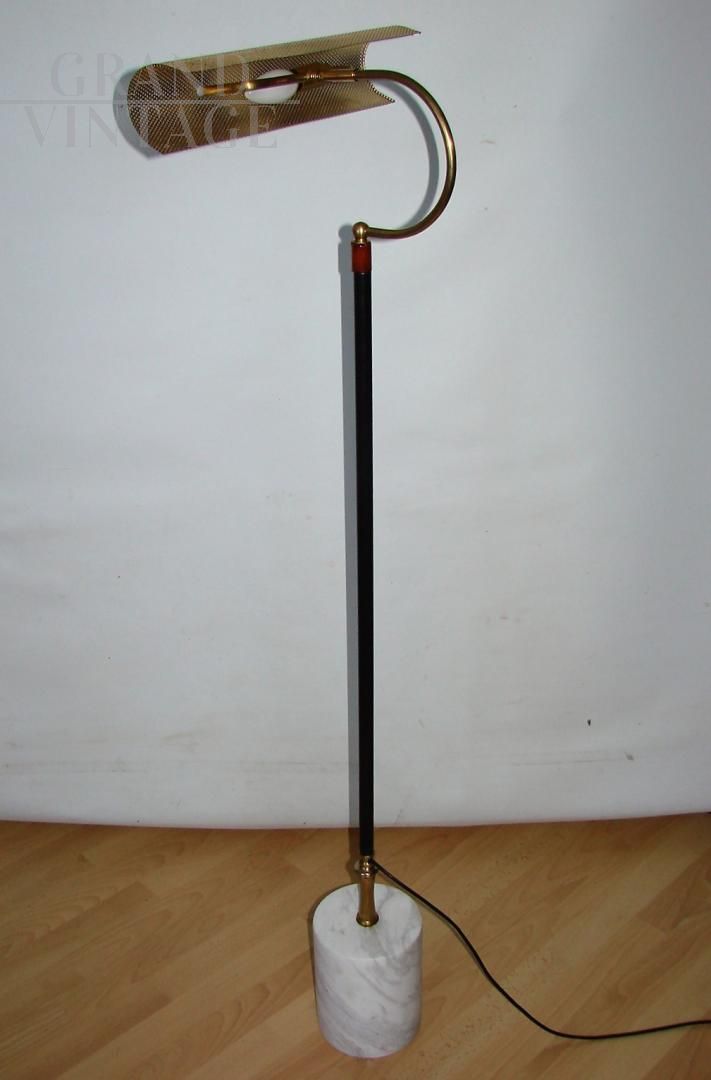 Vintage 70s floor lamp with brass and metal structure and cylindrical marble base. The lamp requires an E14 bulb.