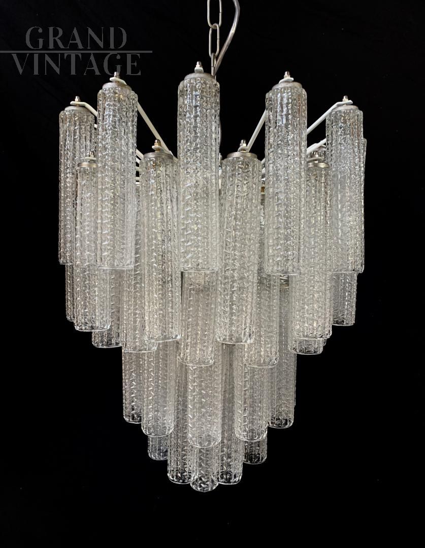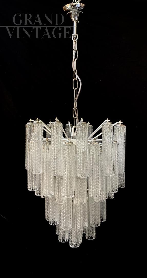 Fantastic chandelier from the 1970s, all original and with redone electrical system. Attributed to the Venini company, uncracked glass. Note the beautiful and famous tubes inserted in this elegant chandelier. Transparent crystal color. Of course it has the signs of aging. Dimensions: Height 60 cm, height with chain 100 cm, width 44 cm.