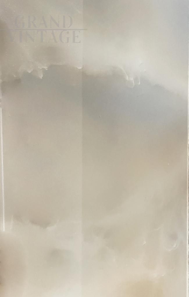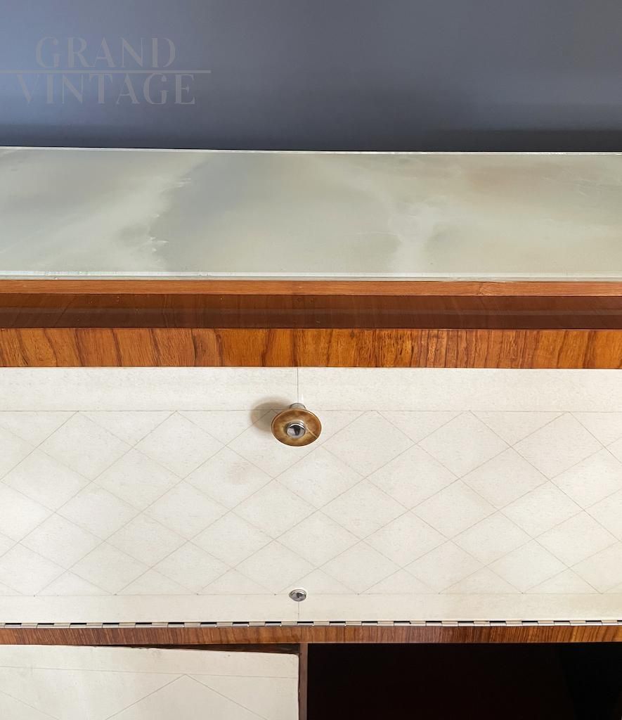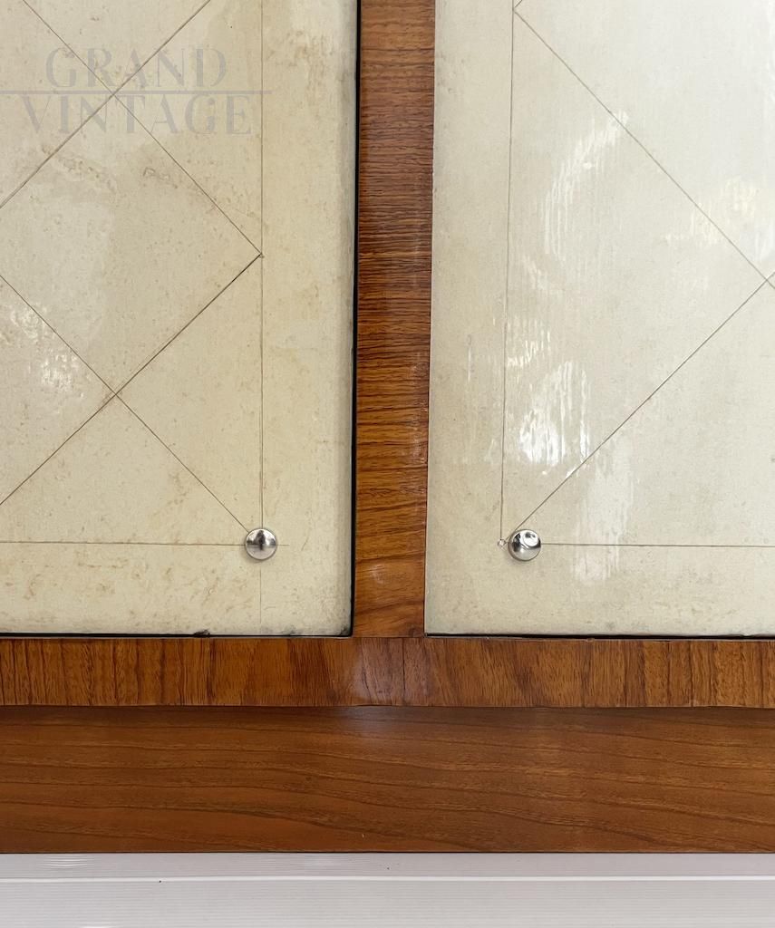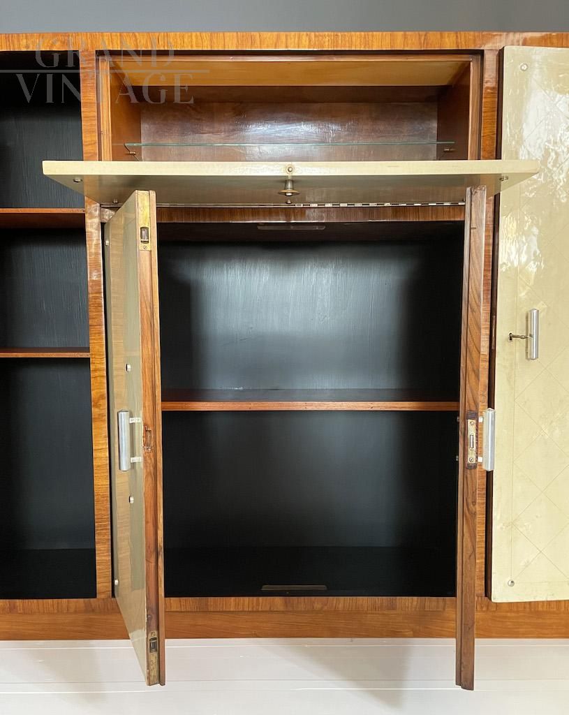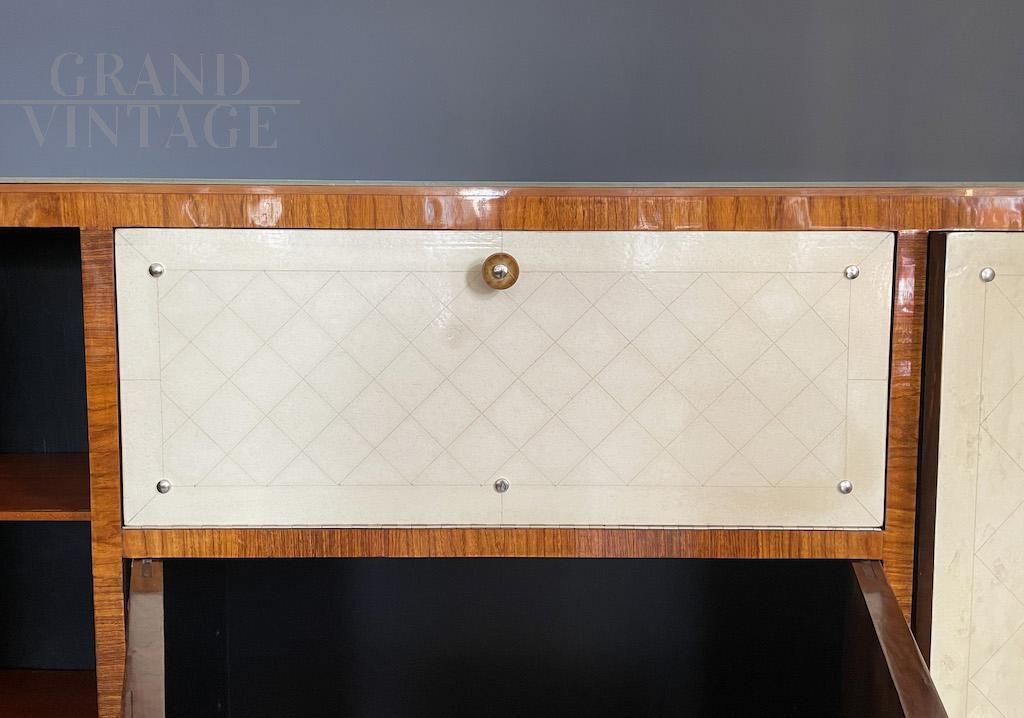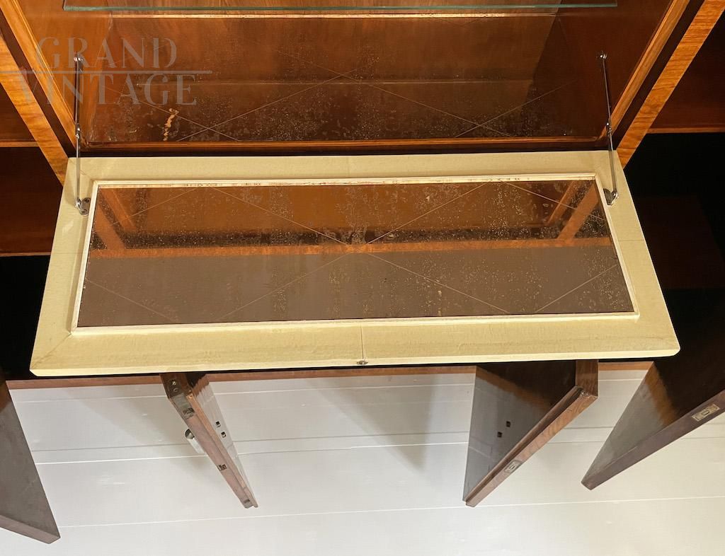 Particular original vintage Italian bar cabinet from the 70s with structure entirely in parchment and blond mahogany. Marbled glass top and steel details. Central mirrored interior with glass shelf.