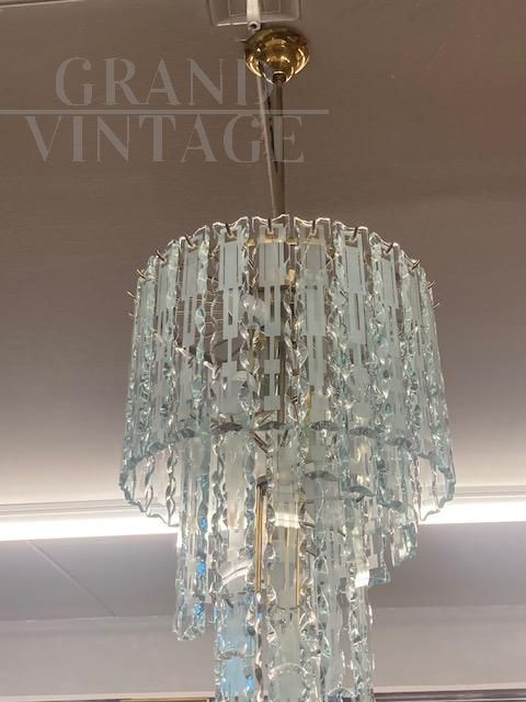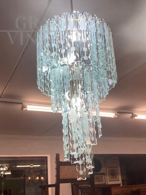 Vintage cascade chandelier with natural green and satin shaped glass plates, placed in a spiral on a chromed metal and brass structure, equipped with 5 light points.