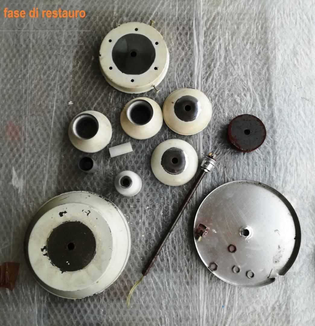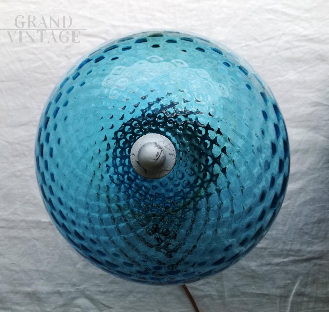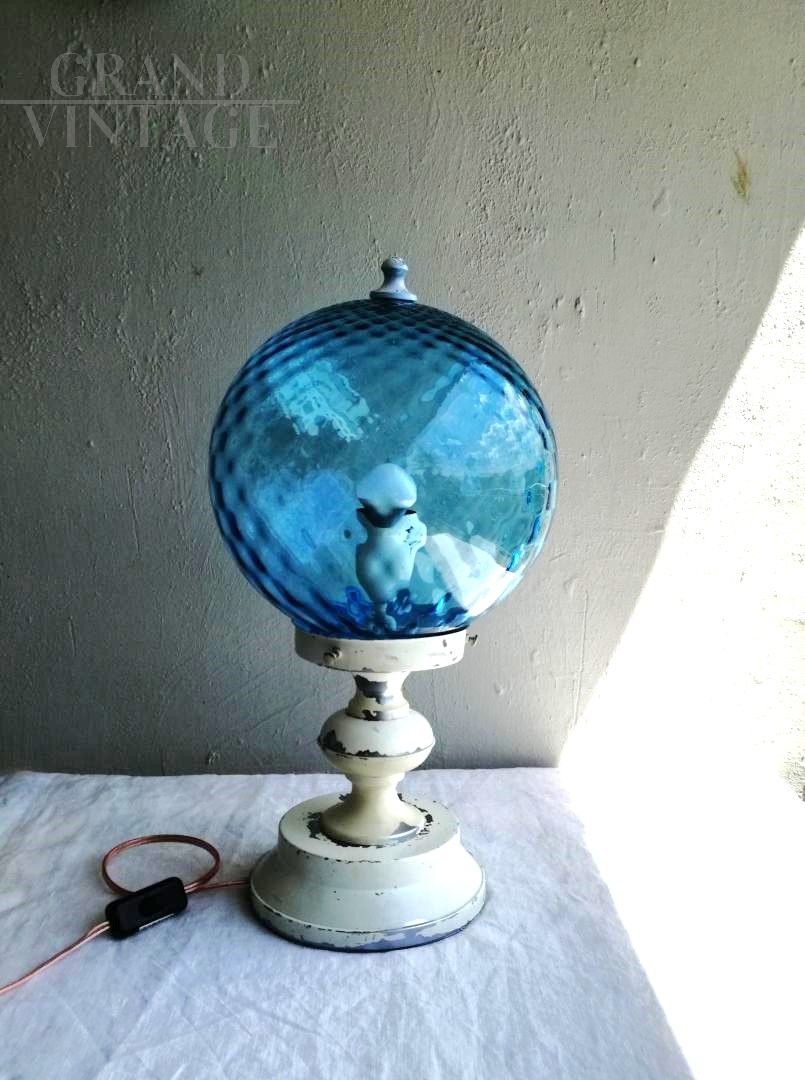 70s table lamp with a retro design in shabby chic or industrial style, base in ivory lacquered metal and a beautiful all-faceted sphere lampshade in light blue blown glass, which projects beautiful plays of light. The base, which may have originally been chrome and was later repainted in ivory, was deliberately left with the beautiful signs of aging, but could be repainted according to taste. The lamp was dismantled and cleaned, the electrical system rewired with a special electrical wire.