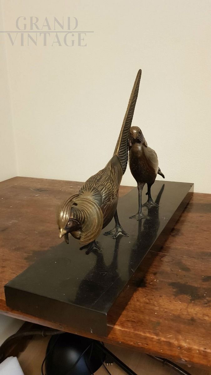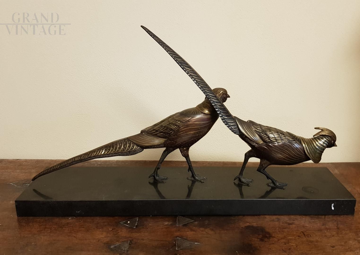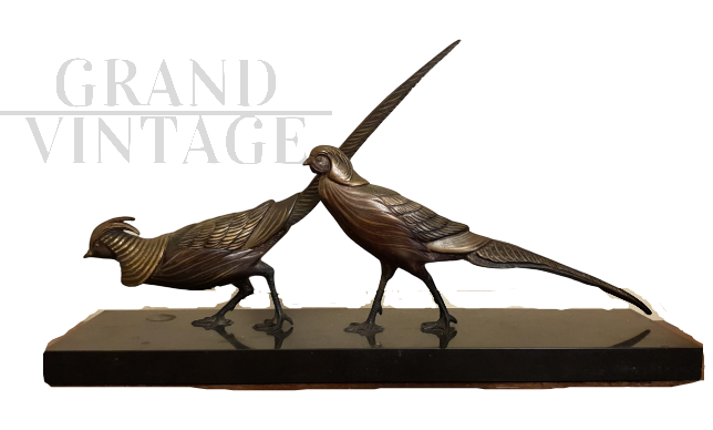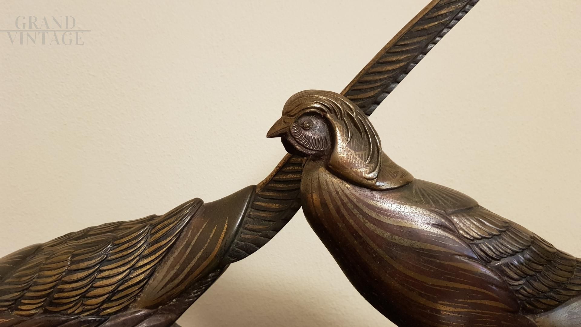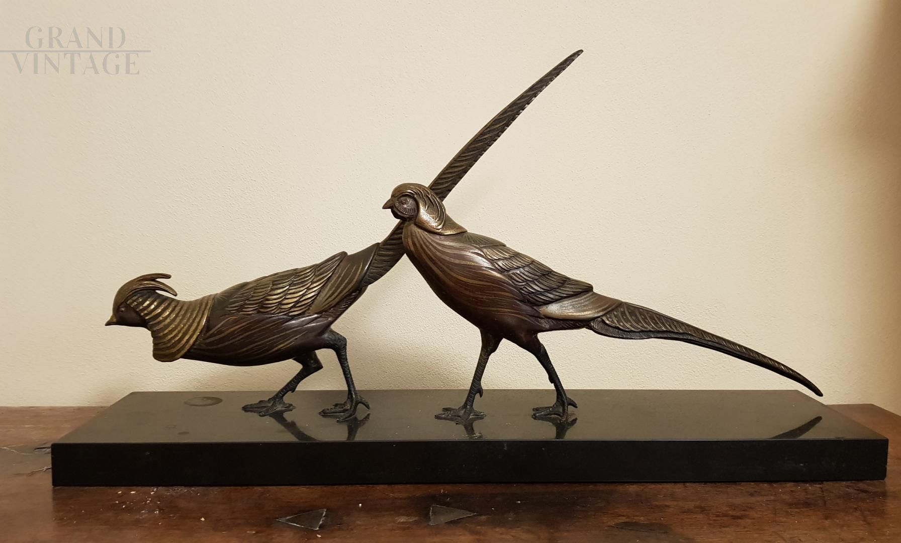 Bronze sculpture resting on a black marble base representing two birds.