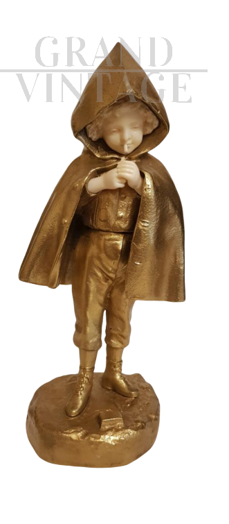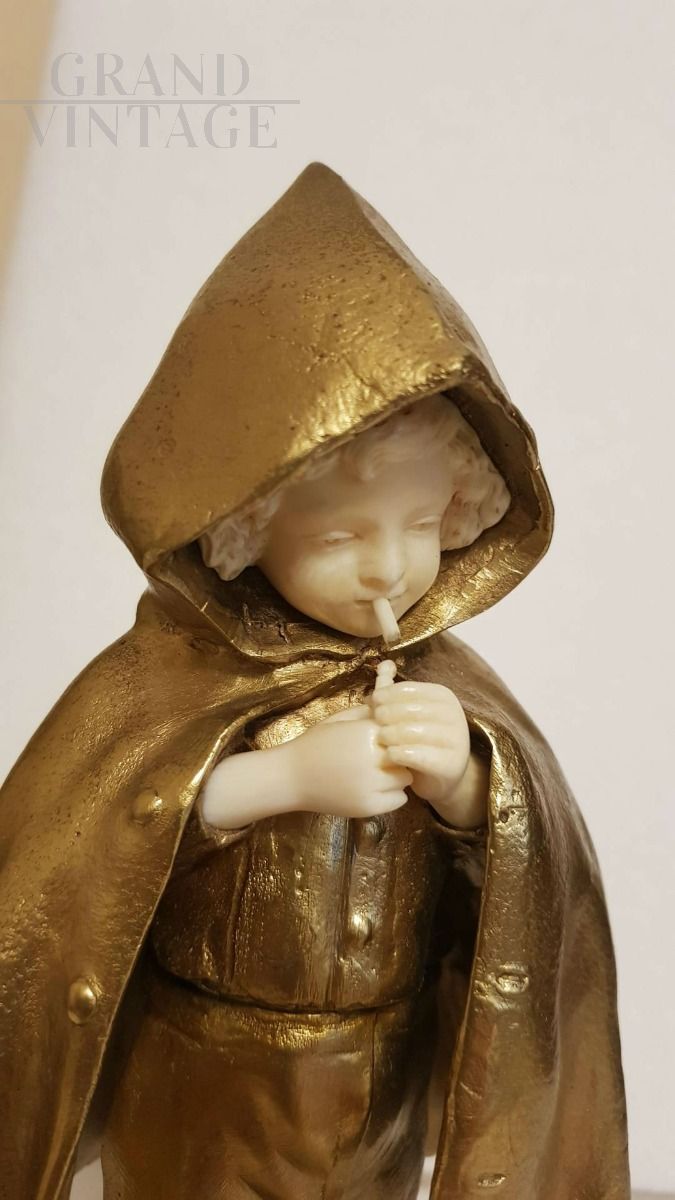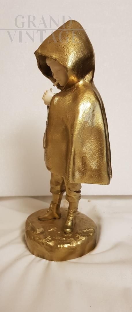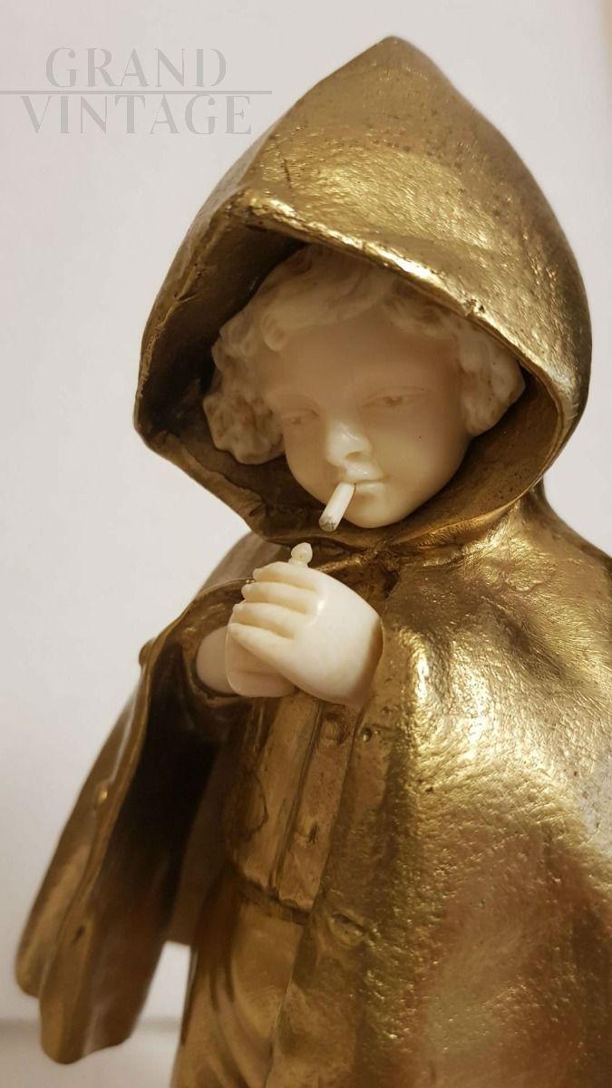 Sculpture in gilded bronze and ivory representing a smoking child with a hood.