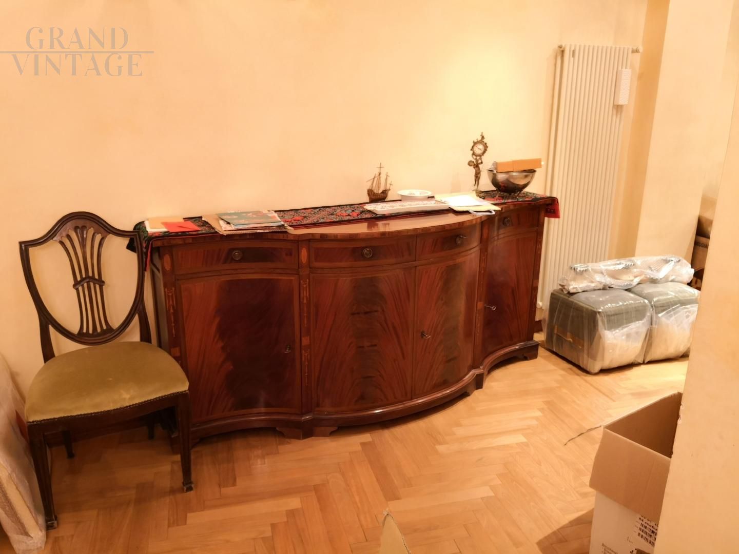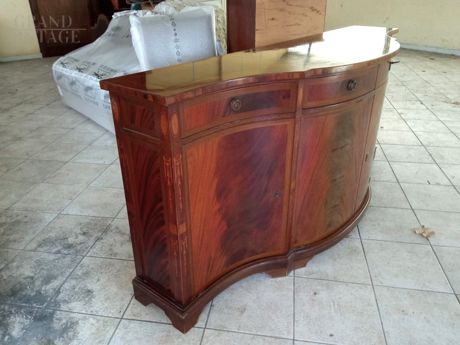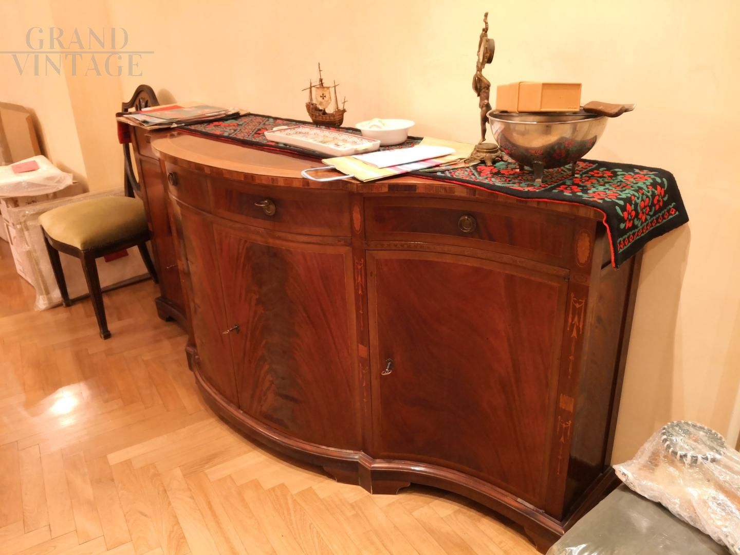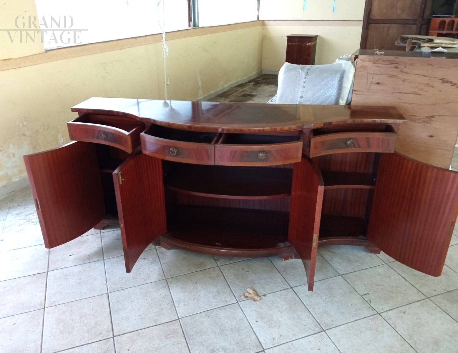 Elegant and sober antique style sideboard in inlaid wood, with wavy front, four doors and four drawers, from the late 70s - early 80s from an important Neapolitan furniture shop, in excellent condition.