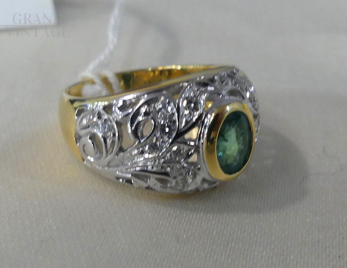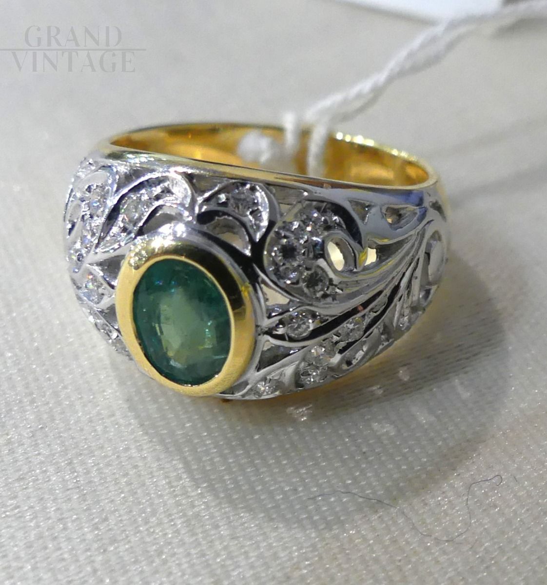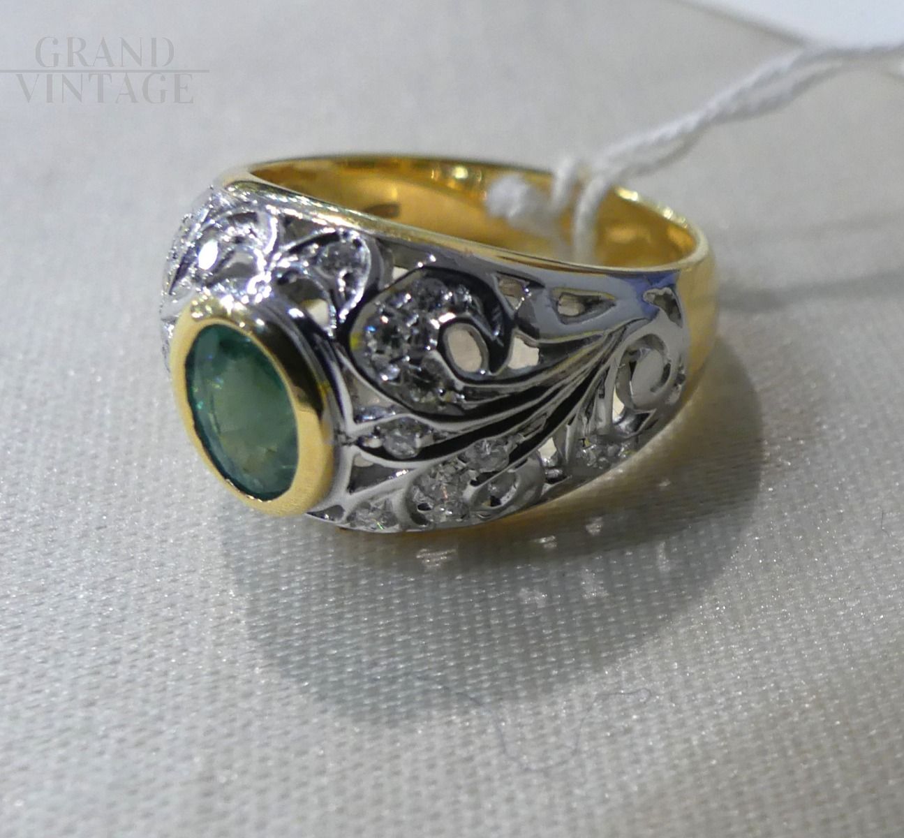 Vintage 1980s ring in 18 kt gold and white gold with 0.32 carat diamonds and central emerald. Gold weight: 8.30 grams. The ring is size 13, therefore it has a diameter of 1.68 cm.