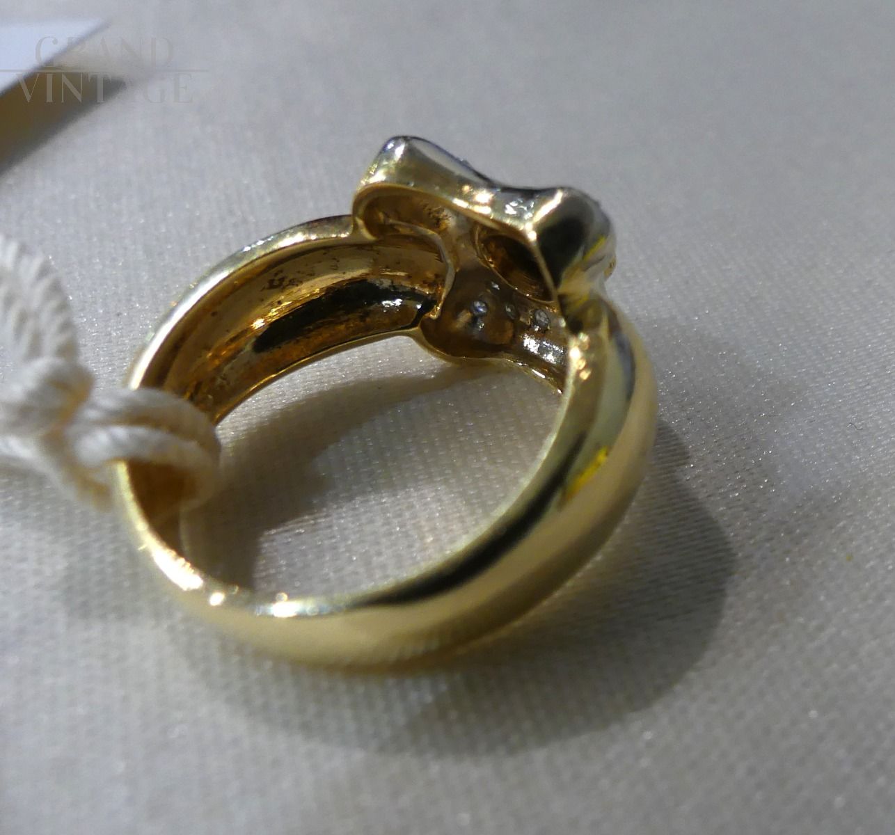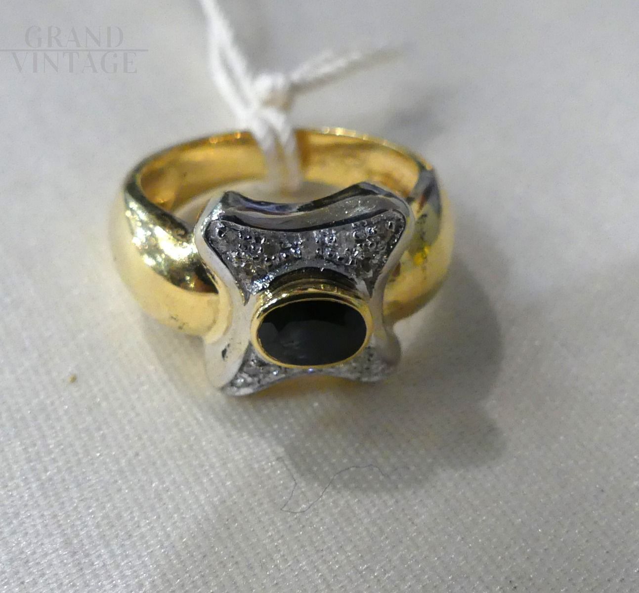 Vintage 1980s ring in 18 kt gold with 0.20 carat diamonds and 0.80 carat central sapphire. Gold weight: 7 grams. The ring is size 12, therefore it has a diameter of 1.65 cm.