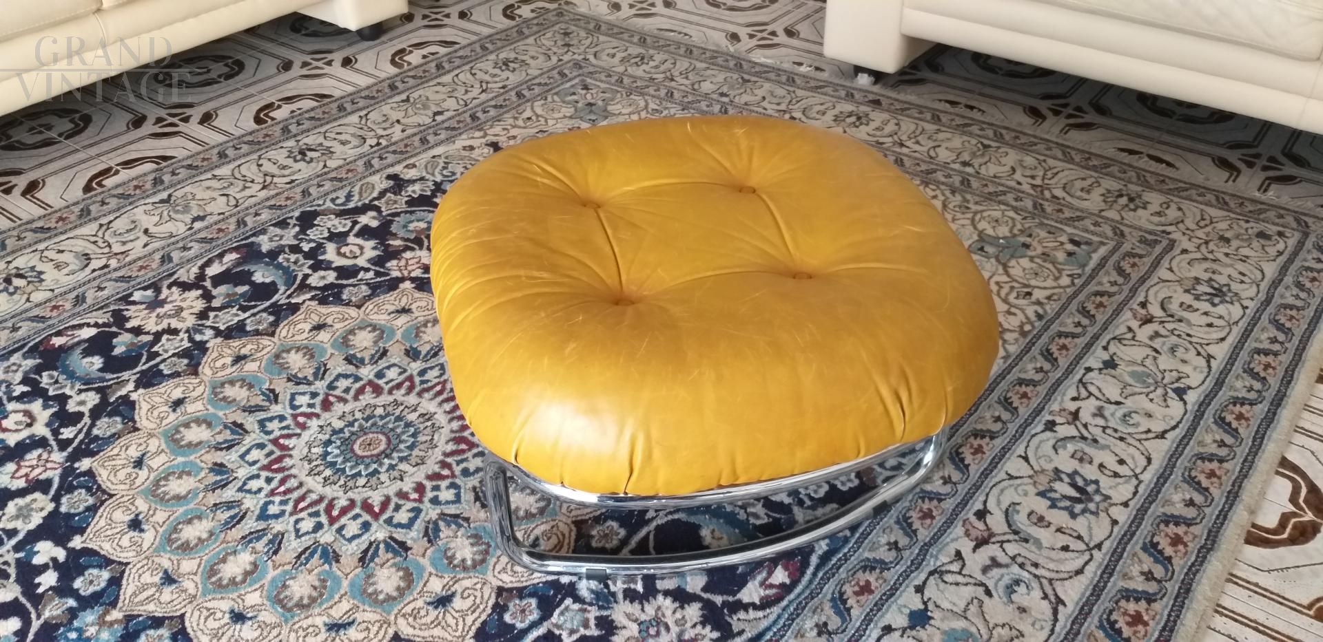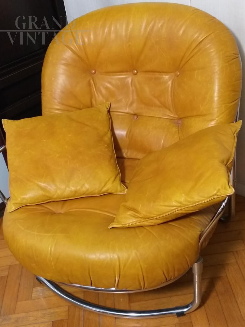 Beautiful armchair by Carlo de Carli for Cinova complete with ottoman and cushions, in cognac-colored leather and chromed metal structure.
