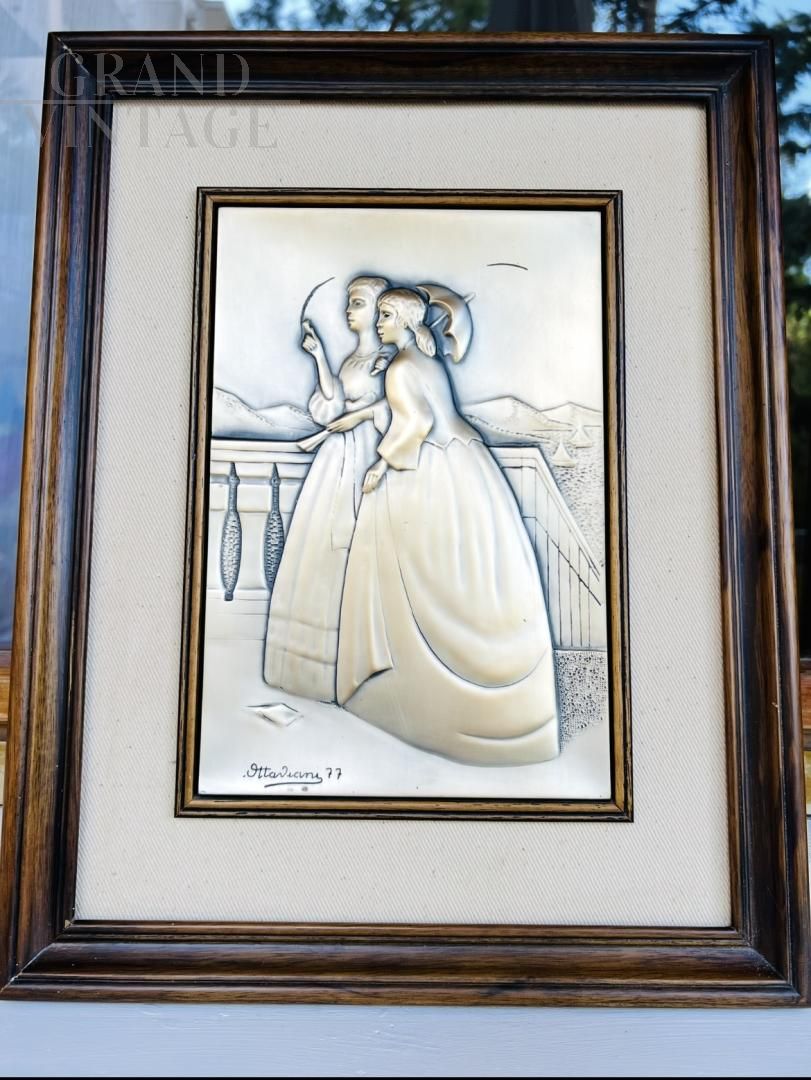 925 silver painting with bas-relief made by master Ottaviani and depicting two ladies with umbrella on a terrace by the sea, complete with wooden frame and white passepartout.