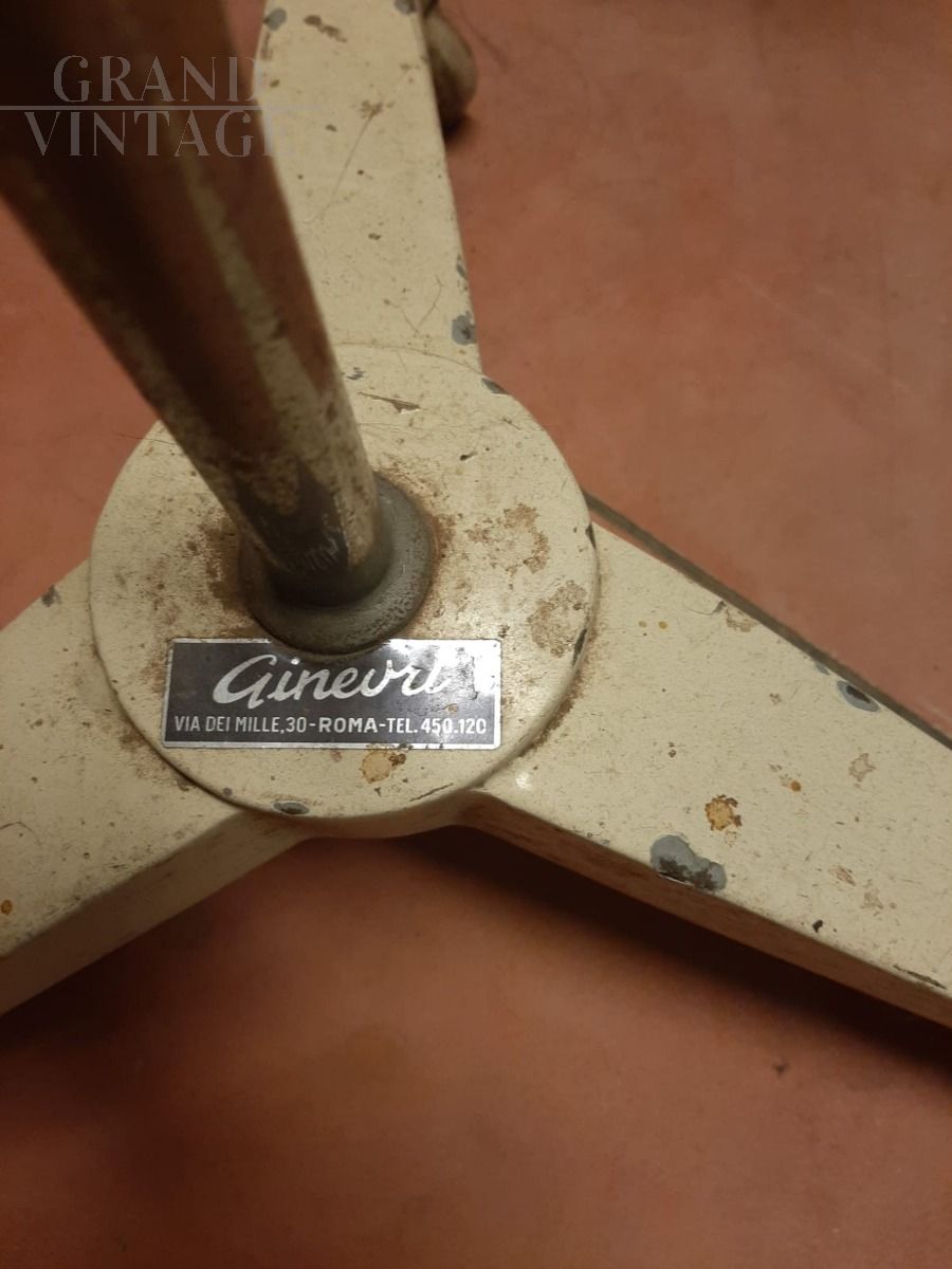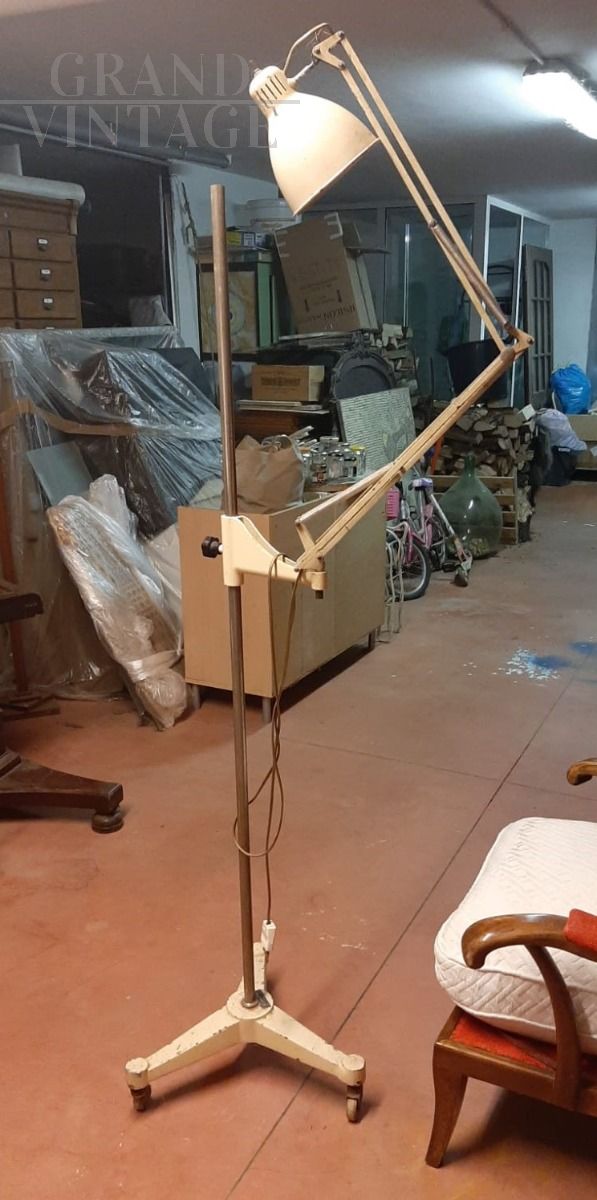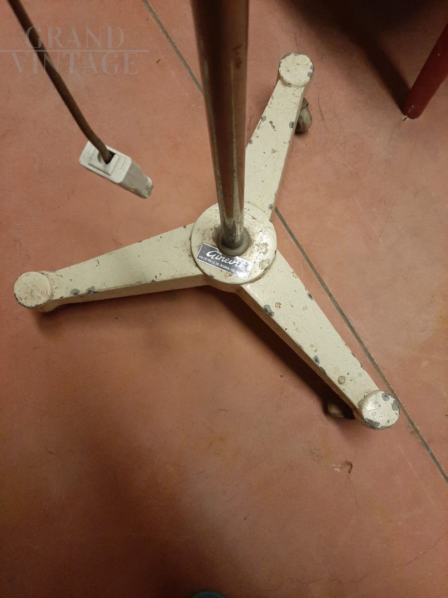 Ginevri free-standing doctor's studio lamp, 1970s, can be swiveled in any direction, height-adjustable and equipped with wheels. Originally designed for a doctor's office, it is also perfect as a work or any studio lamp for any context in which precise orientation of the light beam is required. The central pole in tubular iron, the lampshade is in cream-colored lacquered metal.