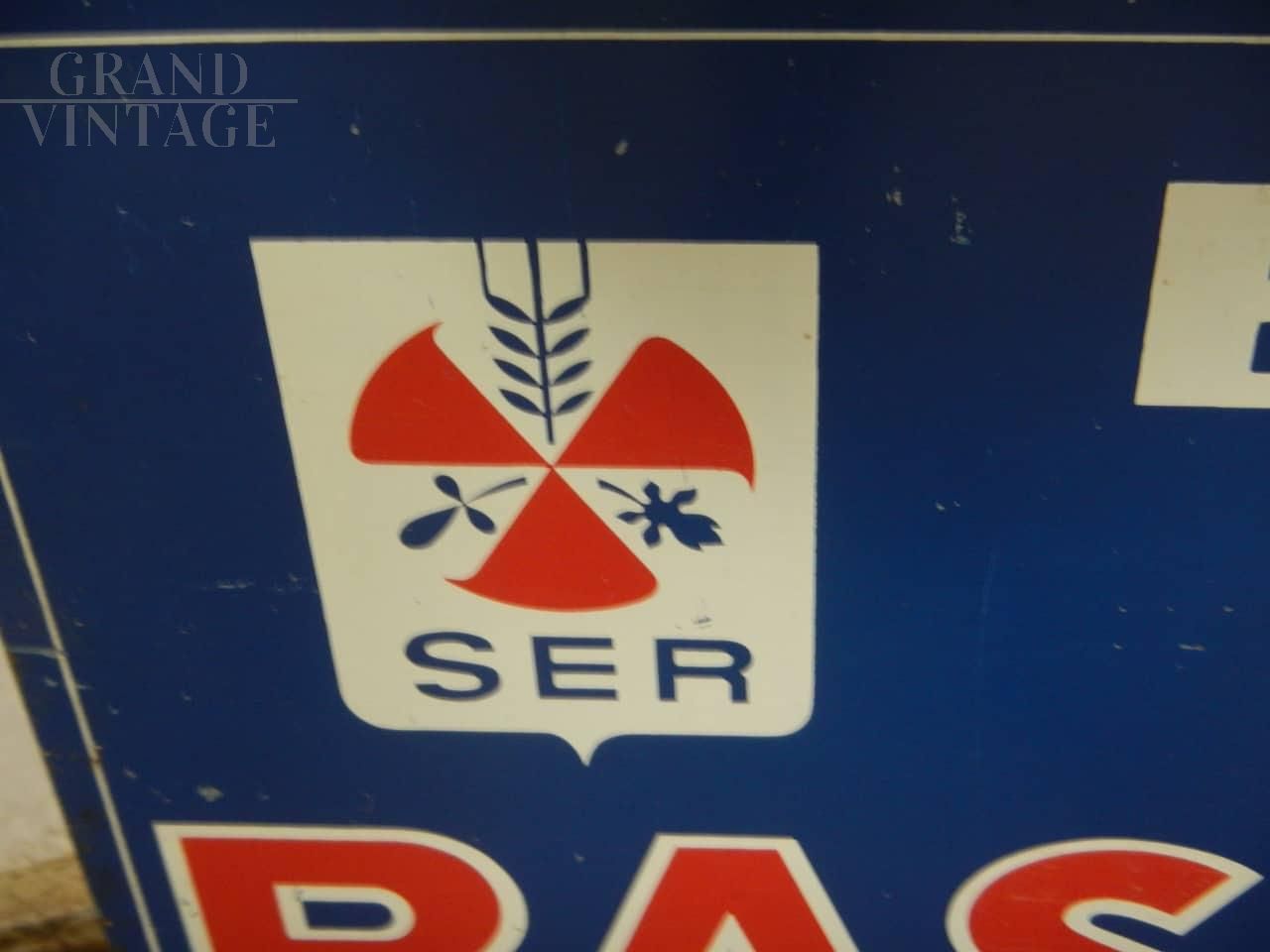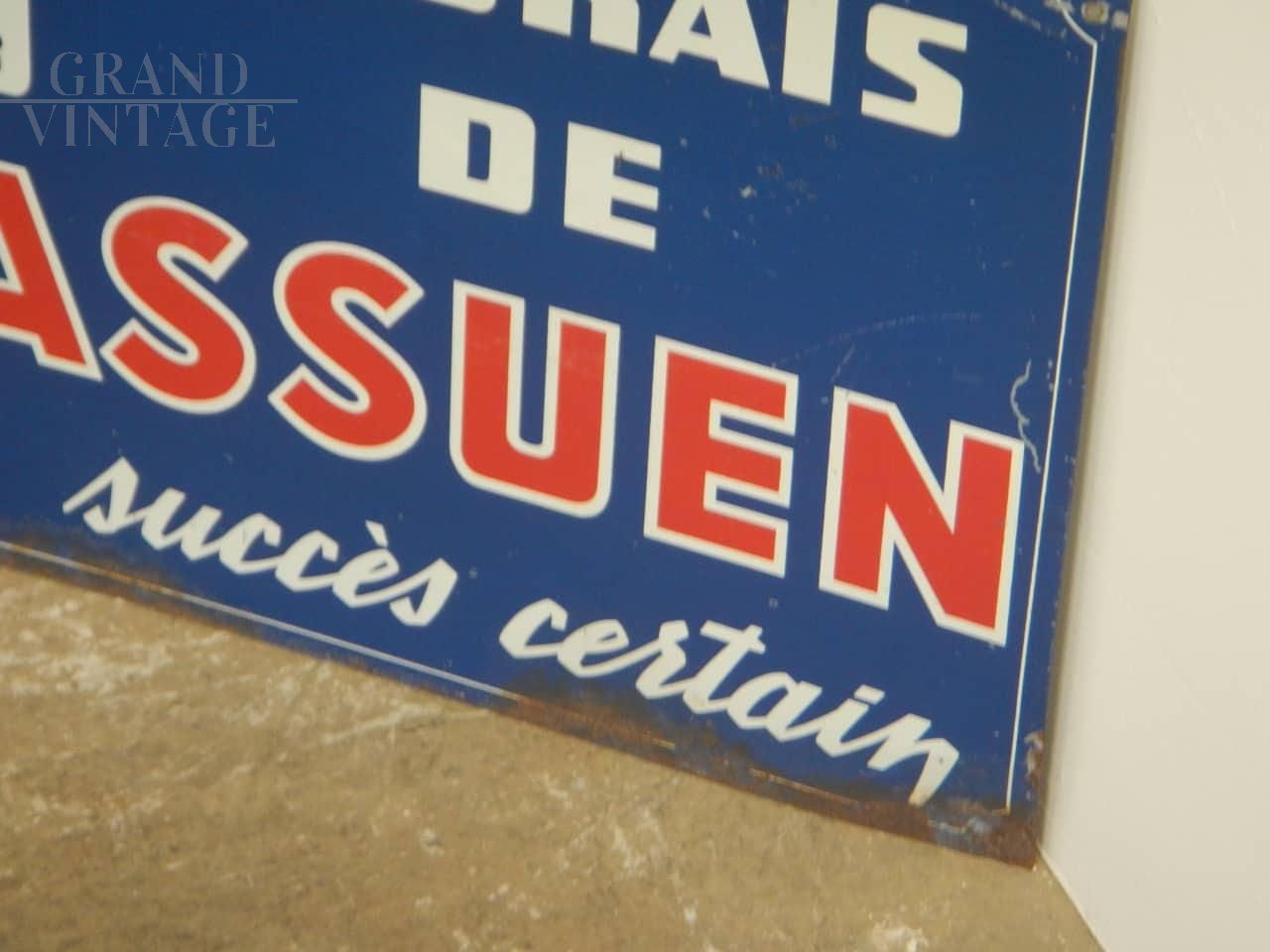 Vintage French enameled metal advertising sign for the Rassuen fertilizer company, reading Engrais de Rassuen: succès certain in red and white on a blue background, France, 1950s.