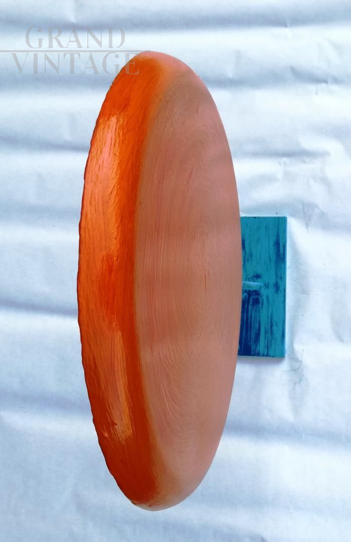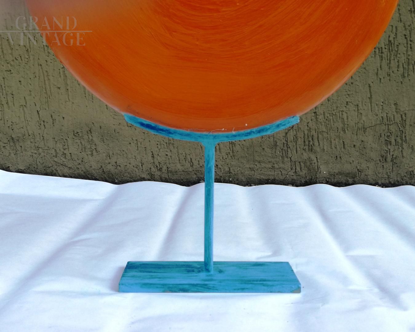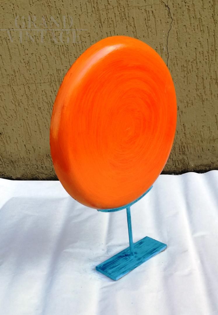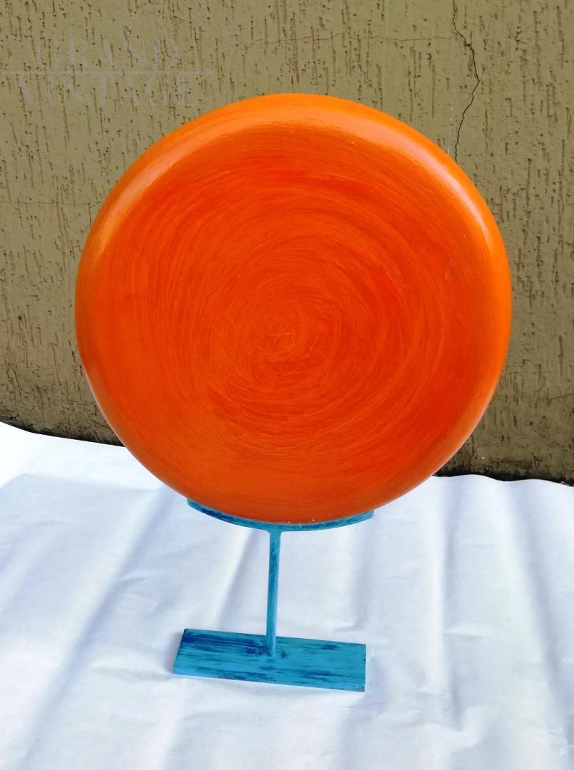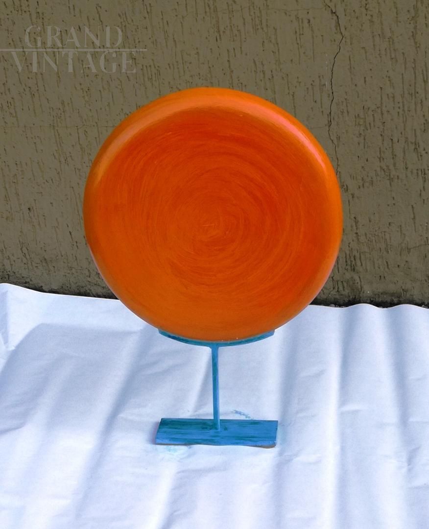 Africa decorative plate in enamelled and decorated metal, 1970s, made of very thick metal. One side is decorated in enamel with typical African animal motifs and is protected by a vitrified surface. The other side, originally black, has been repainted in sunny orange. The plate appears to be of notable artistic quality, but is not signed. The blue support is artificial and can be removed. The plate measures 40cm in diameter.