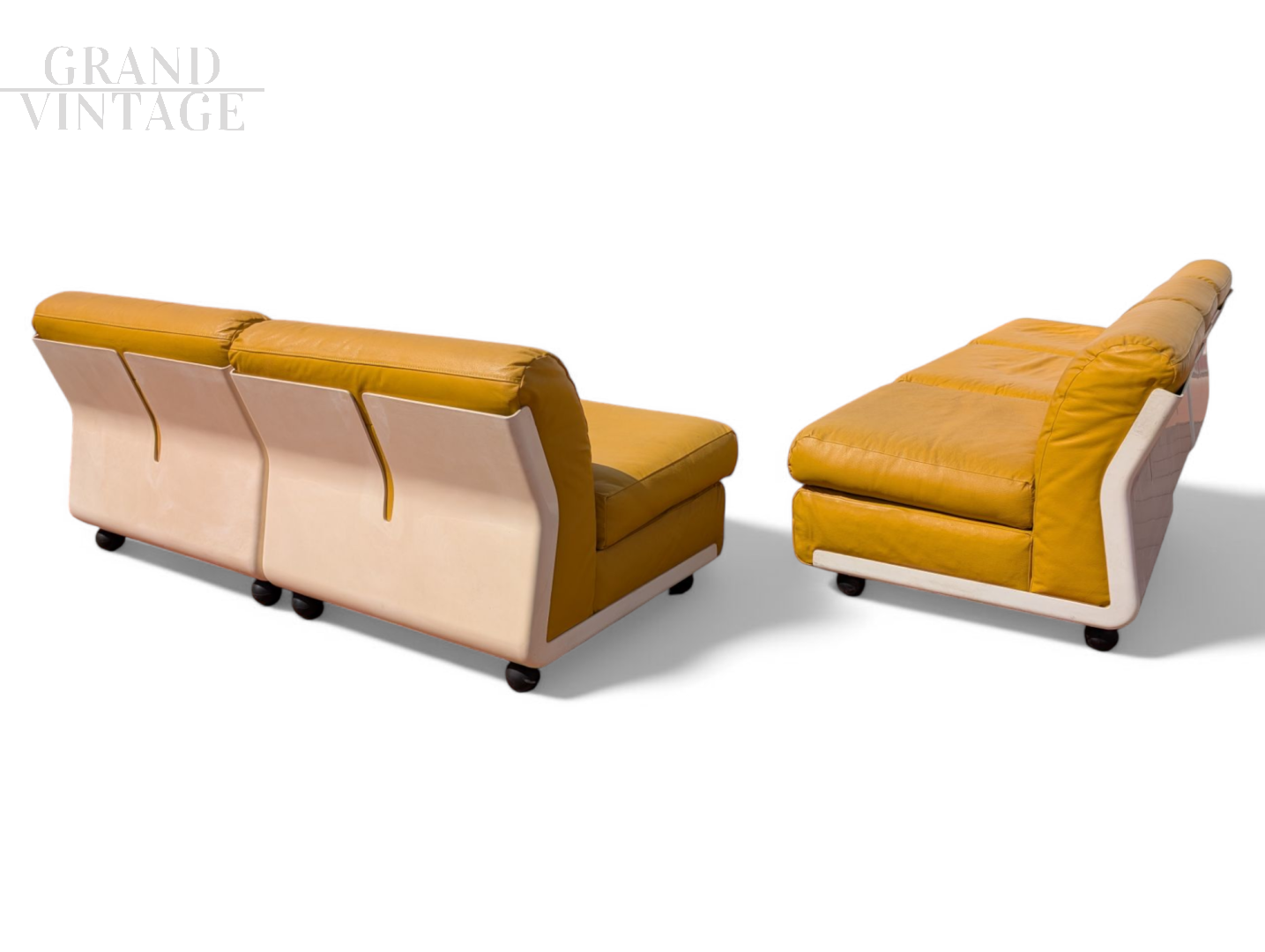 Mario Bellini Amanta modular sofa in mustard yellow leather for B&B Italia, 1960s. Five separate elements can be used as armchairs or sofas. The frames are in white fiberglass and the seats are covered in the original mustard yellow leather upholstery. Sold as 1 set. There are some signs of aging on the frame and the upholstery. It remains a fantastic vintage piece still to use and have in your living room.