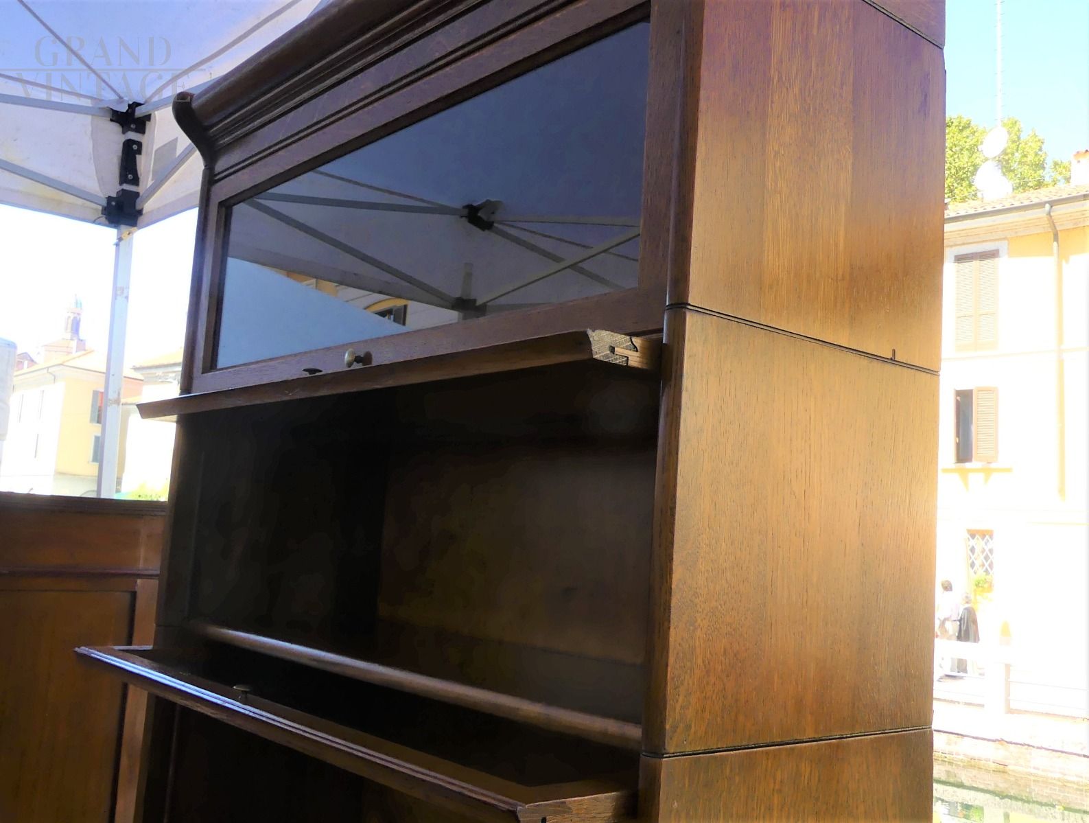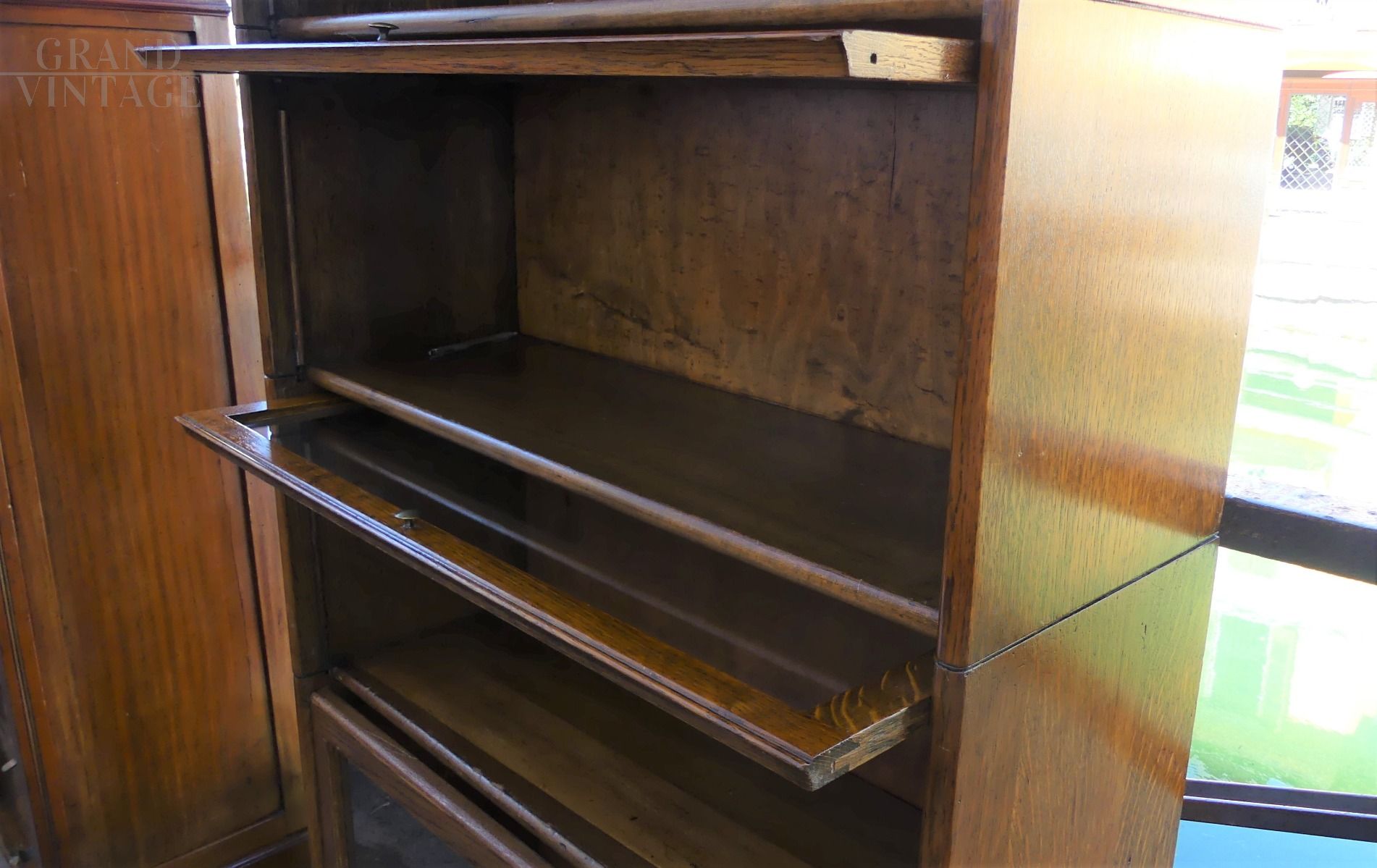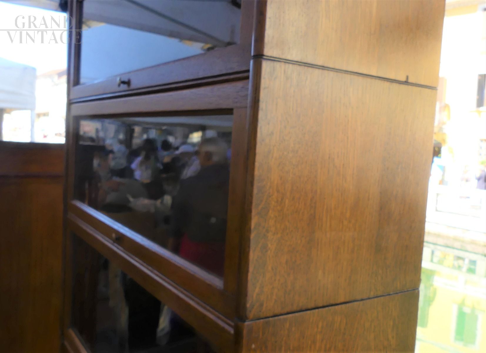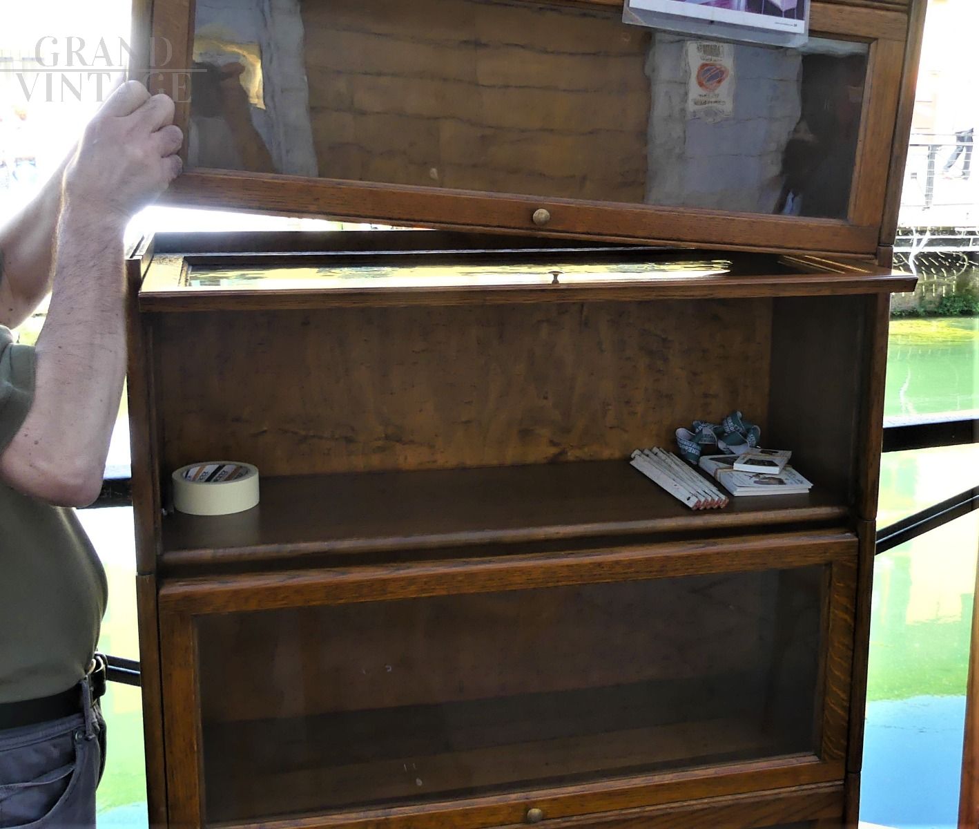 Globe Wernicke original American modular bookcase from the 50s / 60s, in solid oak wood, restored, composed of 5 modules with glass doors and a base with wooden drawer.