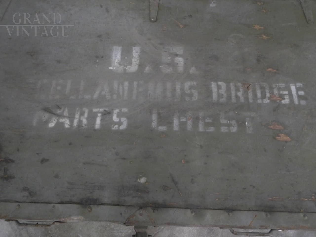 American military chest from the 1940s in wood with iron handles and body, painted in green and bearing the writing U.S.A. miscellaneous bridge parts chest.