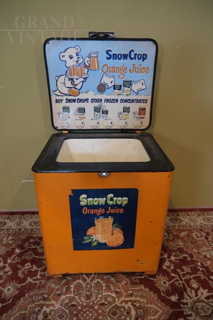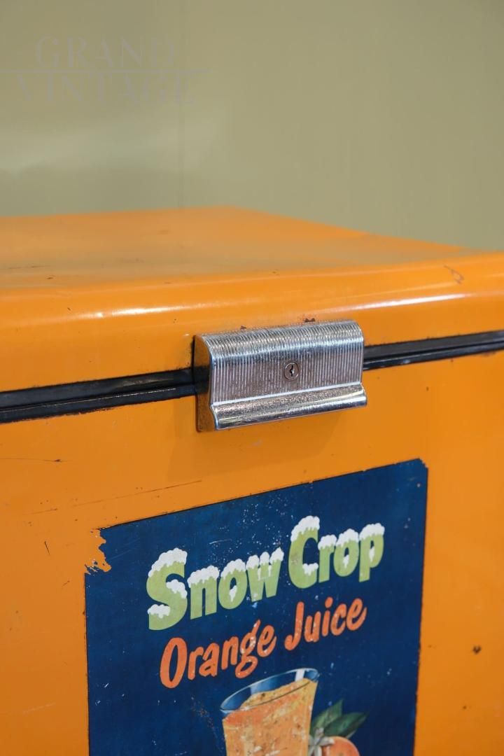 Vintage and colourful, this Snow Crop Orange Juice advertising fridge freezer comes from America and was used to keep orange or other fruit granitas cool. With its bright orange hue and historic graphics, it is ideal for adding an authentic and scenic note to kitchens or premises.