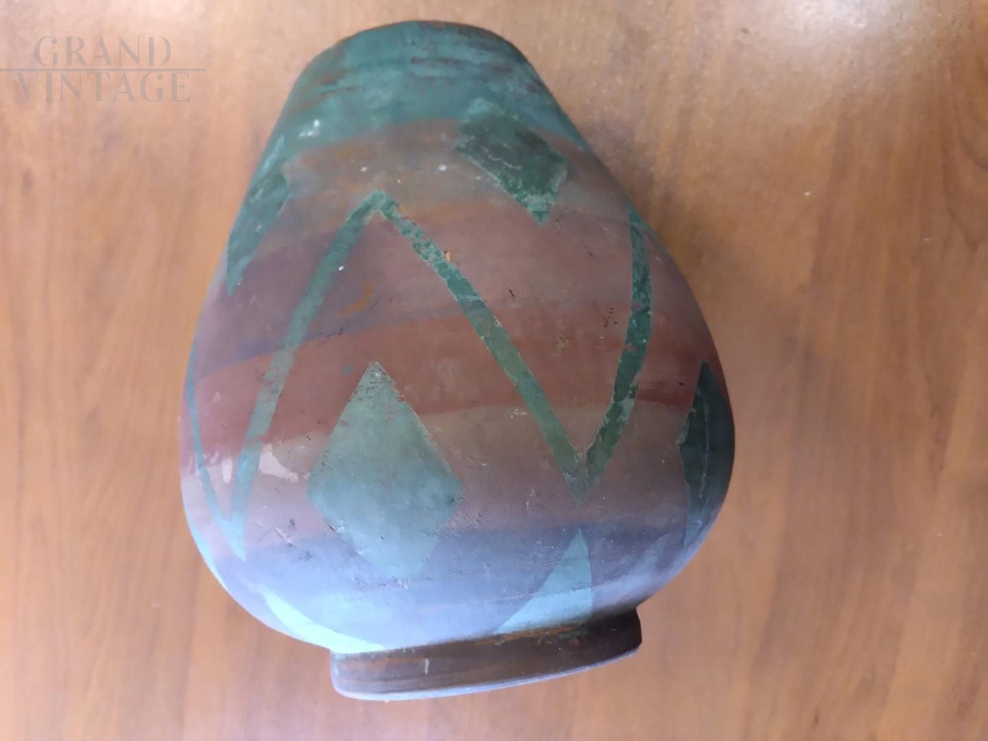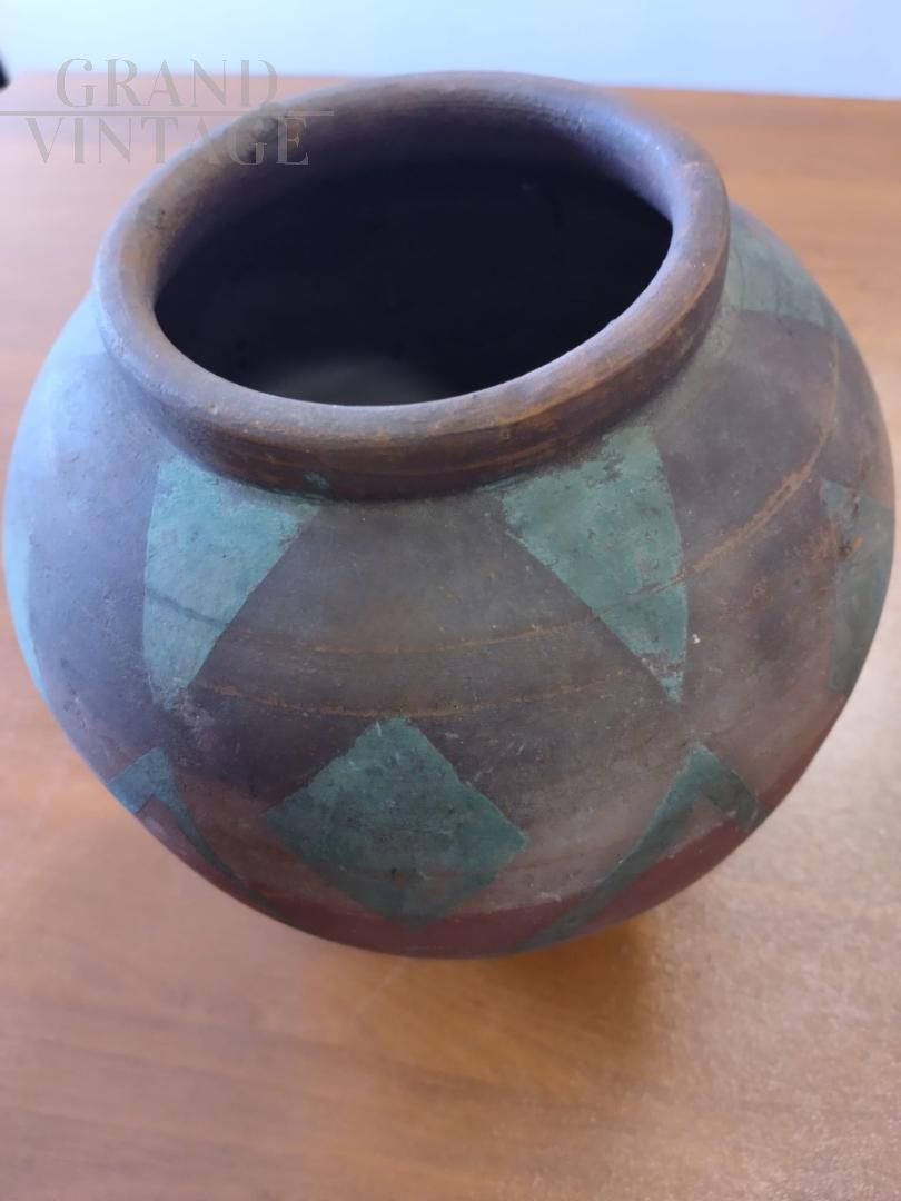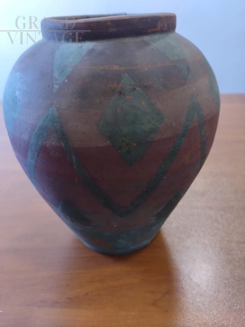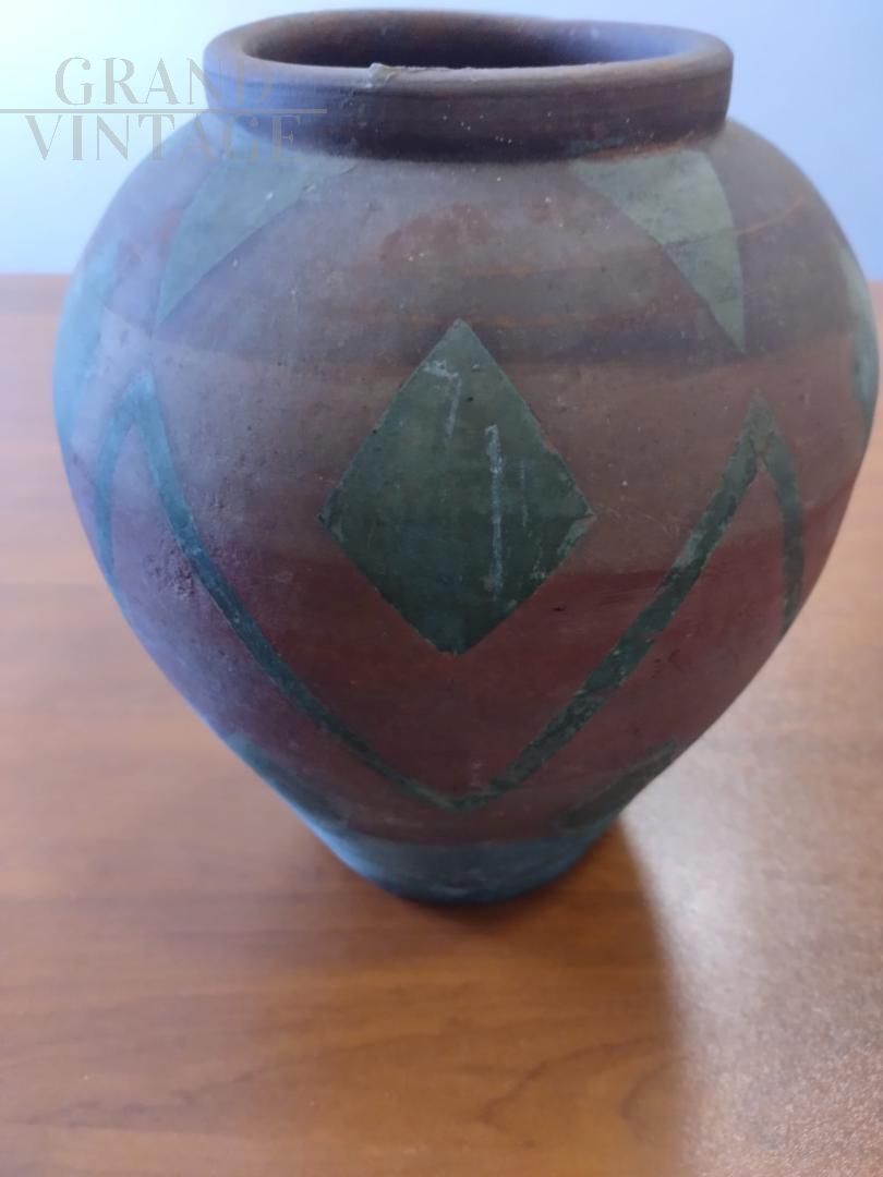 Beautiful polychrome terracotta amphora vase jar from the early twentieth century with geometric designs.