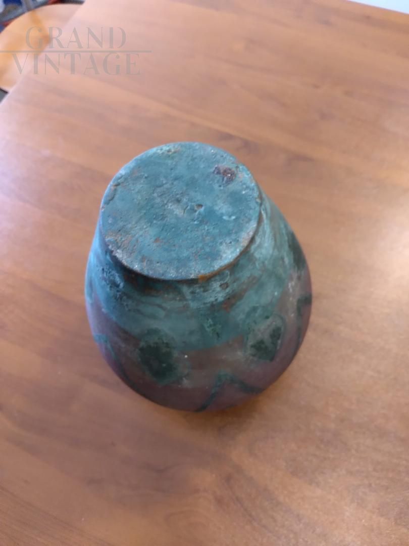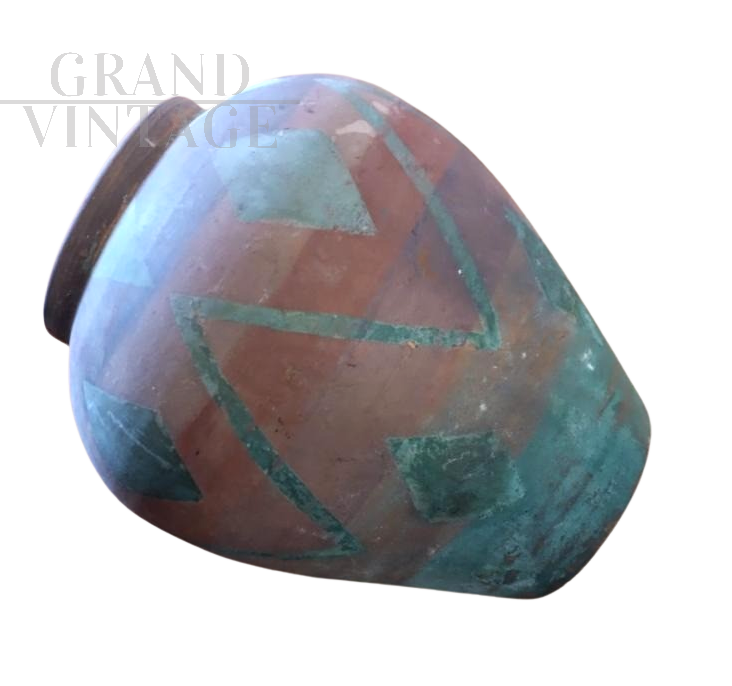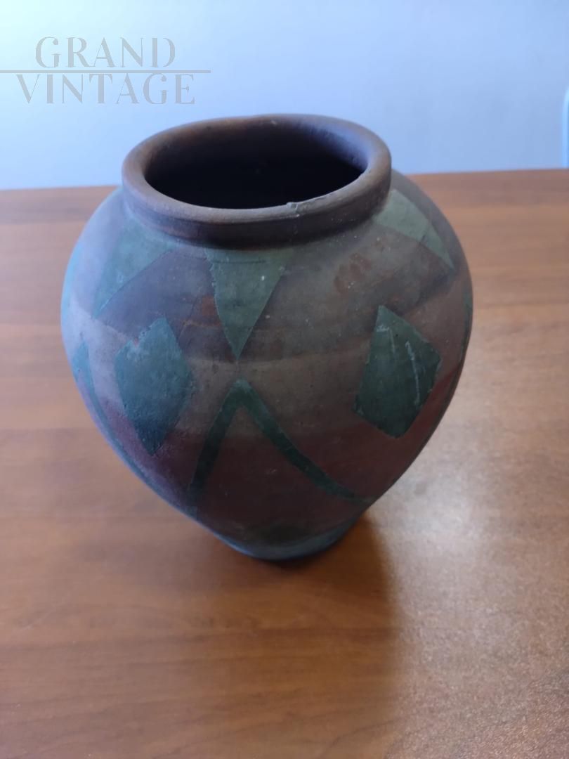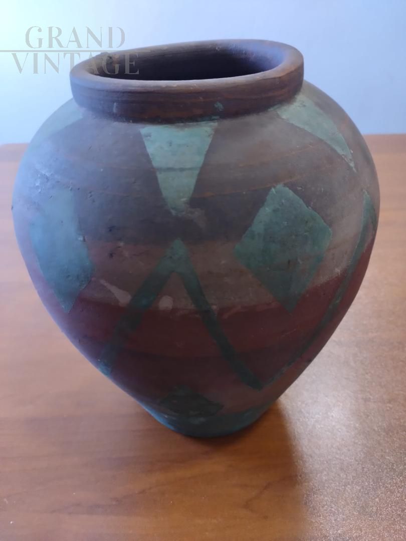Beautiful polychrome terracotta amphora vase jar from the early twentieth century with geometric designs.