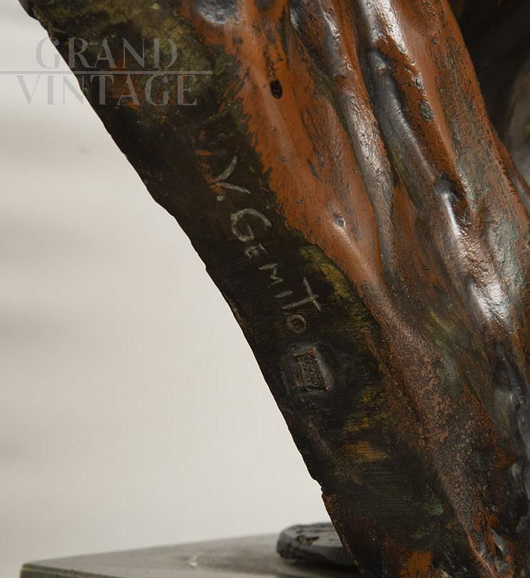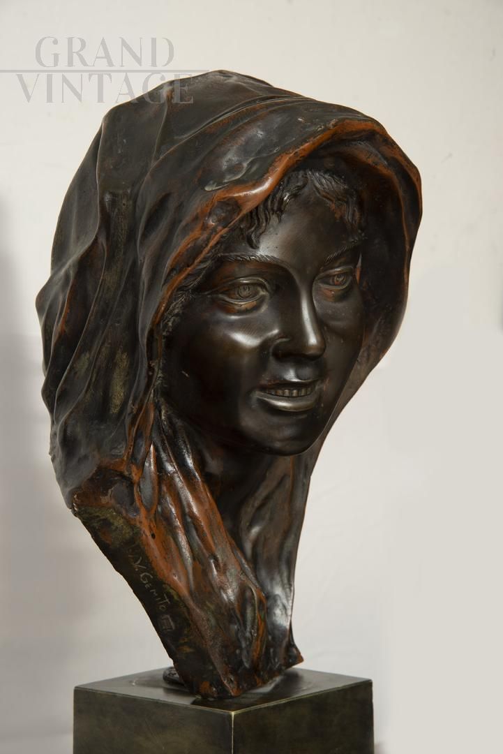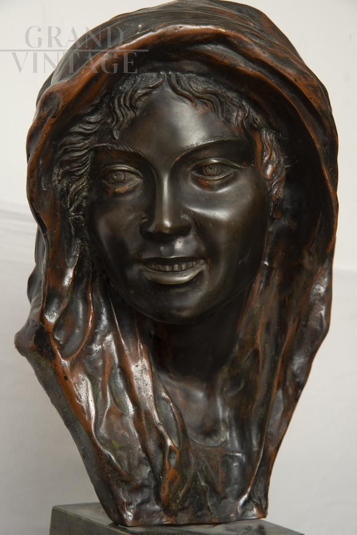 Antique sculpture in burnished bronze depicting a woman's head (Nina) signed Gemito, with stamp of the Chiurazzi gallery from which it comes. The woman with a slightly sad expression is the artist's wife who portrays her with a veil on her head. Vincenzo Gemito (Naples, July 16, 1852 - Naples, March 1, 1929) was an Italian sculptor, draftsman and goldsmith. Largely self-taught, and intolerant of academic canons, Gemito was trained by drawing from the alleys of the historic center of Naples and from the sculptures of the archaeological museum. His prolific artistic activity, which led him to the pinnacle of success at the Paris Salons in 1876-77, was interrupted due to an internal intellectual crisis, due to which he segregated himself from the world for eighteen years; it resumed public life only in 1909, and then died twenty years later.