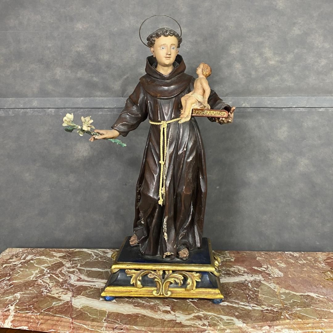 Antique statue depicting Saint Anthony, polychrome wood sculpture, Italian school.