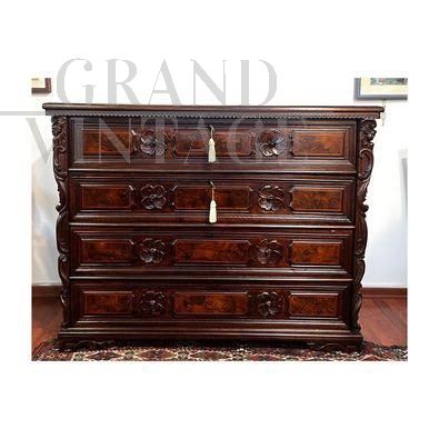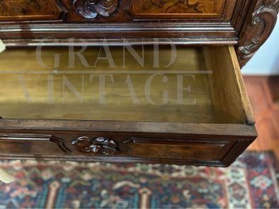 Antique 17th century Mantuan chest of drawers in walnut and walnut root, with 3 large drawers and drop-down top with 4 drawers, maple finishes and sculpted and carved decorations. Precious and elegant workmanship, from the flower-shaped knobs to the side knobs with cherubs. Totally restored.