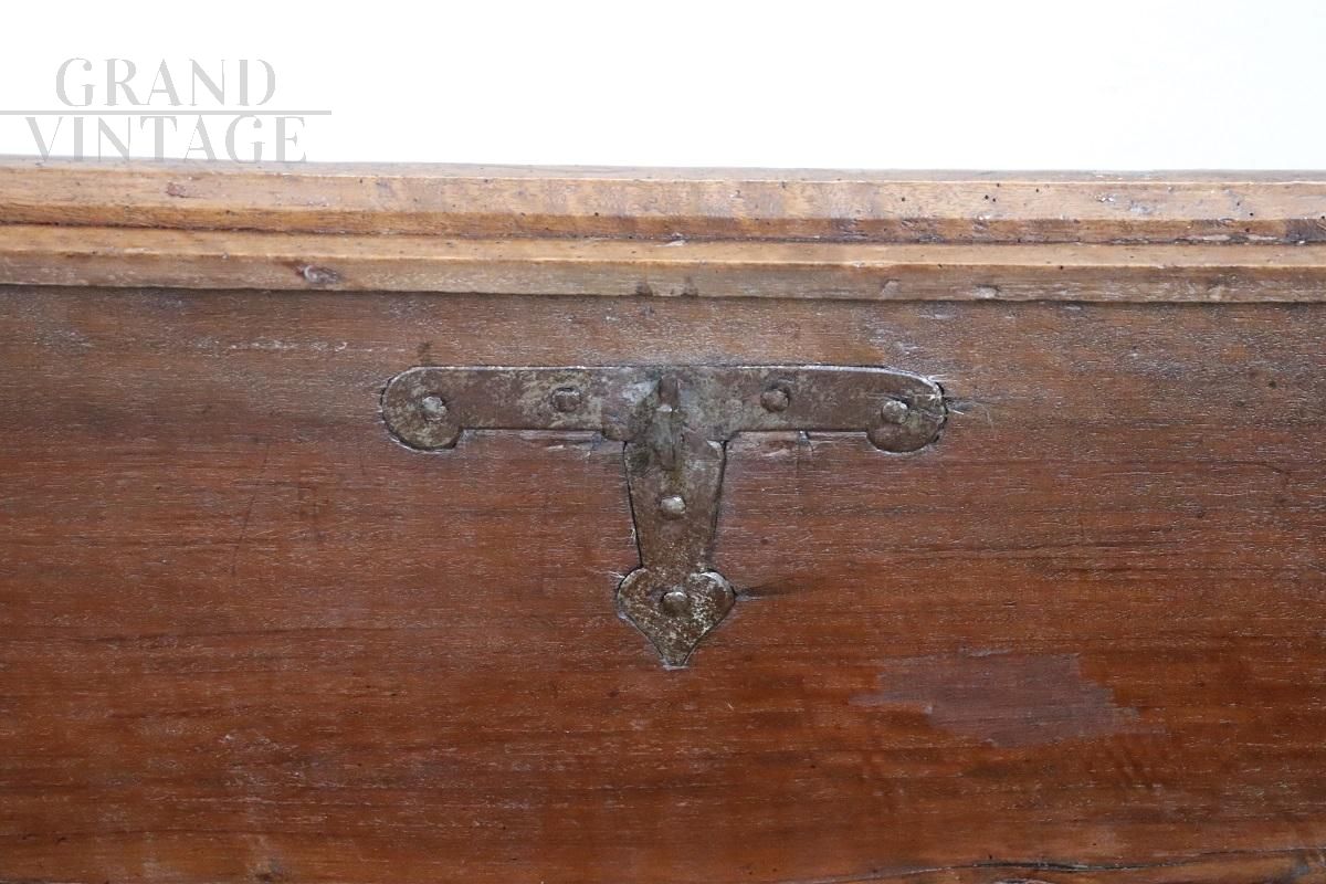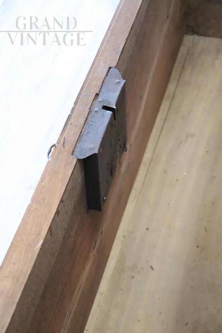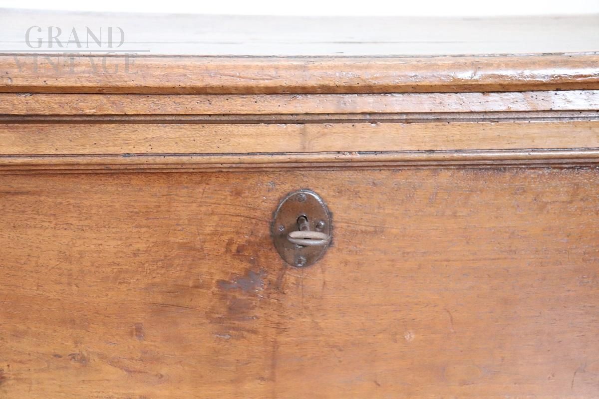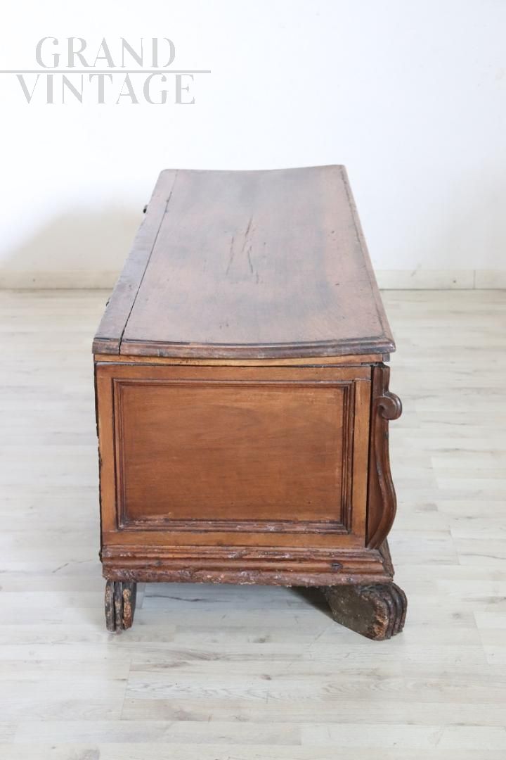 We are pleased to present this refined antique Italian chest dating back to the early 18th century. Crafted from solid walnut, it has a simple, clean design that complements even modern furnishings. Two delicate decorations on the sides of the front break up the linearity and create a distinctive visual accent. Its functionality is excellent, with a large compartment offering plenty of storage space and a small internal drawer. Note: The wood of the lid has a small defect due to age; the wooden board is no longer perfectly level (as seen in the photos). This defect does not affect the closure or the overall aesthetic of the piece. Price negotiable.