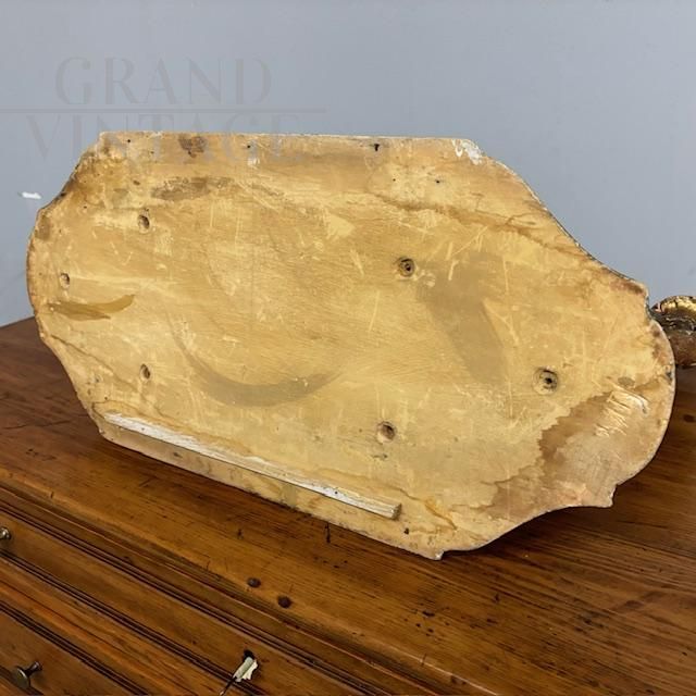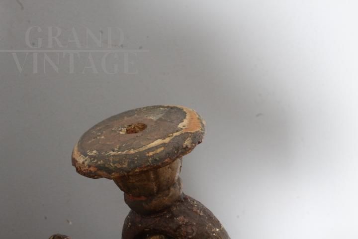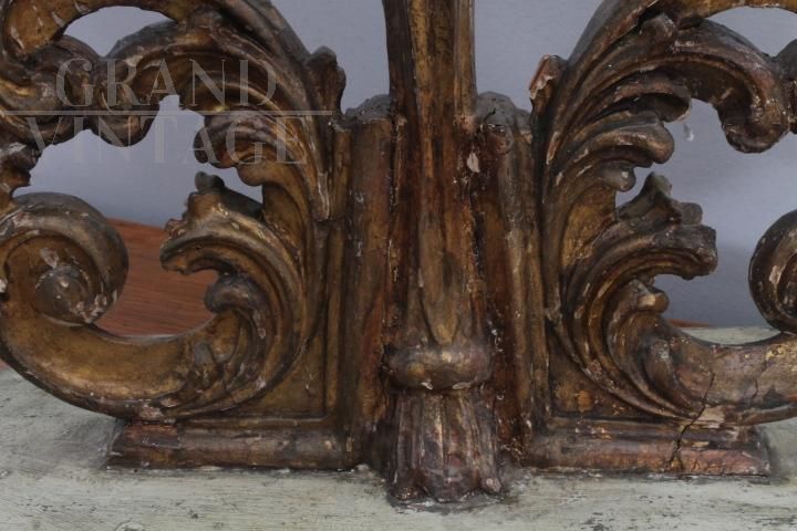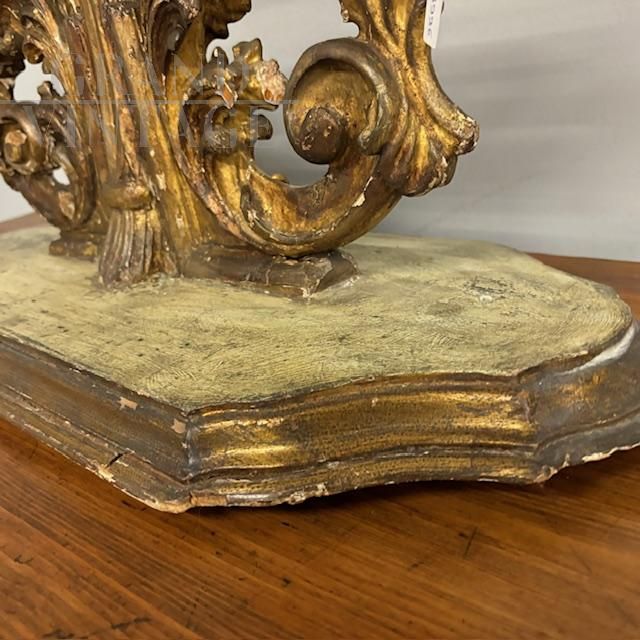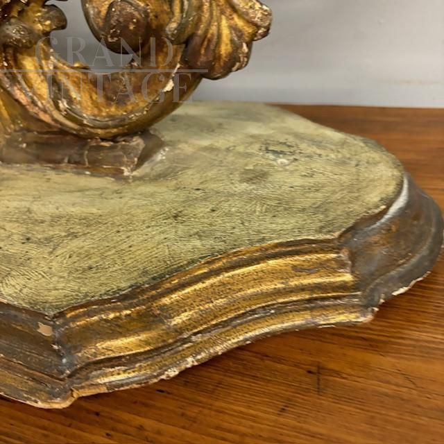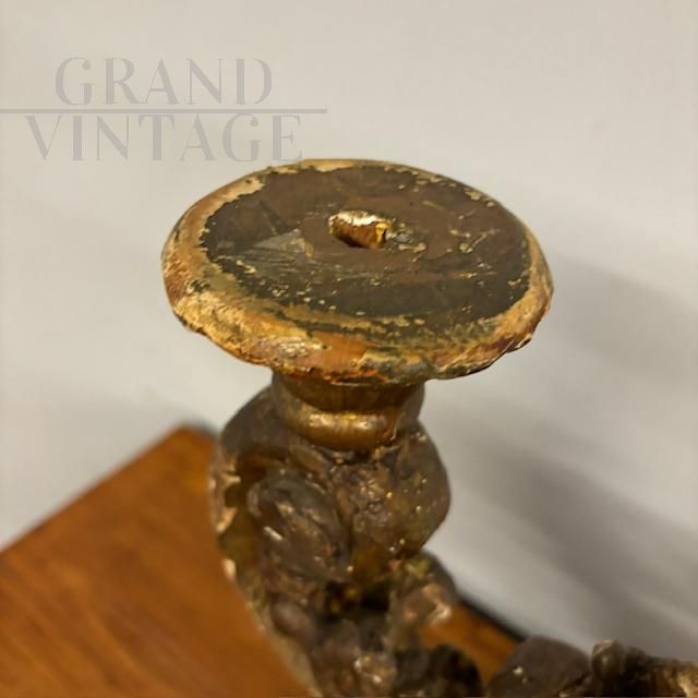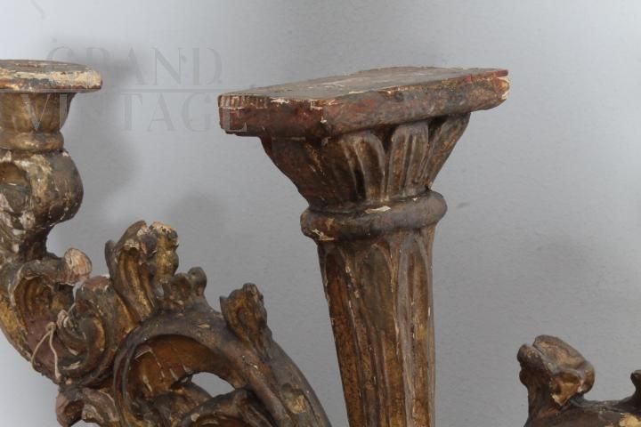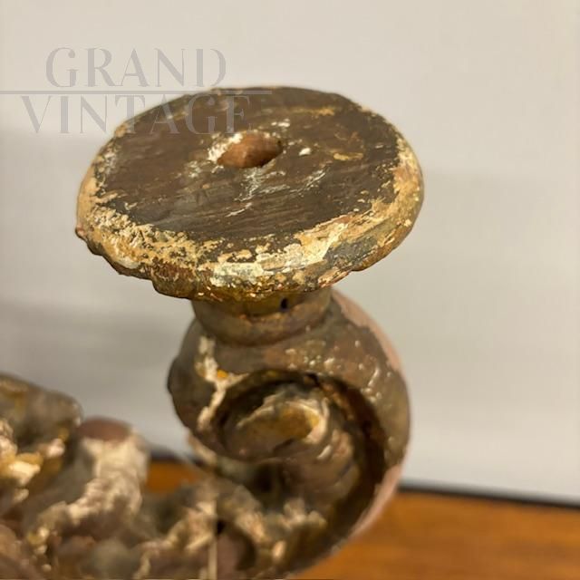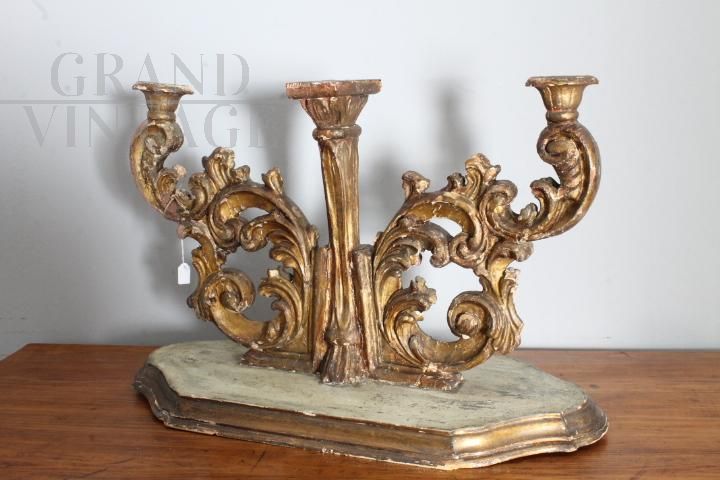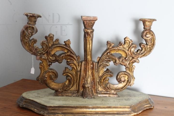 Beautiful antique two-light candelabra in Mecca-gilt wood from the 18th century, with green and gold lacquered base. It shows small wear and tear, normal for such an antique object.