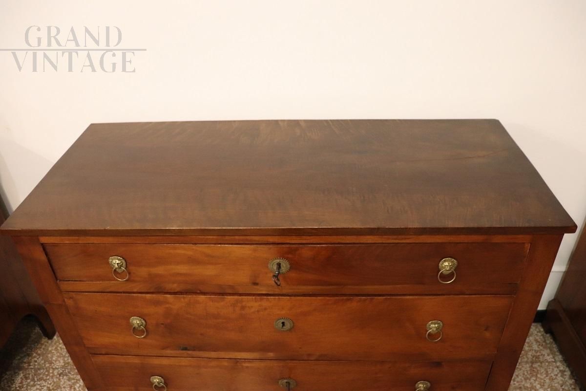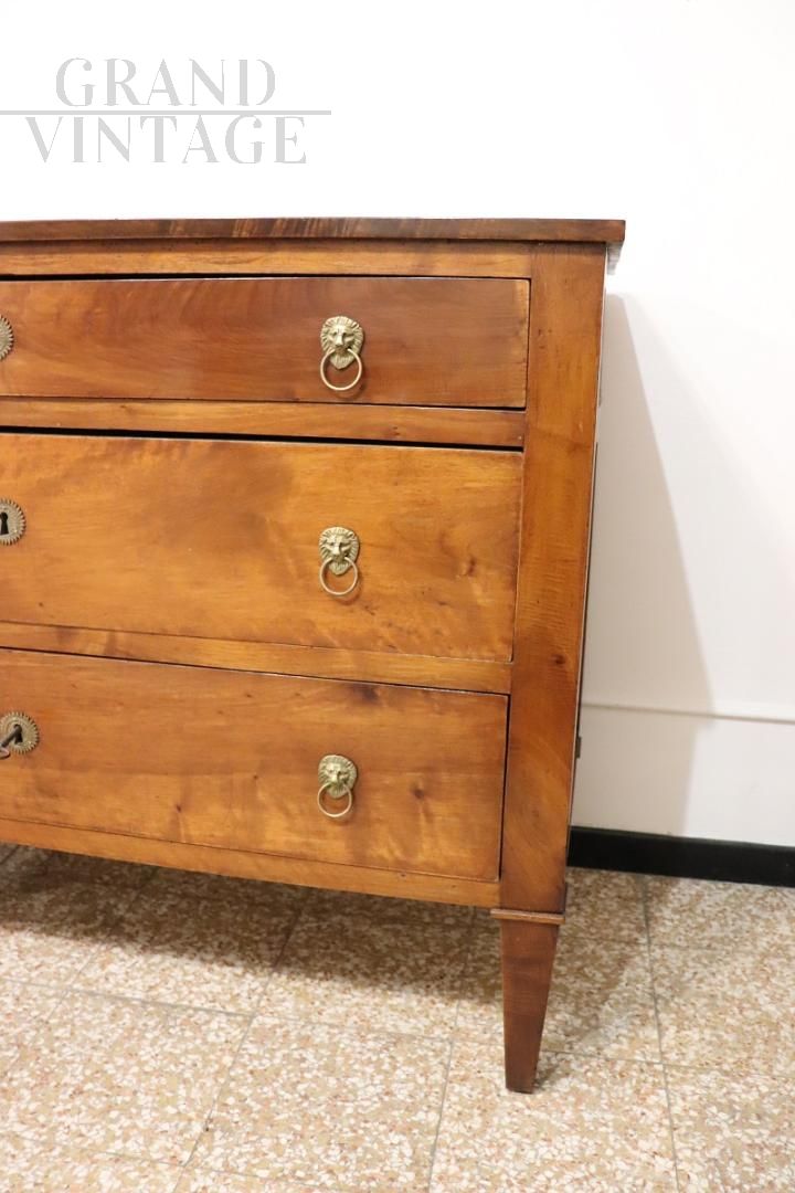 This exquisite antique Italian chest of drawers from the late 18th century, during the Louis XVI period, exemplifies timeless elegance and craftsmanship. Crafted from high-quality solid walnut, it displays the clean lines and minimalist design characteristic of the era's pursuit of understated sophistication. The slim gilt bronze lion head handles add a regal touch, elevating its aesthetic appeal. Designed with practicality in mind, it features three drawers, making it a versatile addition to any room. The chest of drawers has been carefully preserved and restored to enhance its beauty while respecting its historical integrity, ensuring it remains a focal point in your home. Price negotiable.