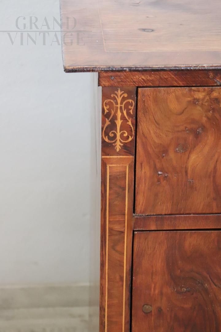 Antique chest of drawers dating back to the second half of the 19th century with 4 drawers in walnut, characterized by a simple but elegant line with refined decoration of small inlays. A pleasant and high quality piece of furniture, thanks to its small size it is perfect in any room of the house and can be easily placed even in small rooms. In good overall condition, with possible small signs of wear on the finish, ready to be placed in your beautiful home. Price negotiable.