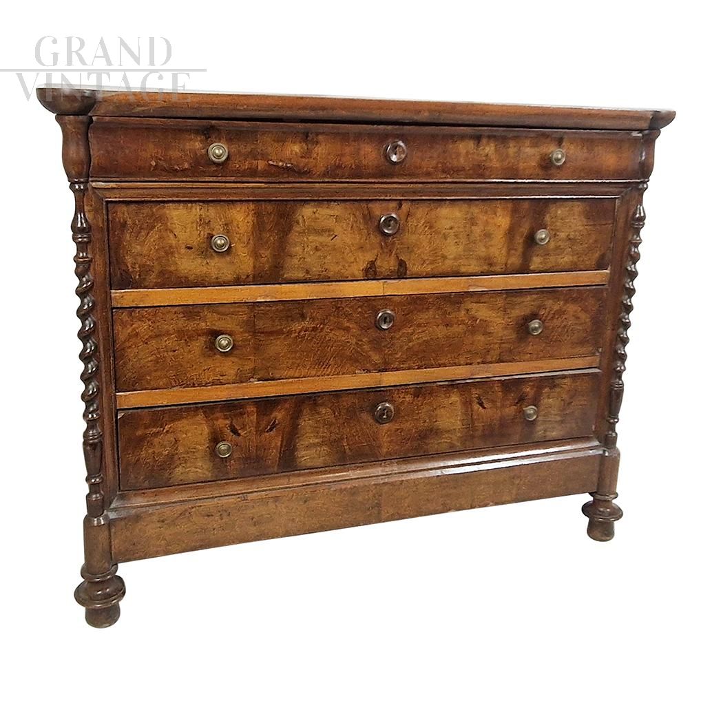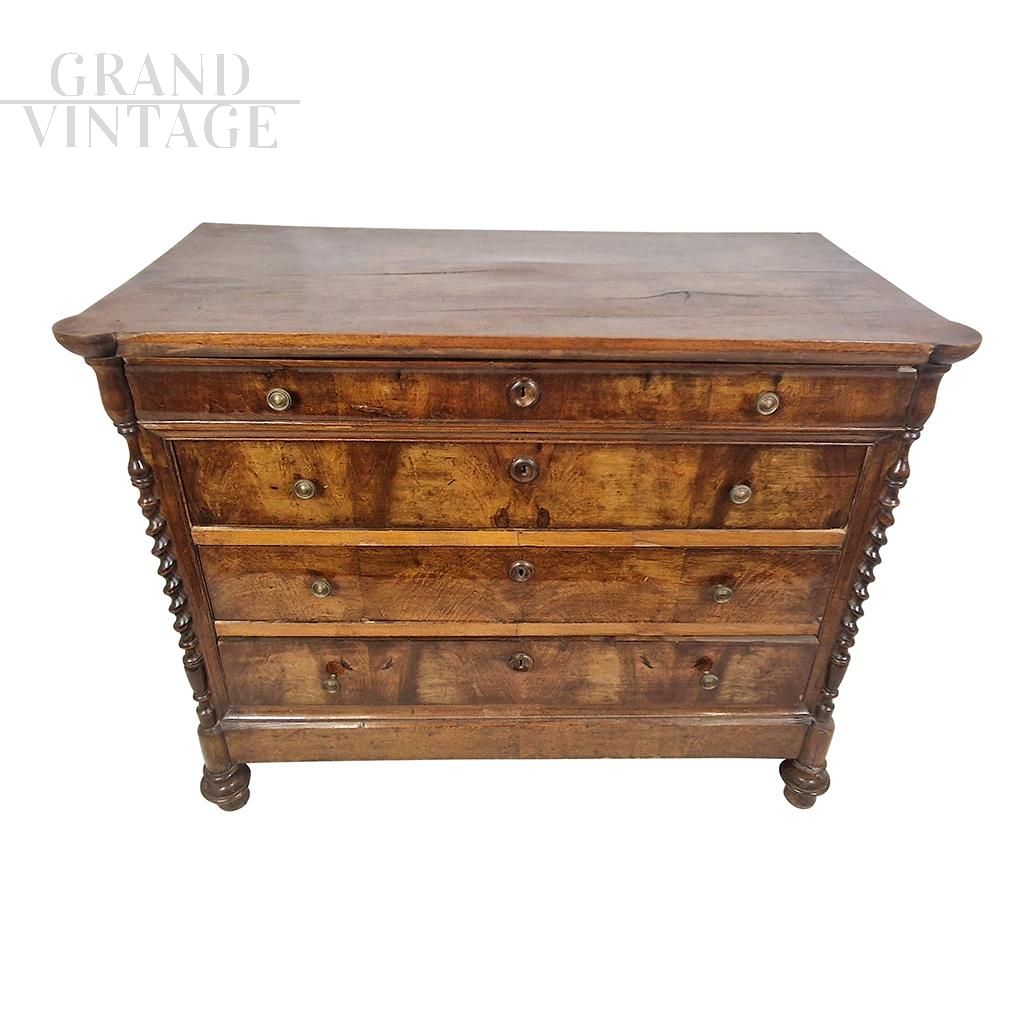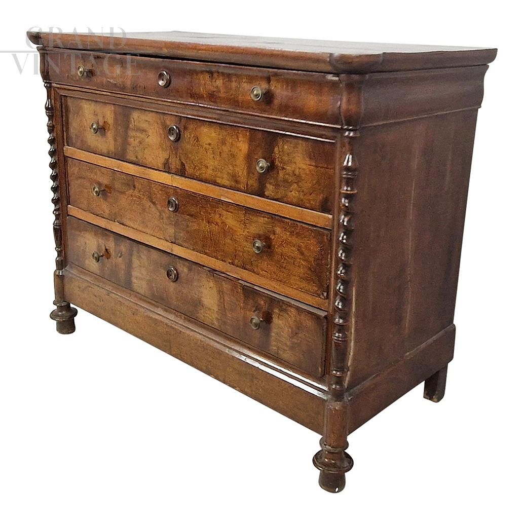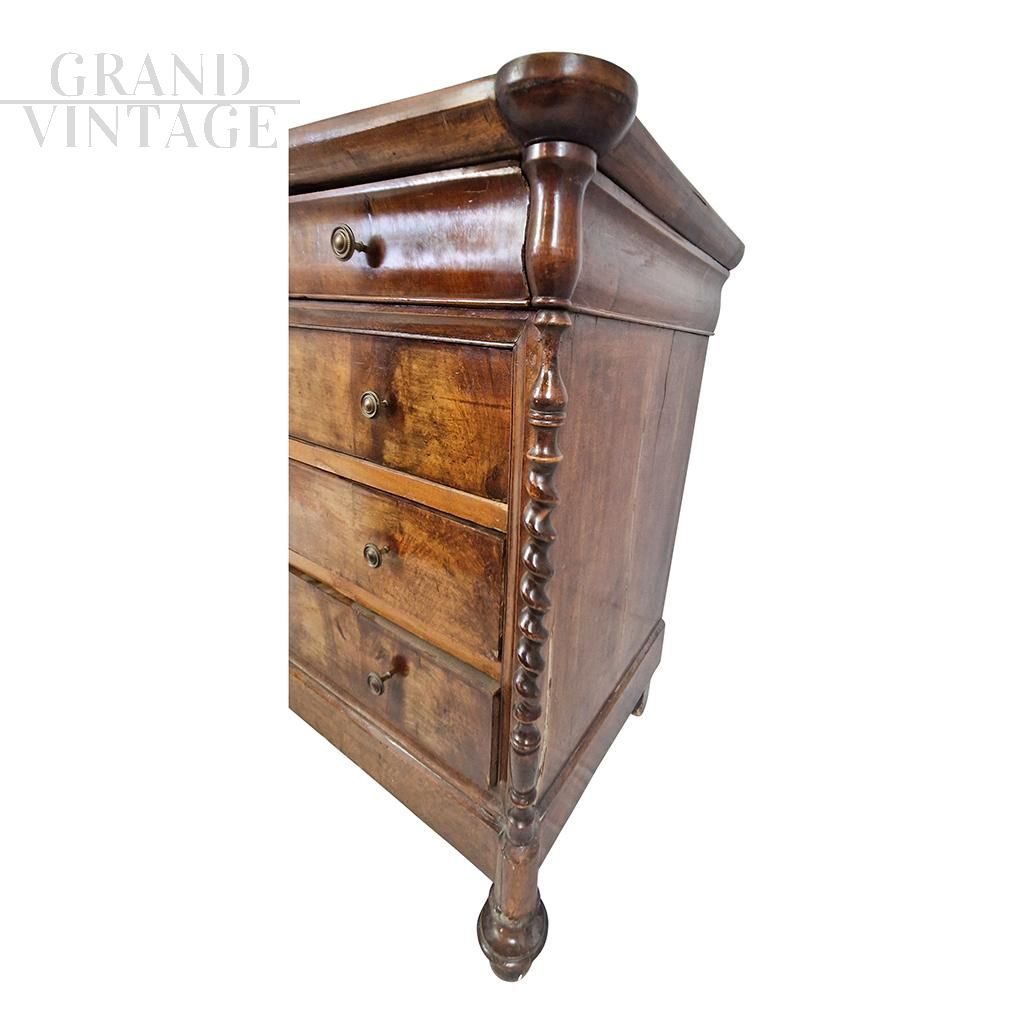 Antique 19th century wooden chest of drawers, equipped with four drawers, enriched with twisted carved columns positioned on the corners of the furniture.