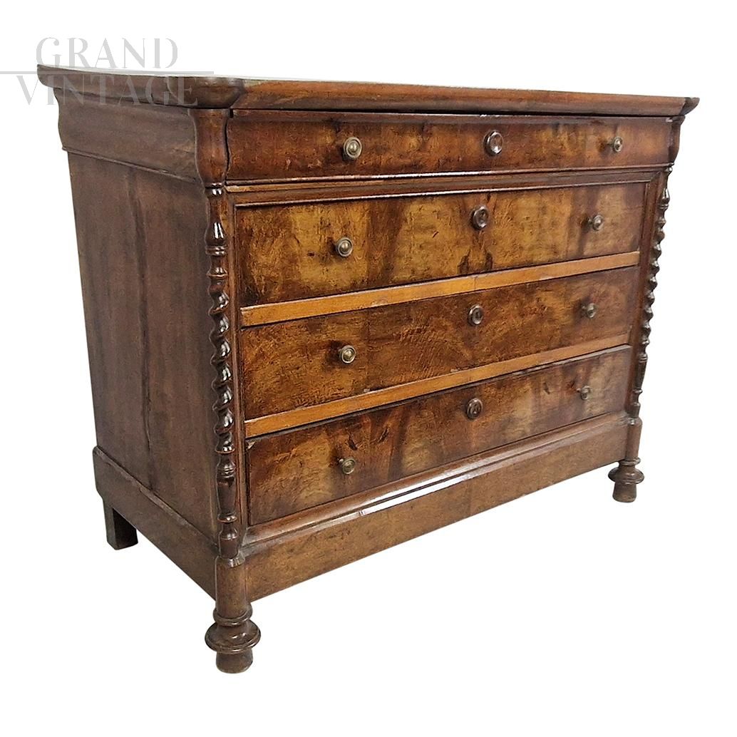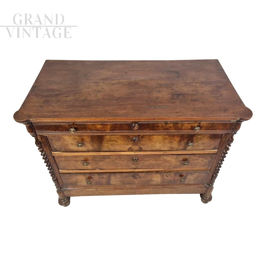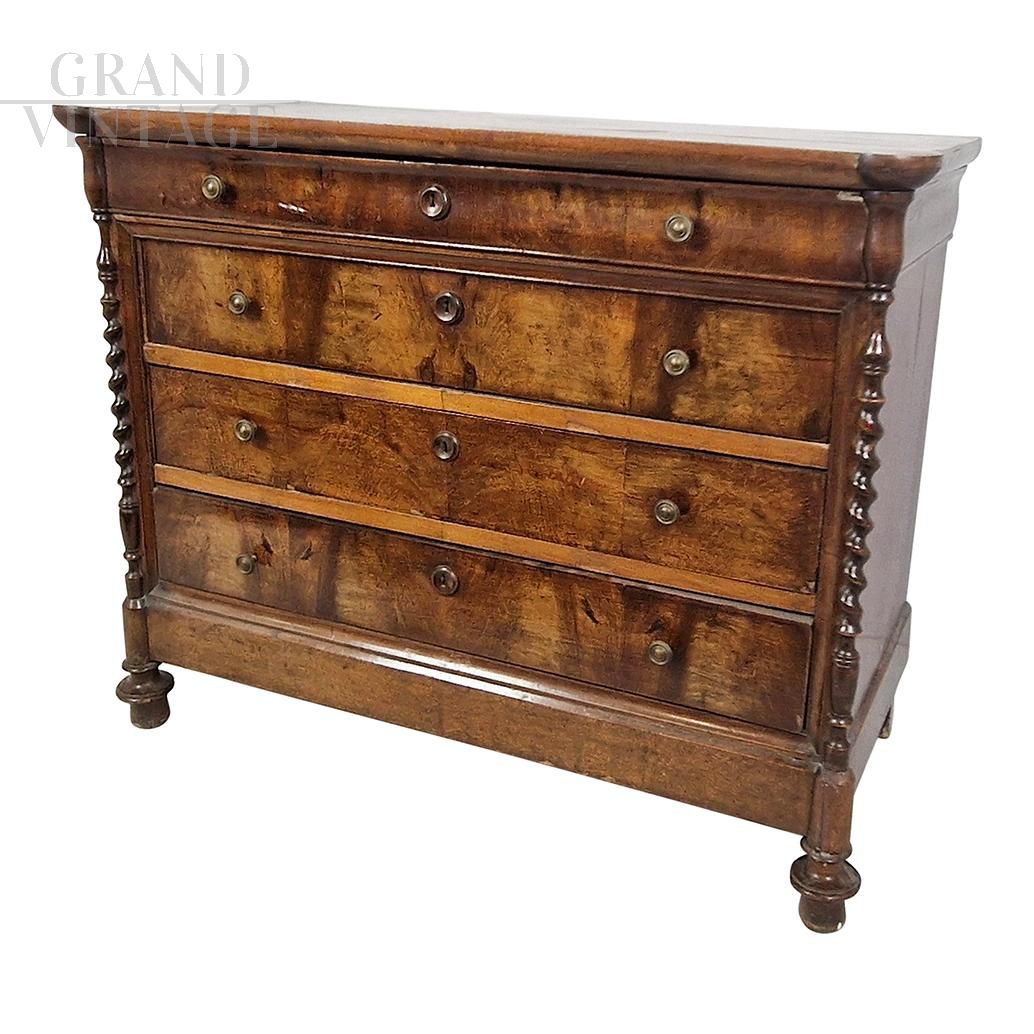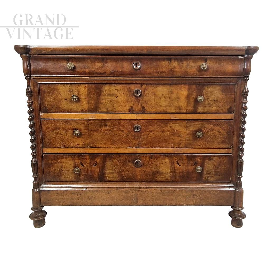 Antique 19th century wooden chest of drawers, equipped with four drawers, enriched with twisted carved columns positioned on the corners of the furniture.