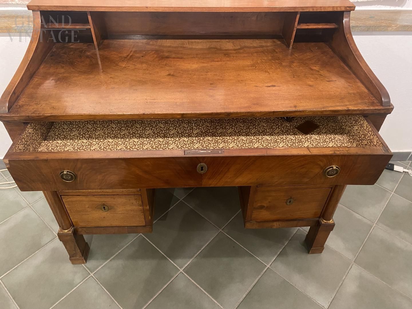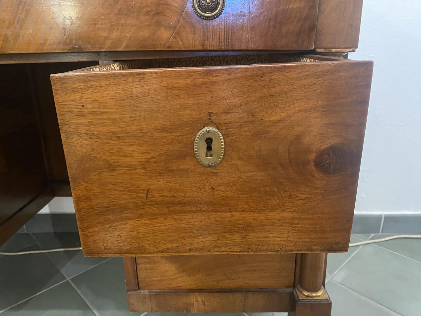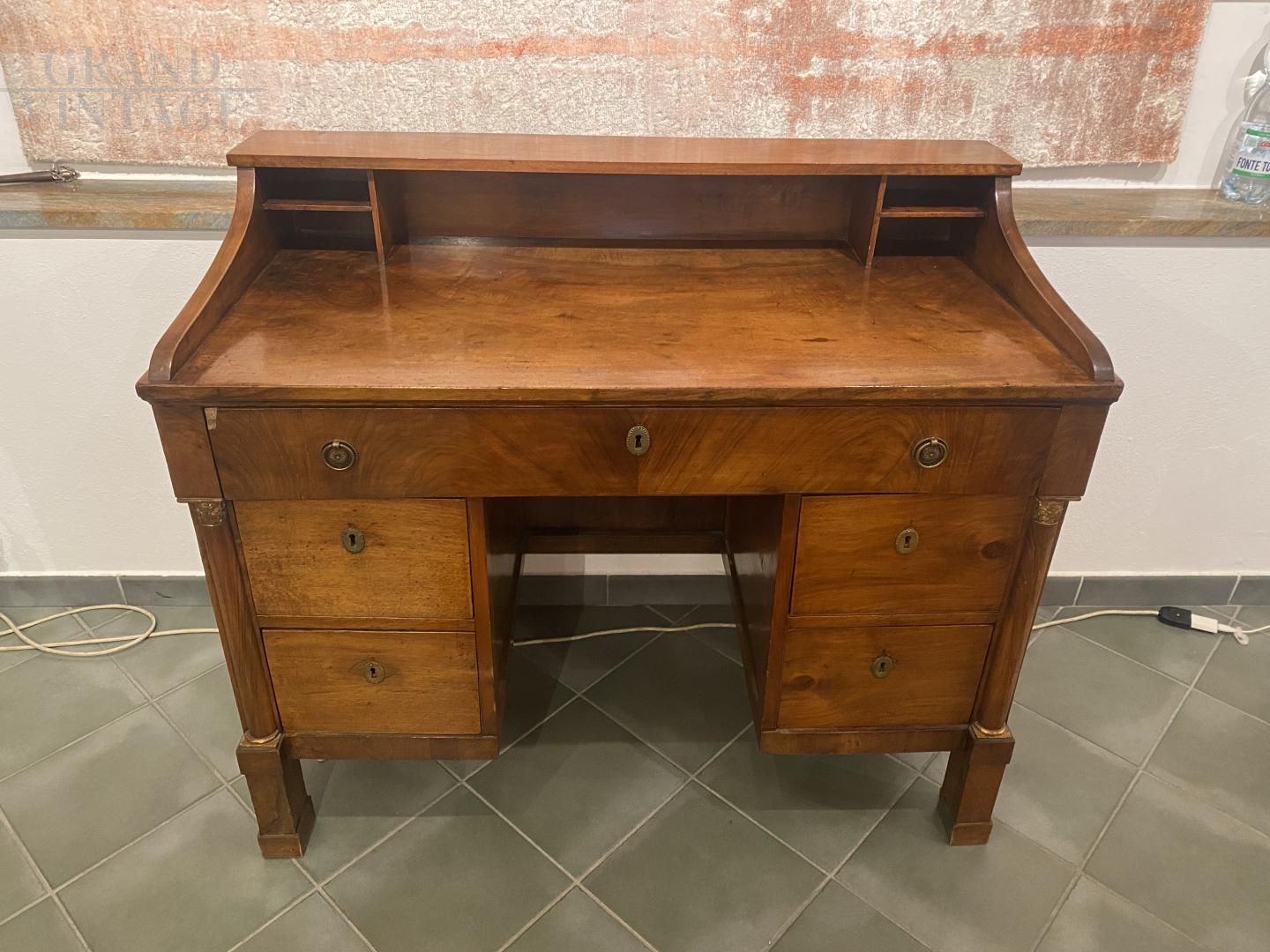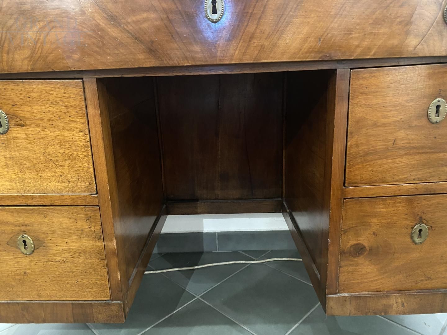 Large antique desk from the Empire era in solid walnut and walnut feather, has a central drawer with 4 other drawers arranged on the sides (two on each side). On the floor we find a rise for compartments. As can be seen from the photos, it is entirely made of solid wood, even the inside of the drawers, which are usually made of soft wood. Keys, locks and bronze inserts are contemporary. A small restoration should be carried out for a missing piece and the polishing should be refreshed. Italy, Piedmont, Empire era.