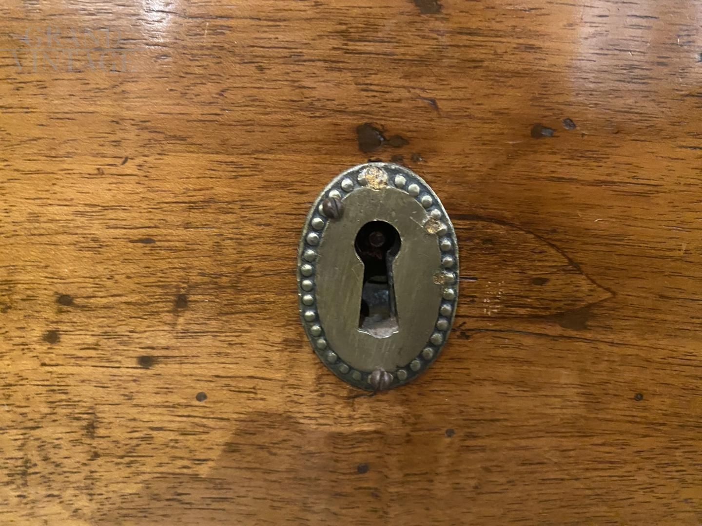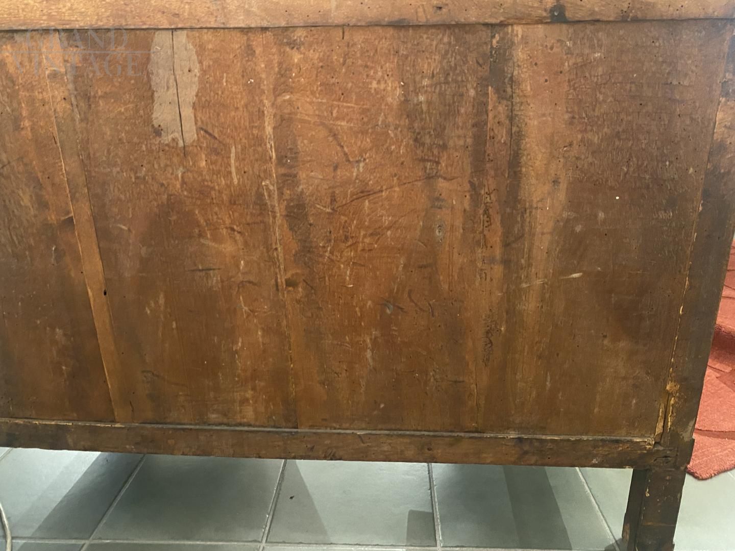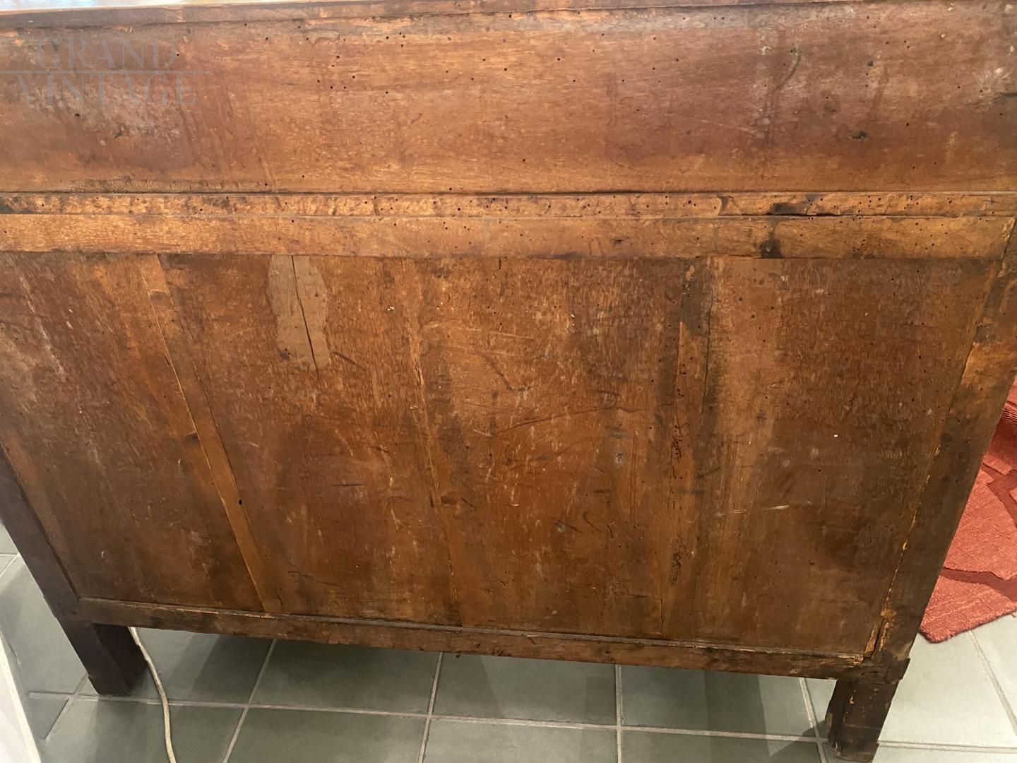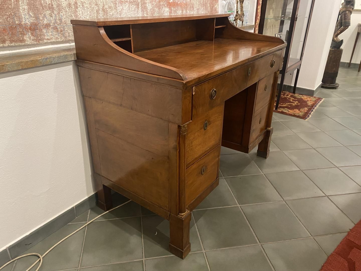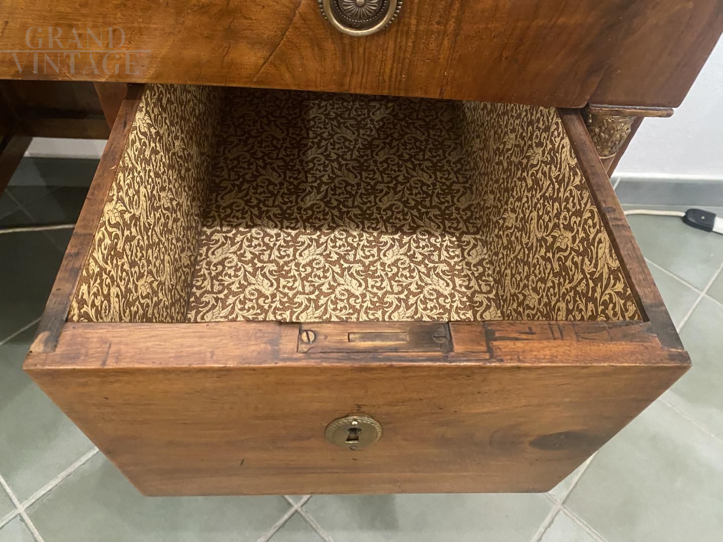 Large antique desk from the Empire era in solid walnut and walnut feather, has a central drawer with 4 other drawers arranged on the sides (two on each side). On the floor we find a rise for compartments. As can be seen from the photos, it is entirely made of solid wood, even the inside of the drawers, which are usually made of soft wood. Keys, locks and bronze inserts are contemporary. A small restoration should be carried out for a missing piece and the polishing should be refreshed. Italy, Piedmont, Empire era.