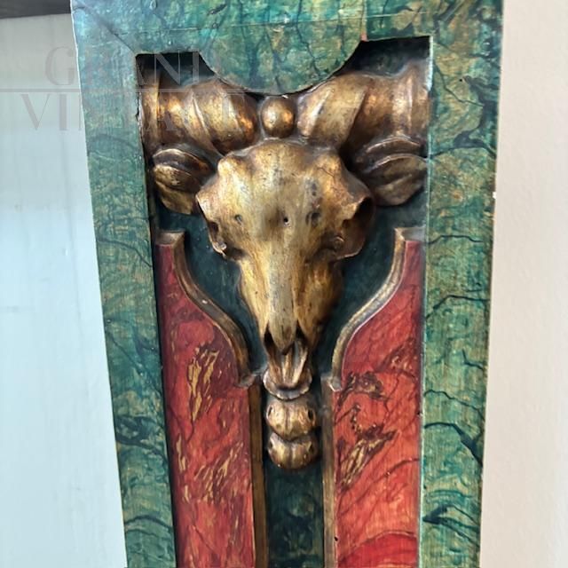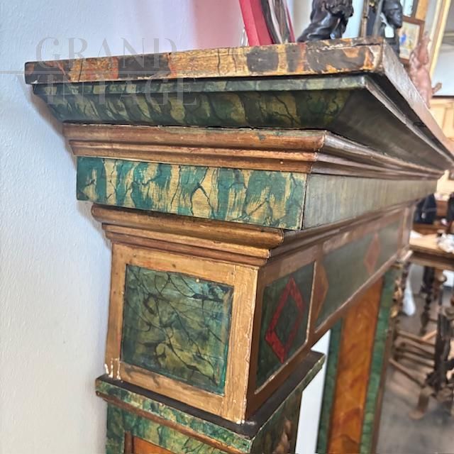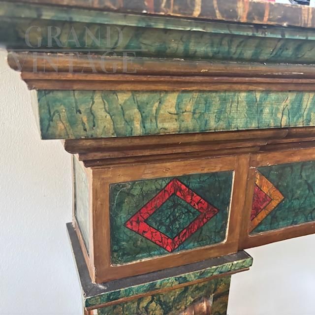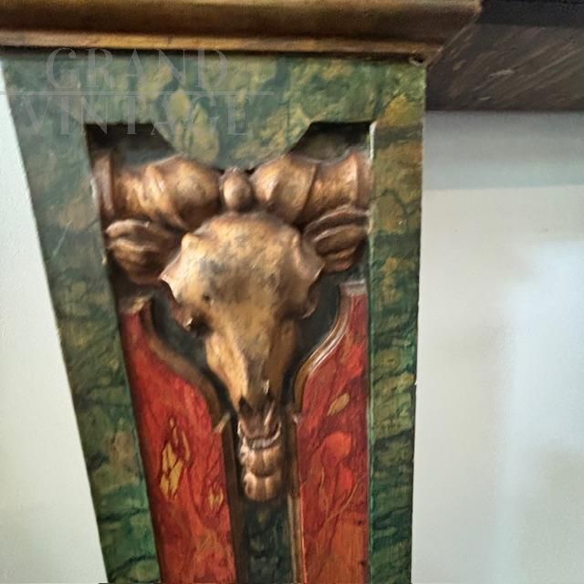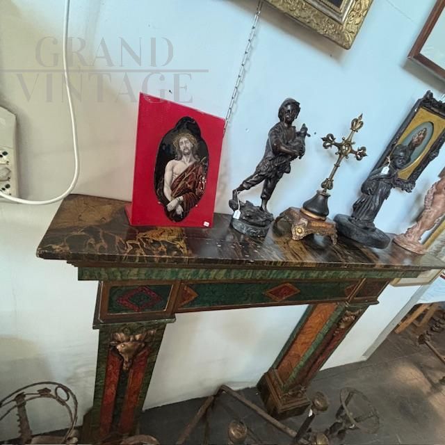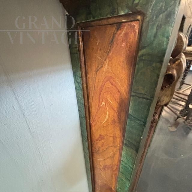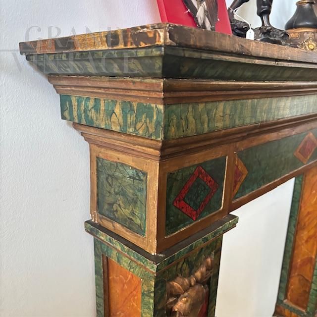 Splendid 19th-century antique fireplace surround in solid polychrome wood, hand-painted with a marble effect. The uprights are carved with gilded goat faces. In very good condition, the fireplace shows minor signs of wear.