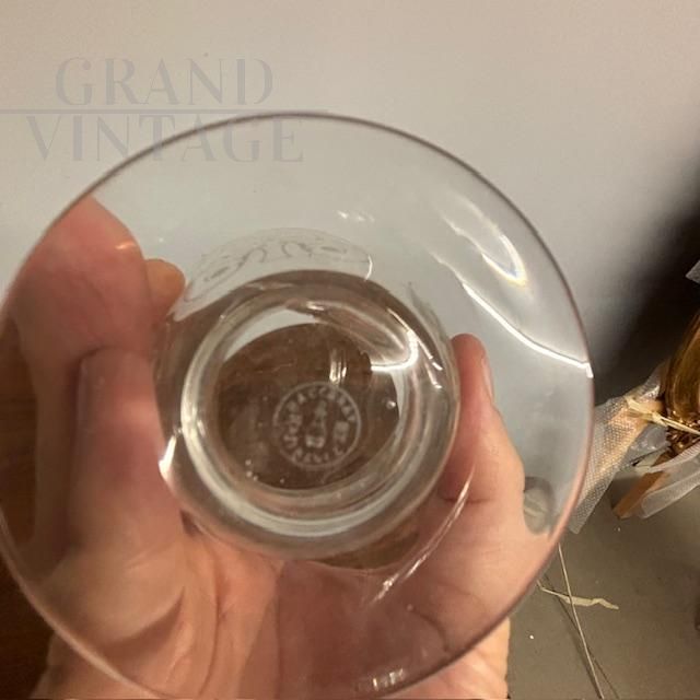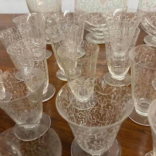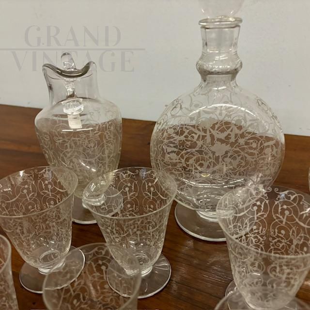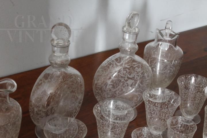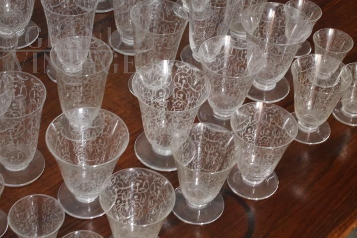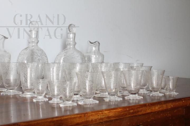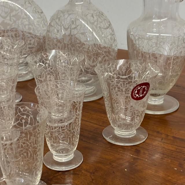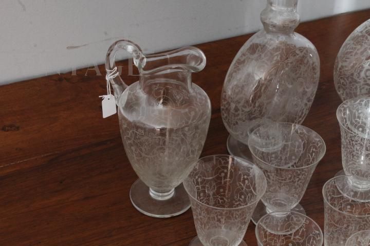 Complete Baccarat set in worked crystal from the late 19th century consisting of four large water glasses, two slightly smaller ones, 10 wine glasses and various liqueur and tasting glasses, + two large carafes and two large liqueur bottles with stoppers. Extraordinary hand engraving. Brand engraved under a glass.