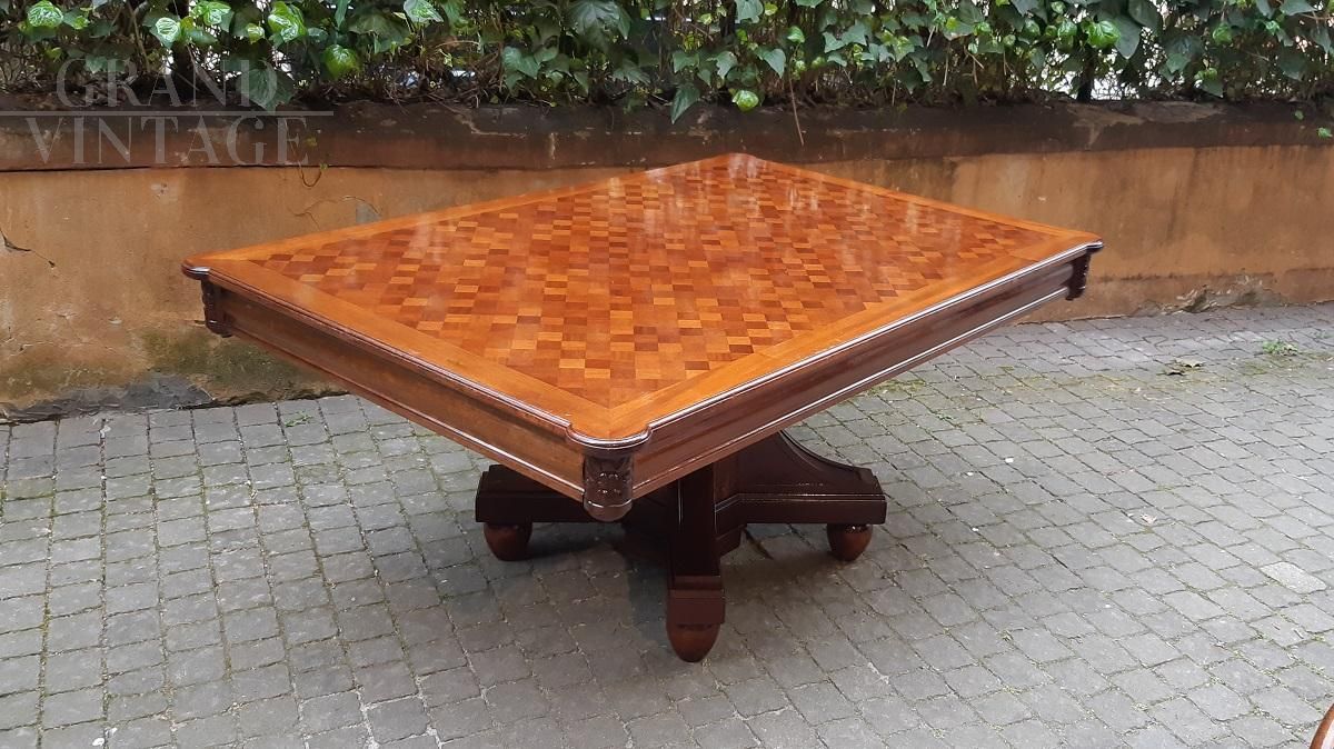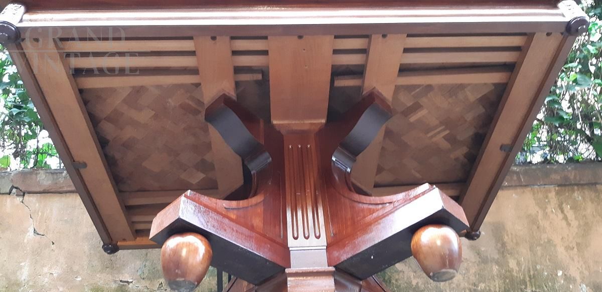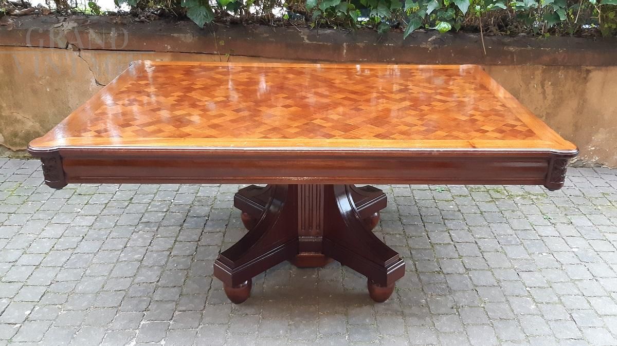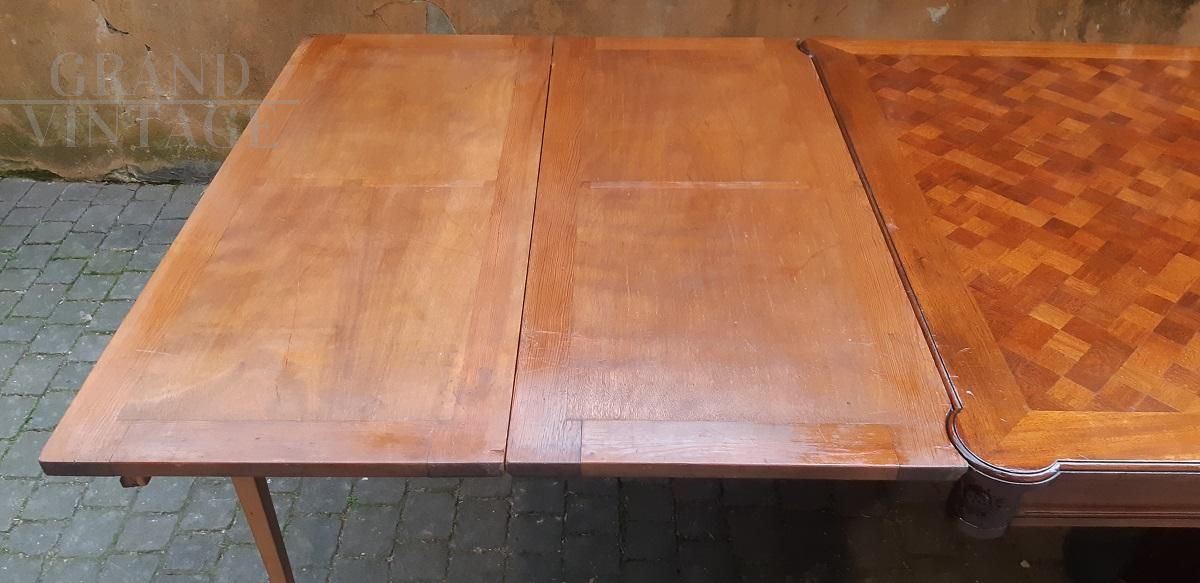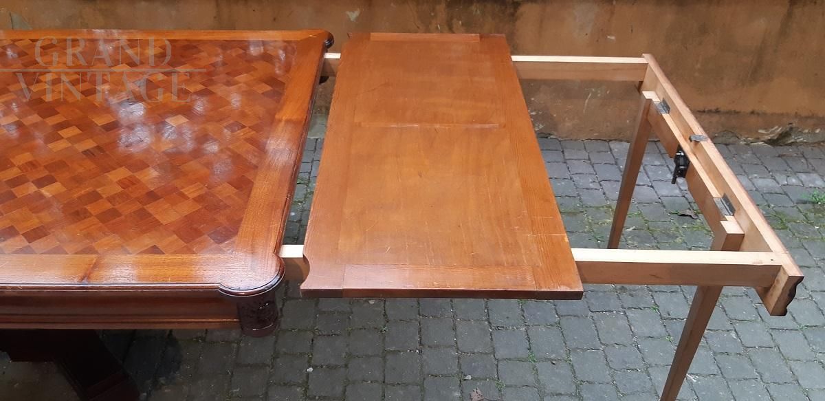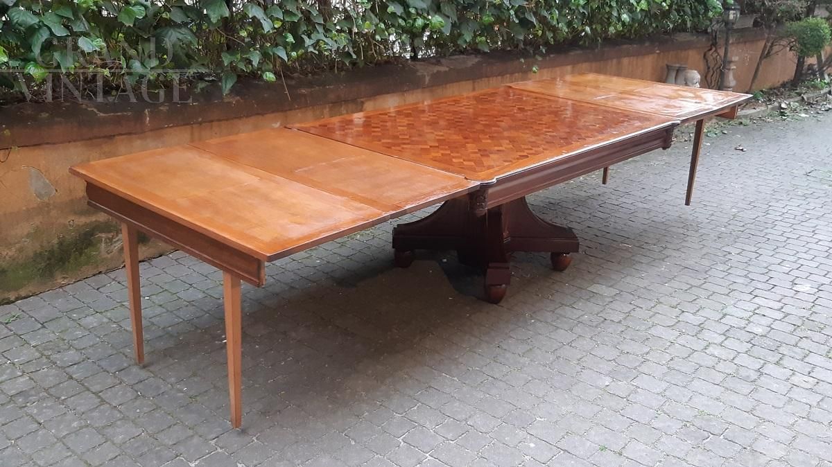 Antique 4 meter extendable Viennese table from the second half of the 19th century, in mahogany wood with central leg, marquetry checked inlad top and rounded corners with floral inlays. Elegant extendable table of nice dimensions, with a central foot. The important, completely "marchetted" top characterizes it, further embellished in the 4 corners where we find floral motifs carved into the solid wood. The large foot expresses strength and stability, the multiple extensions allow it to accommodate over 20 seats.