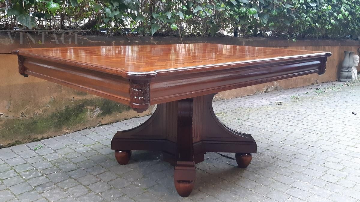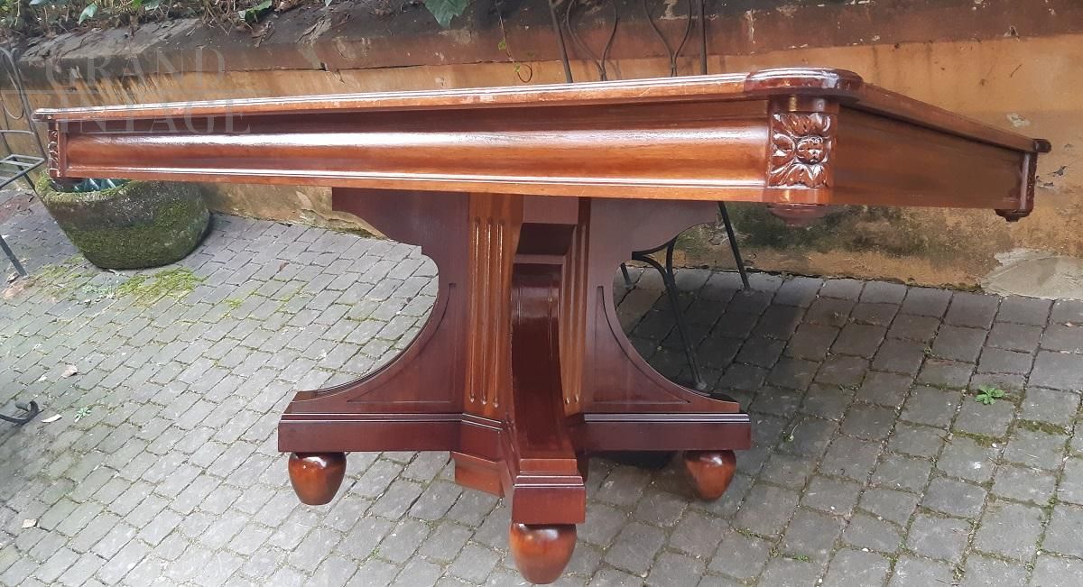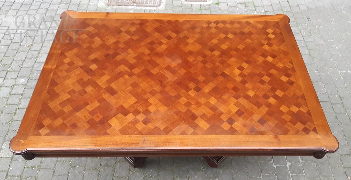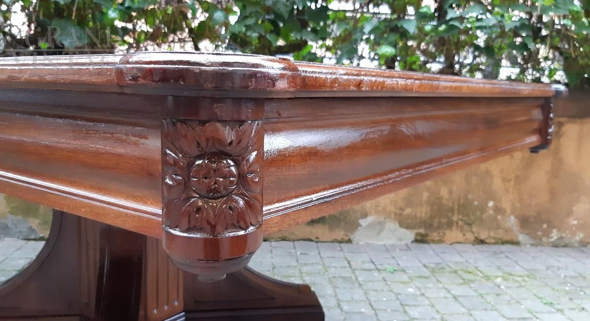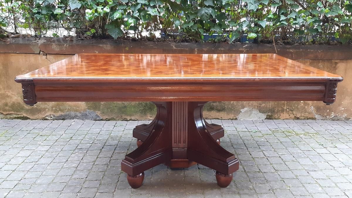 Antique 4 meter extendable Viennese table from the second half of the 19th century, in mahogany wood with central leg, marquetry checked inlad top and rounded corners with floral inlays. Elegant extendable table of nice dimensions, with a central foot. The important, completely "marchetted" top characterizes it, further embellished in the 4 corners where we find floral motifs carved into the solid wood. The large foot expresses strength and stability, the multiple extensions allow it to accommodate over 20 seats.