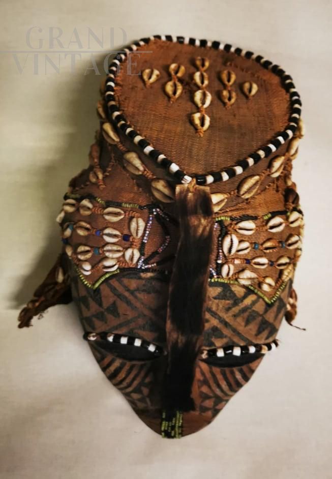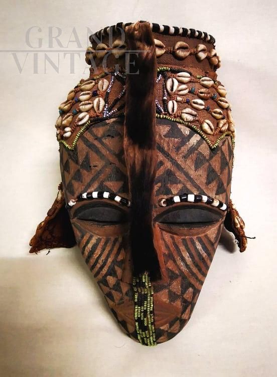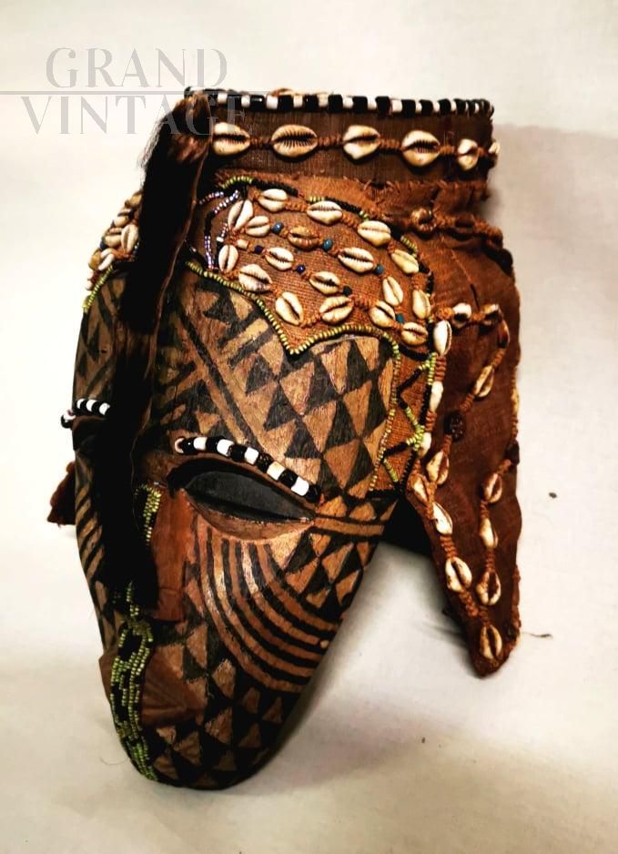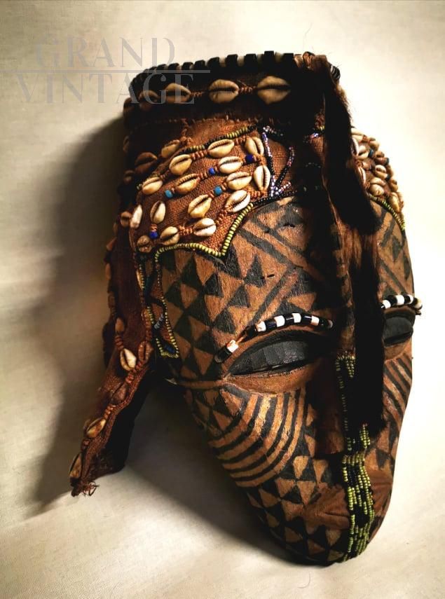 Rare antique African tribal mask in wood, with application of beads and leopard skin, from the first half of the 20th century, from Zaire (now Democratic Republic of the Congo)