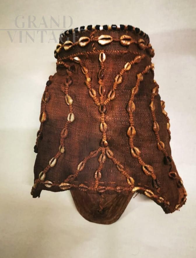 Antique African tribal mask with beads and leopard skin